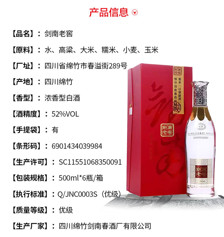 四川绵竹剑南春剑南老窖2006 52度浓香型白酒 整箱500ml*6瓶包邮