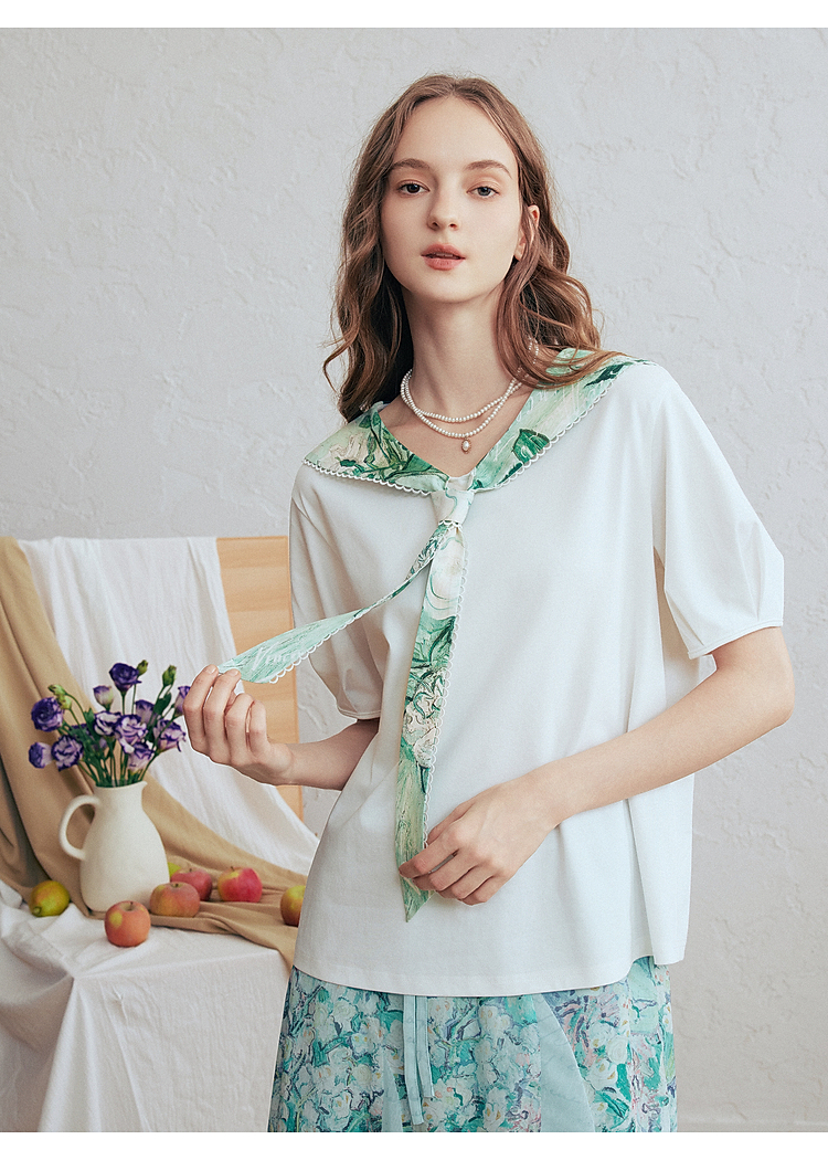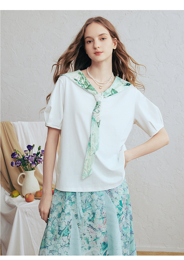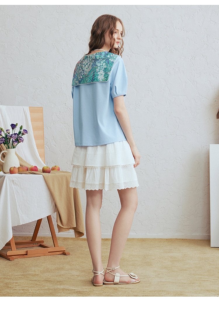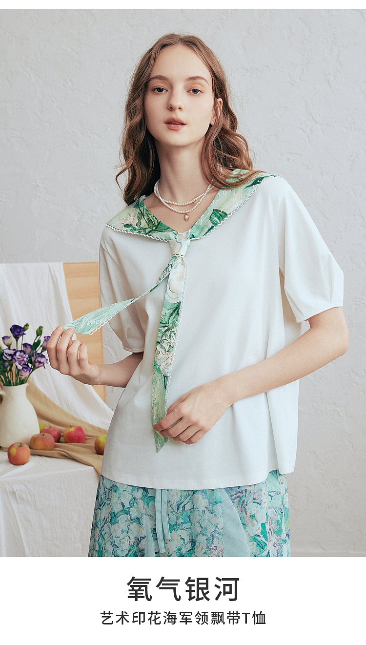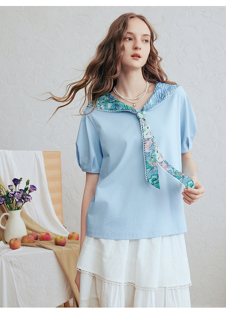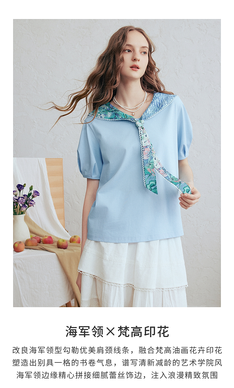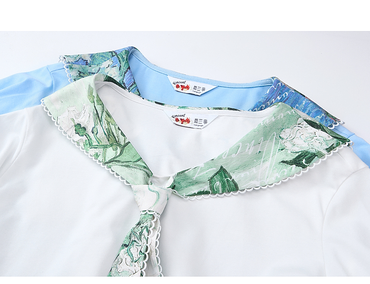 两三事梵高文艺氧气银河2026春季新款印花系带海军领泡泡袖t恤女