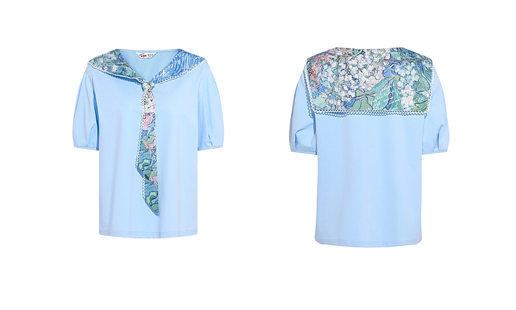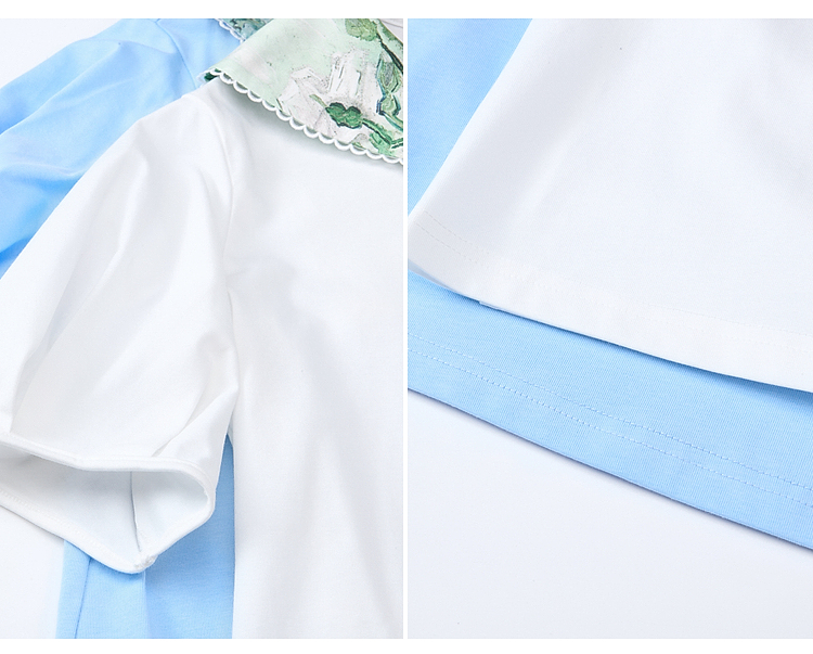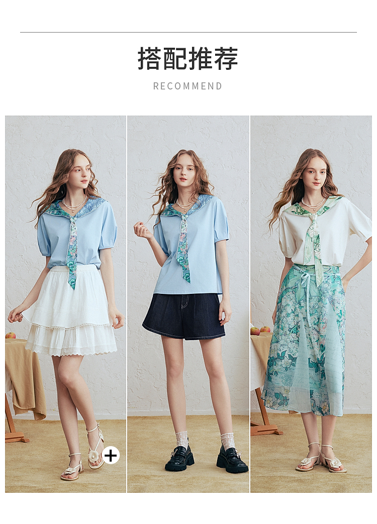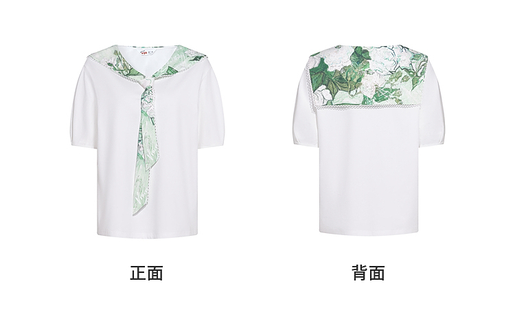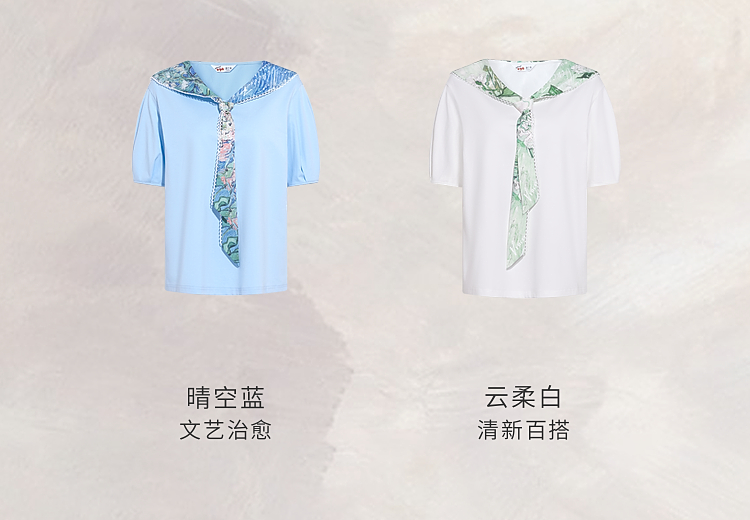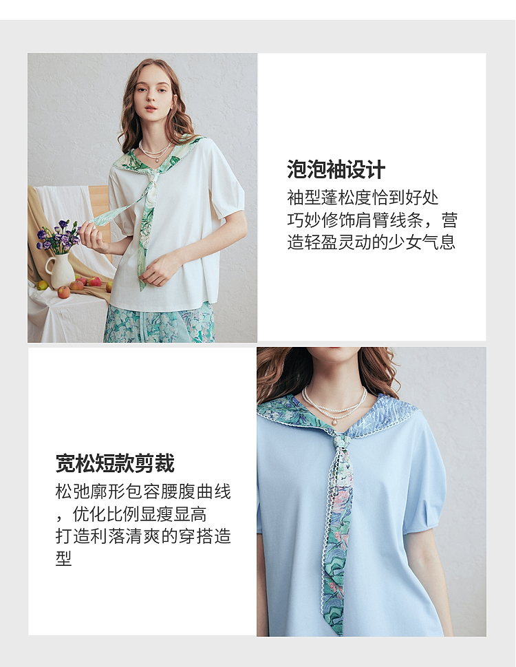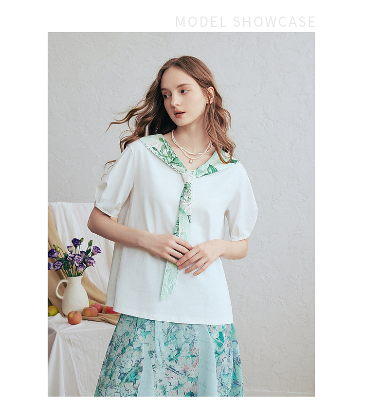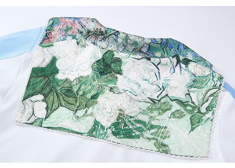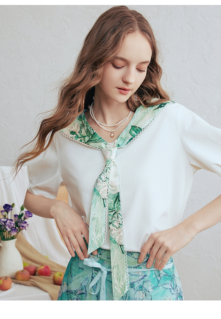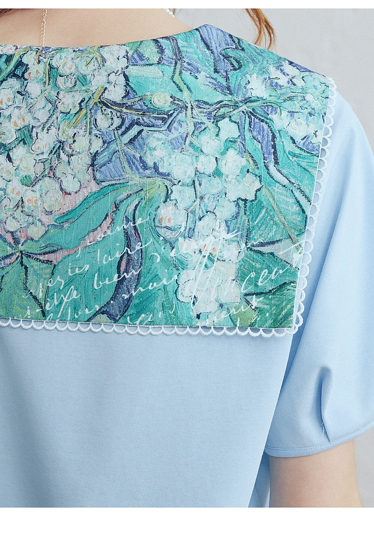 两三事梵高文艺氧气银河2026春季新款印花系带海军领泡泡袖t恤女