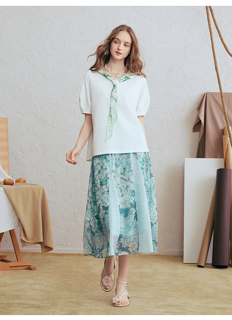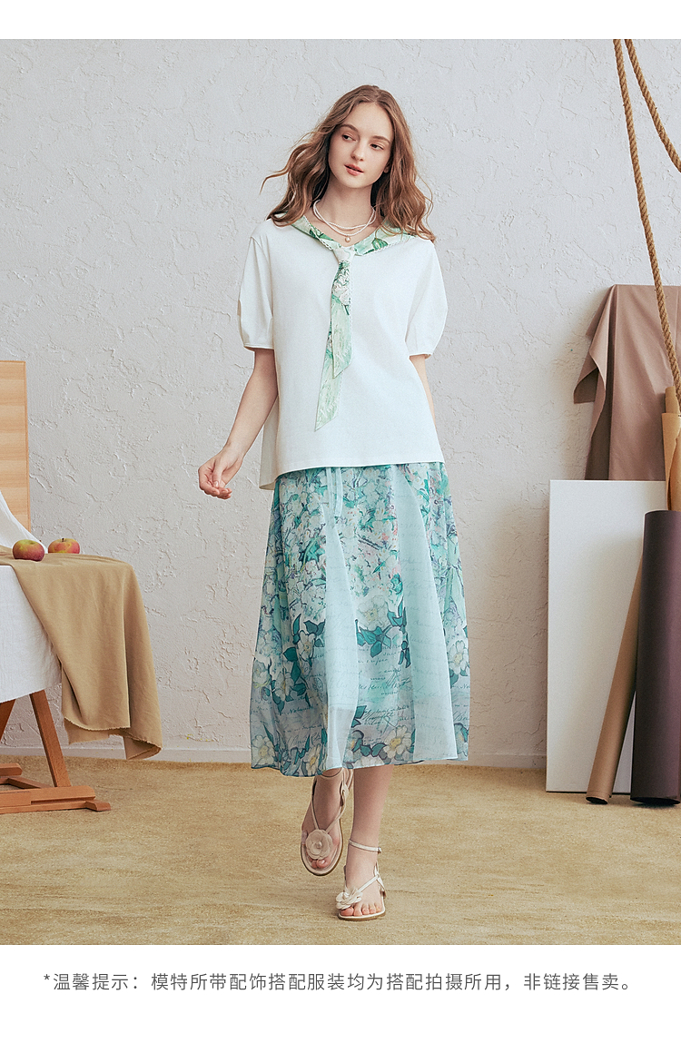 两三事 遁入花境 2025春季新款休闲拼色插肩袖印花刺绣t恤女宽松S25CT444