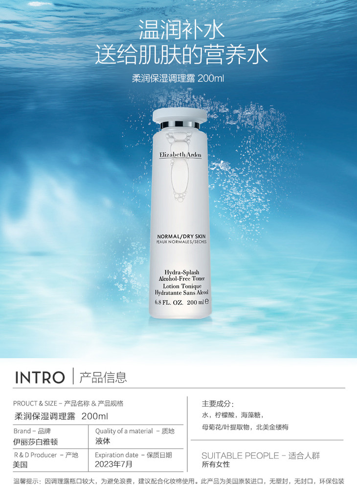伊、丽/莎~白YA顿保湿调理露含玻尿酸和丰富的植物成分,如沙漠植物漏芦糖、海藻精华以及舒缓肌肤的甘菊精华,可为肌肤迅速密集补充水分,并舒缓干燥发YAN的现象。