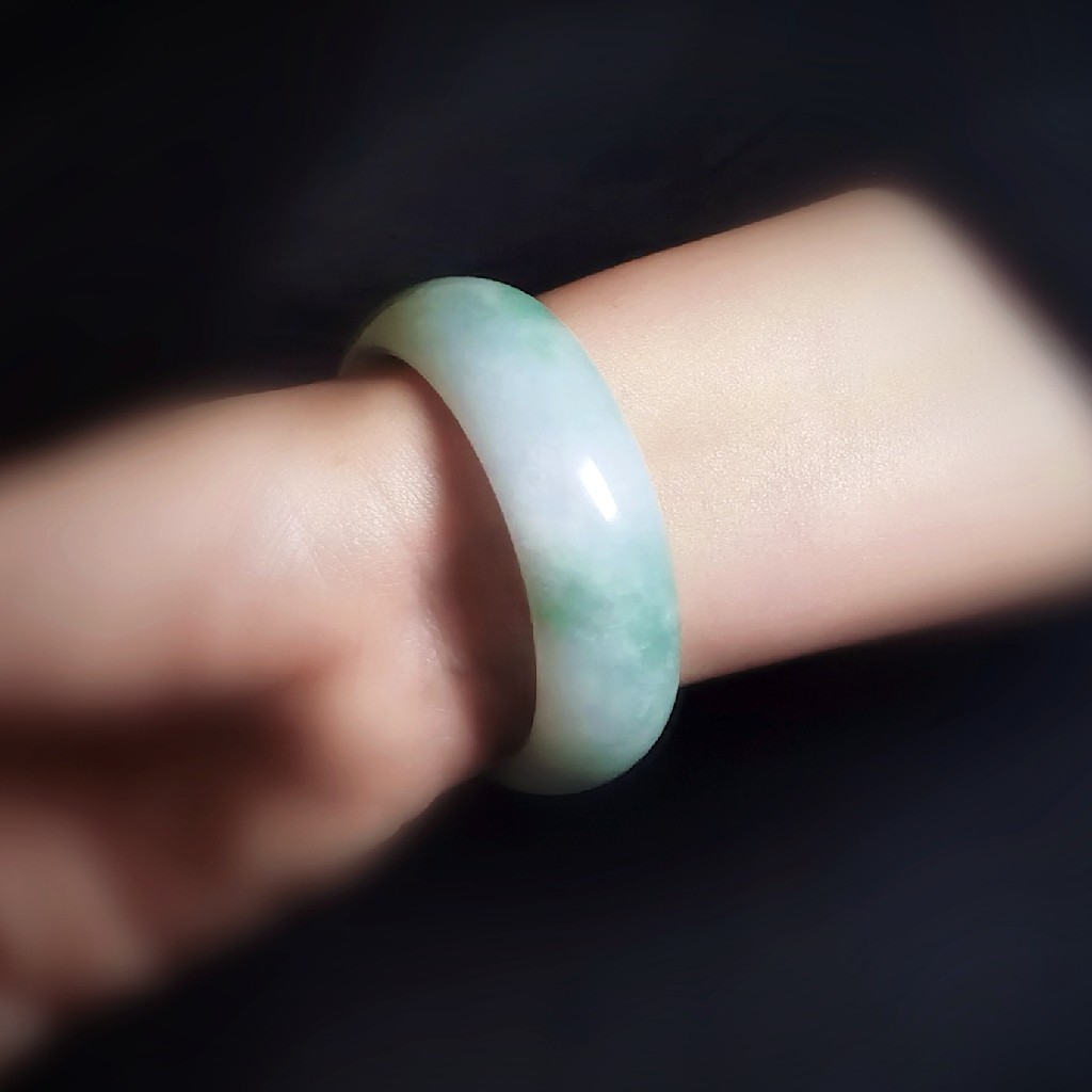 条宽是我的特色,上手后的完美弧度贴合手腕,彰显时尚个性。优美的瓷白色,使我能更好的衬托出清爽淡雅的果绿色,展示出翡翠应有的富贵高级的气质。