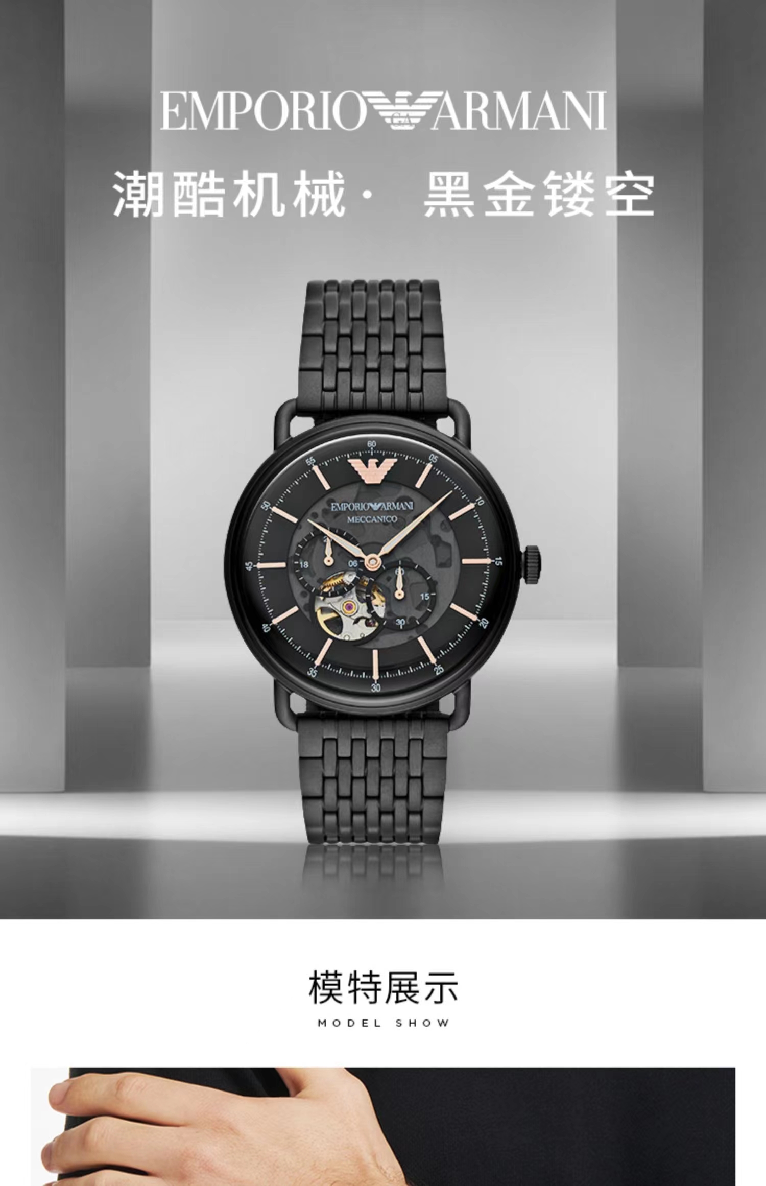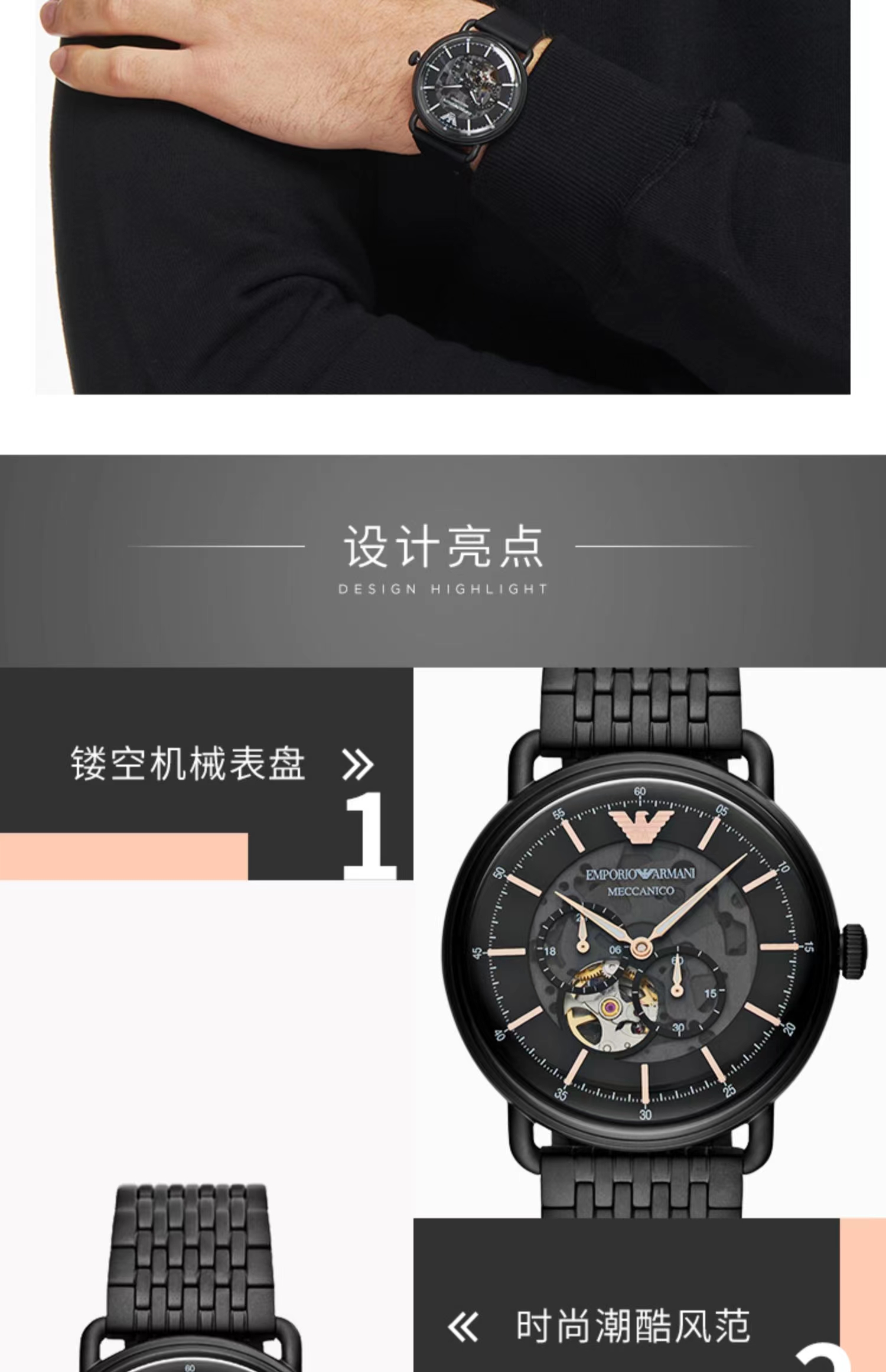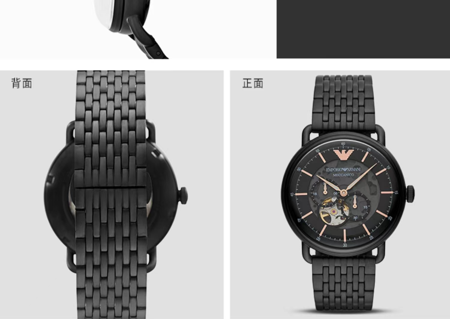 Armani阿玛尼黑武士男士手表 黑色钢带镂空防水男款机械表AR60025