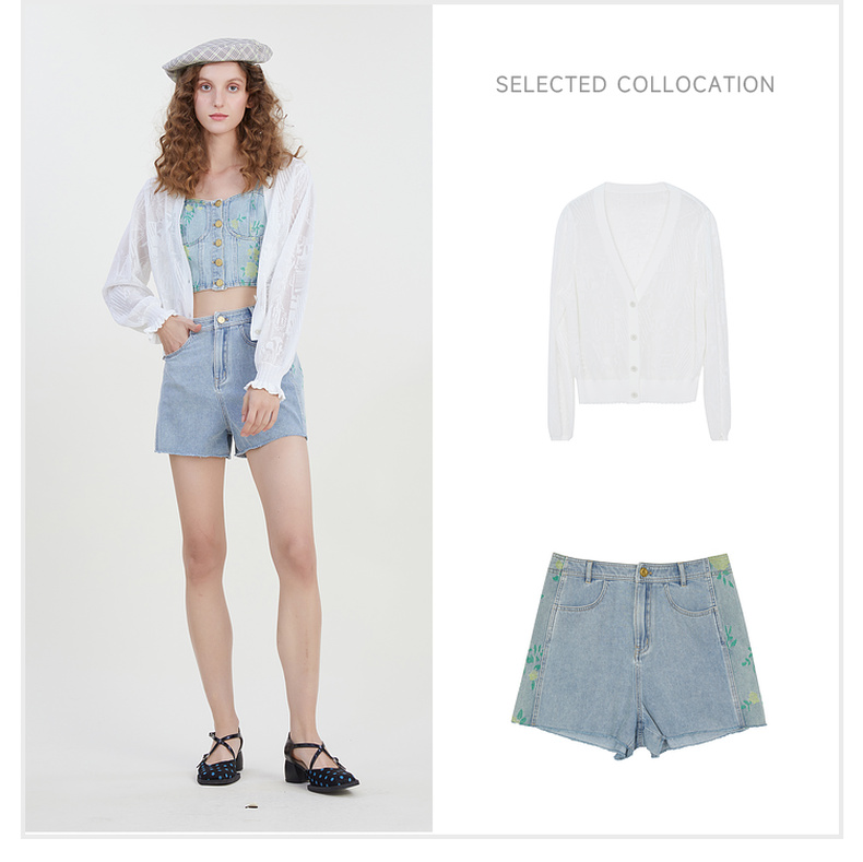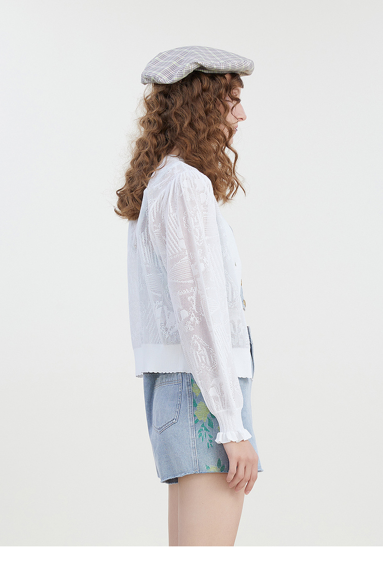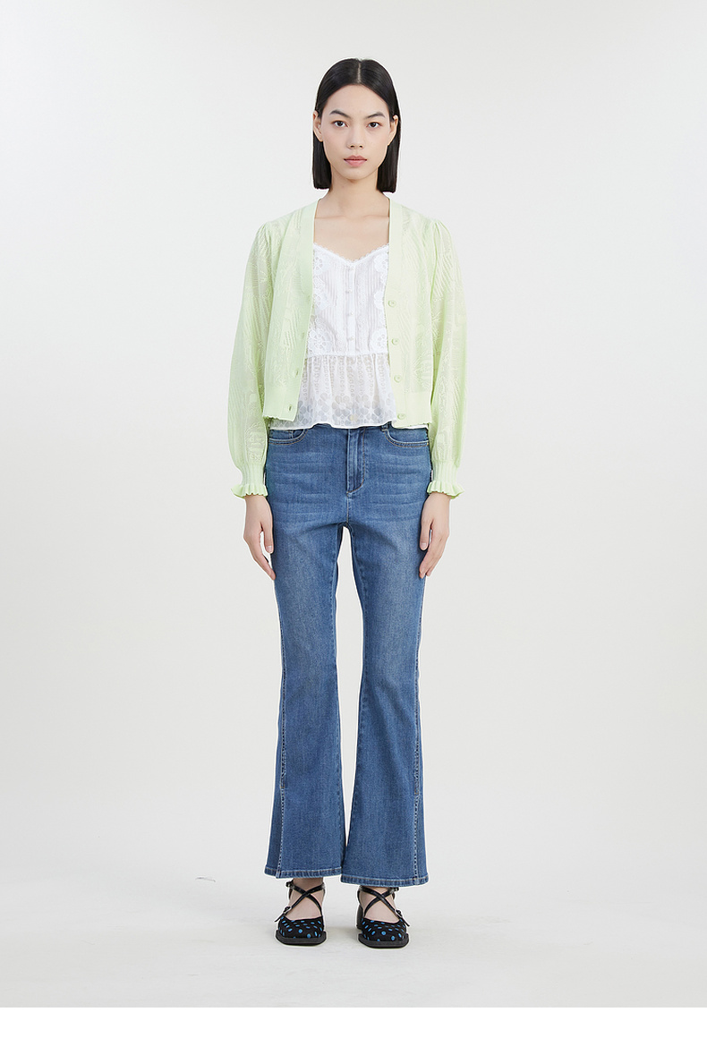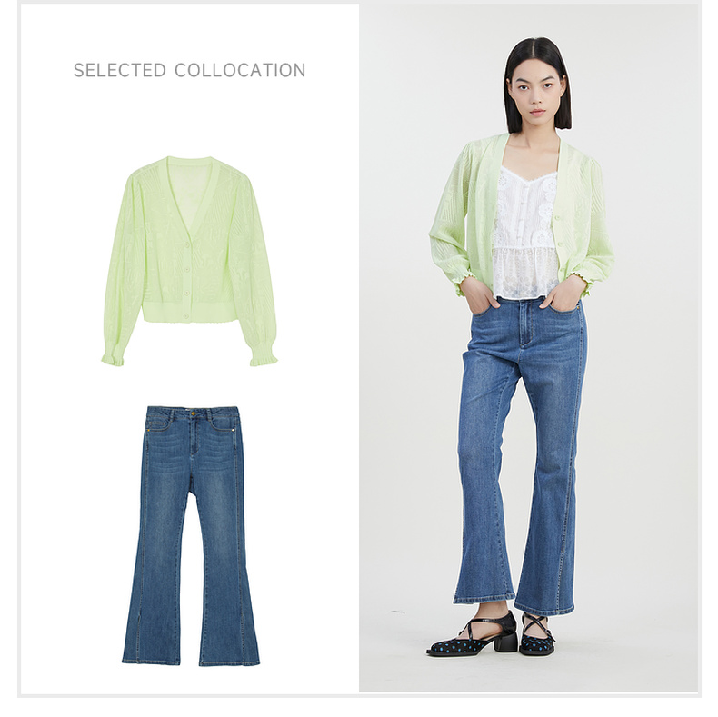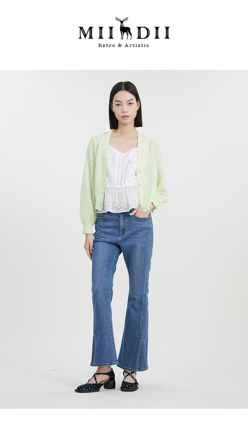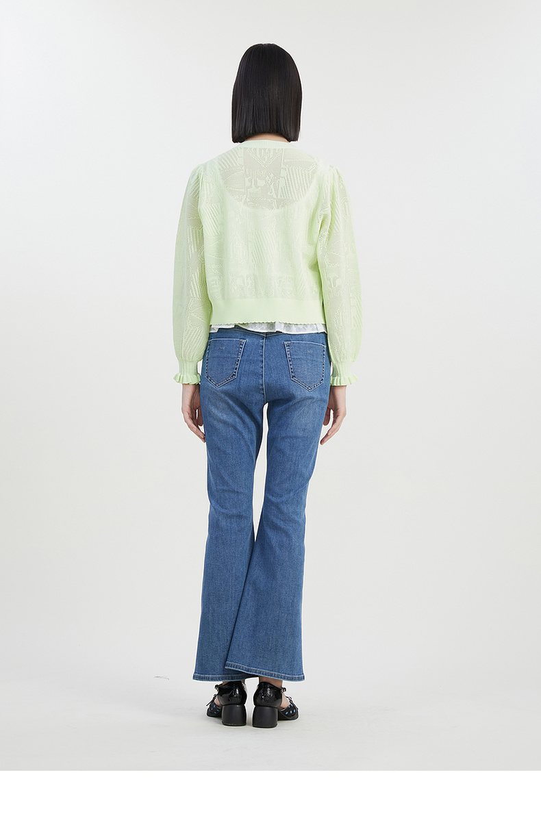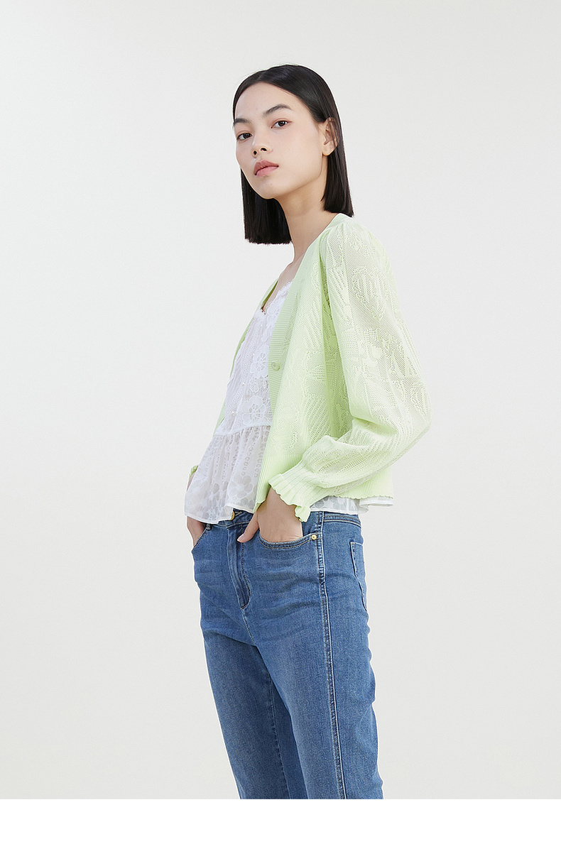 谜底V领针织开衫长袖女2023夏新款简约百搭荷叶袖口毛衫232MZ0871