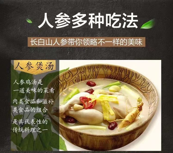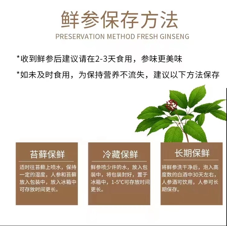 注意:鲜人参运输包装为青苔包装运输,收到货之后第一时间打开,检测质量,可以通风后,把人参表面泥土晾干,用袋子打包放入冰箱冷藏。人参,吃多少洗多少,不要全部洗,洗完之后就没有办法保存了,此保存方式最多保鲜15天以内。