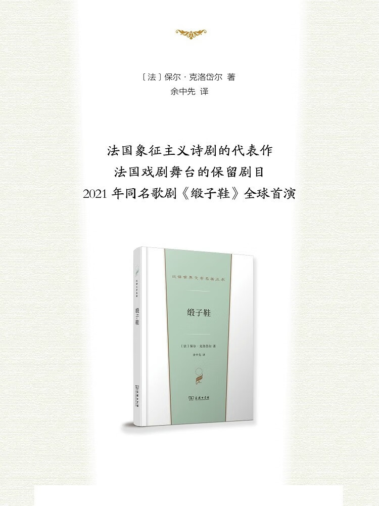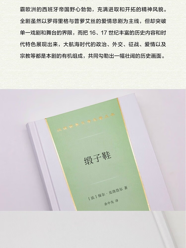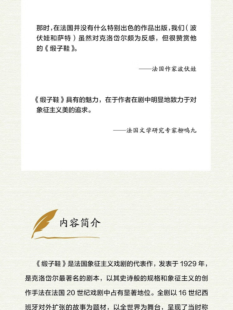 《缎子鞋》是法国象征主义戏剧的代表作,发表于1929年,是克洛岱尔著名的剧本,以其史诗般的规格和象征主义的创作手法在法国20世纪戏剧中占有显著地位。全剧以16世纪西班牙对外扩张的故事为题材,以全世界为舞台,呈现了当时称霸欧洲的西班牙帝国野心勃勃,充满进取和开拓的精神风貌。全剧虽然以罗得里格与普萝艾丝的爱情悲剧为主线,但却突破单一戏剧和舞台的界限,而把16、17世纪丰富的历史内容和时代特色展现出来,大航海时代的政治、外交、征战、爱情以及宗教等都是本剧的有机组成,共同勾勒出一幅壮阔的历史画面。
