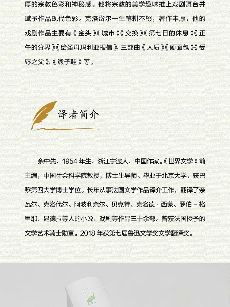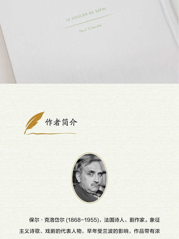 保尔•克洛岱尔(1868-1955),法国诗人、剧作家。象征主义诗歌、戏剧的代表人物,早年受兰波的影响,作品带有浓厚的宗教色彩和神秘感。他将宗教的美学趣味推上戏剧舞台并赋予作品现代色彩。克洛岱尔一生笔耕不辍,著作丰厚,他的戏剧作品主要有《金头》《城市》《交换》《第七日的休息》《正午的分界》《给圣母玛利亚报信》,三部曲《人质》《硬面包》《受辱之父》,《缎子鞋》等。