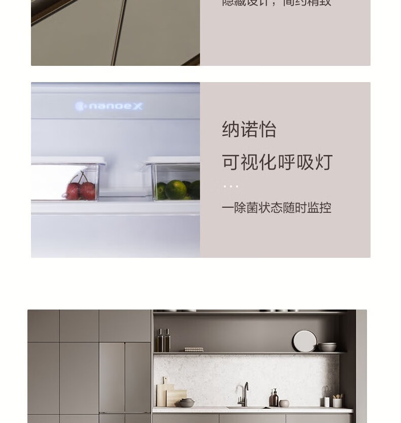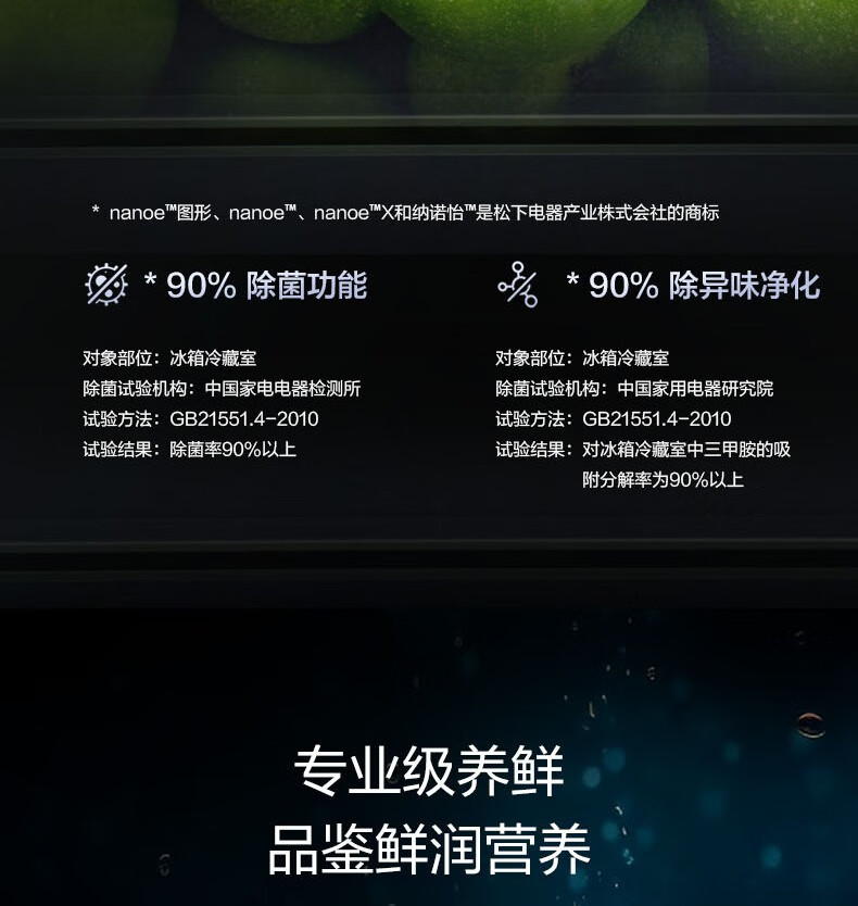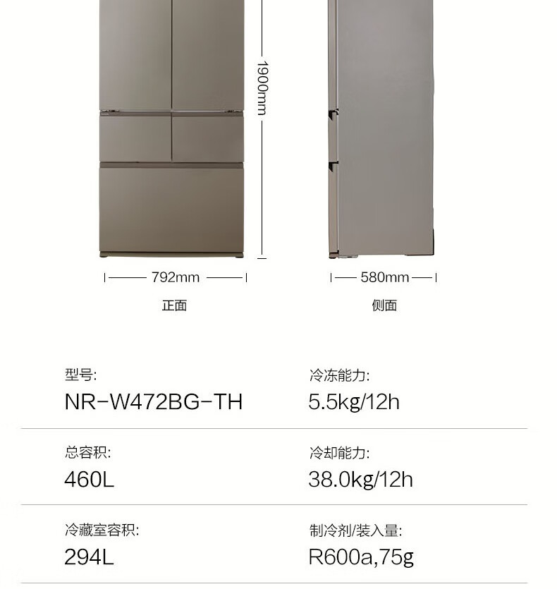 松下(Panasonic)460L零嵌多门纳诺怡X除菌净味 微冻保鲜冰箱 双系统双循环NR-W472BG-TH