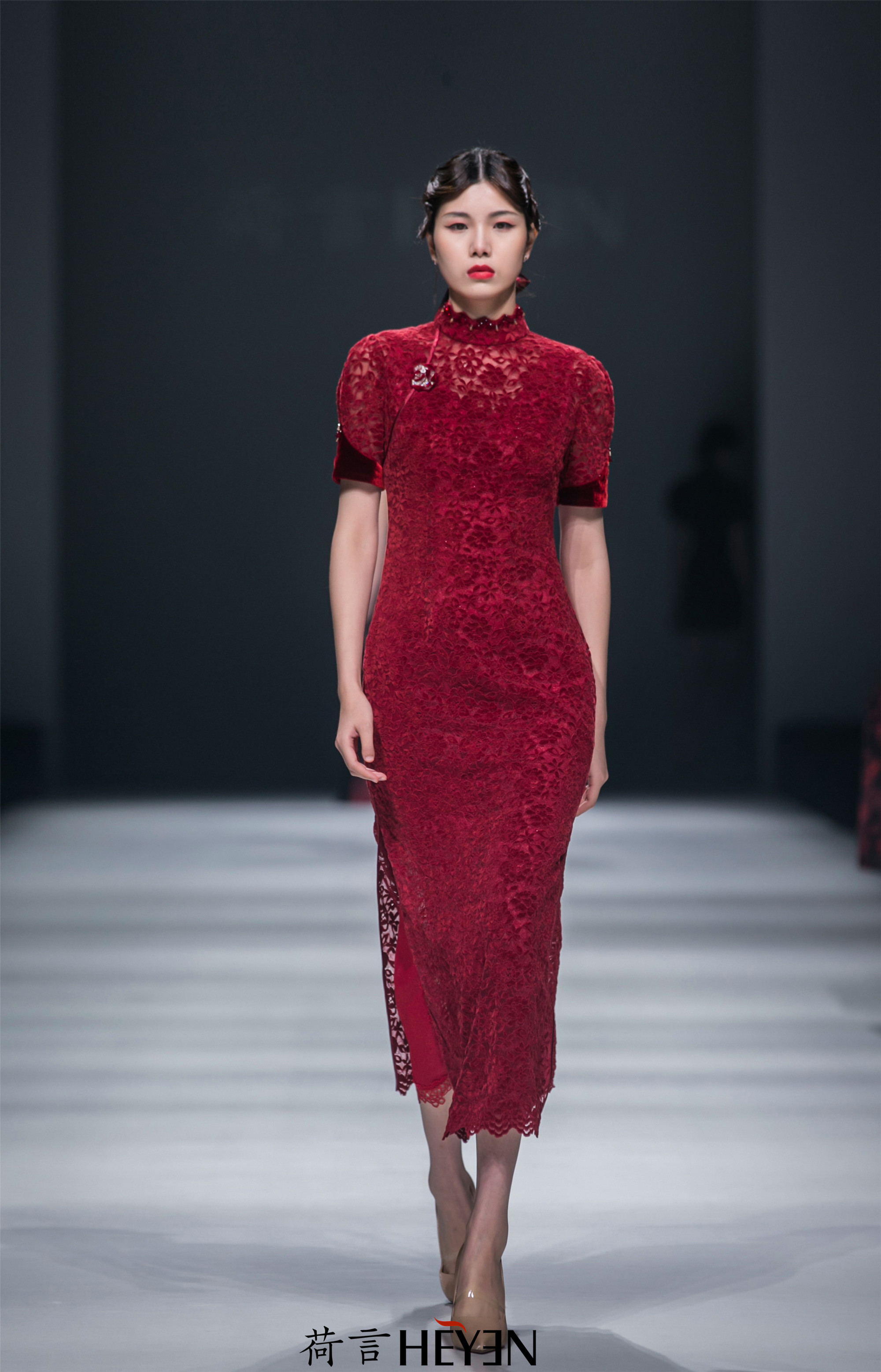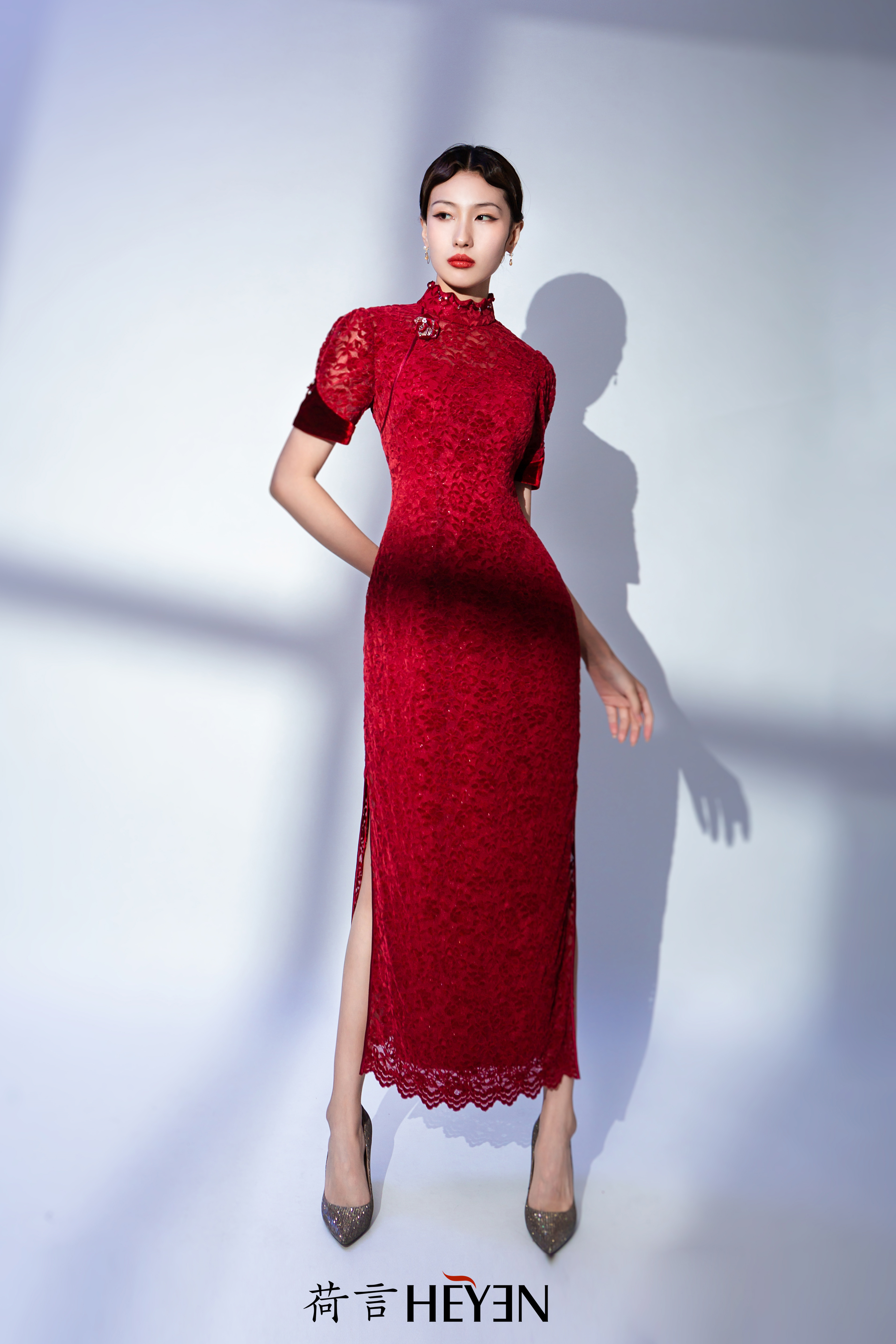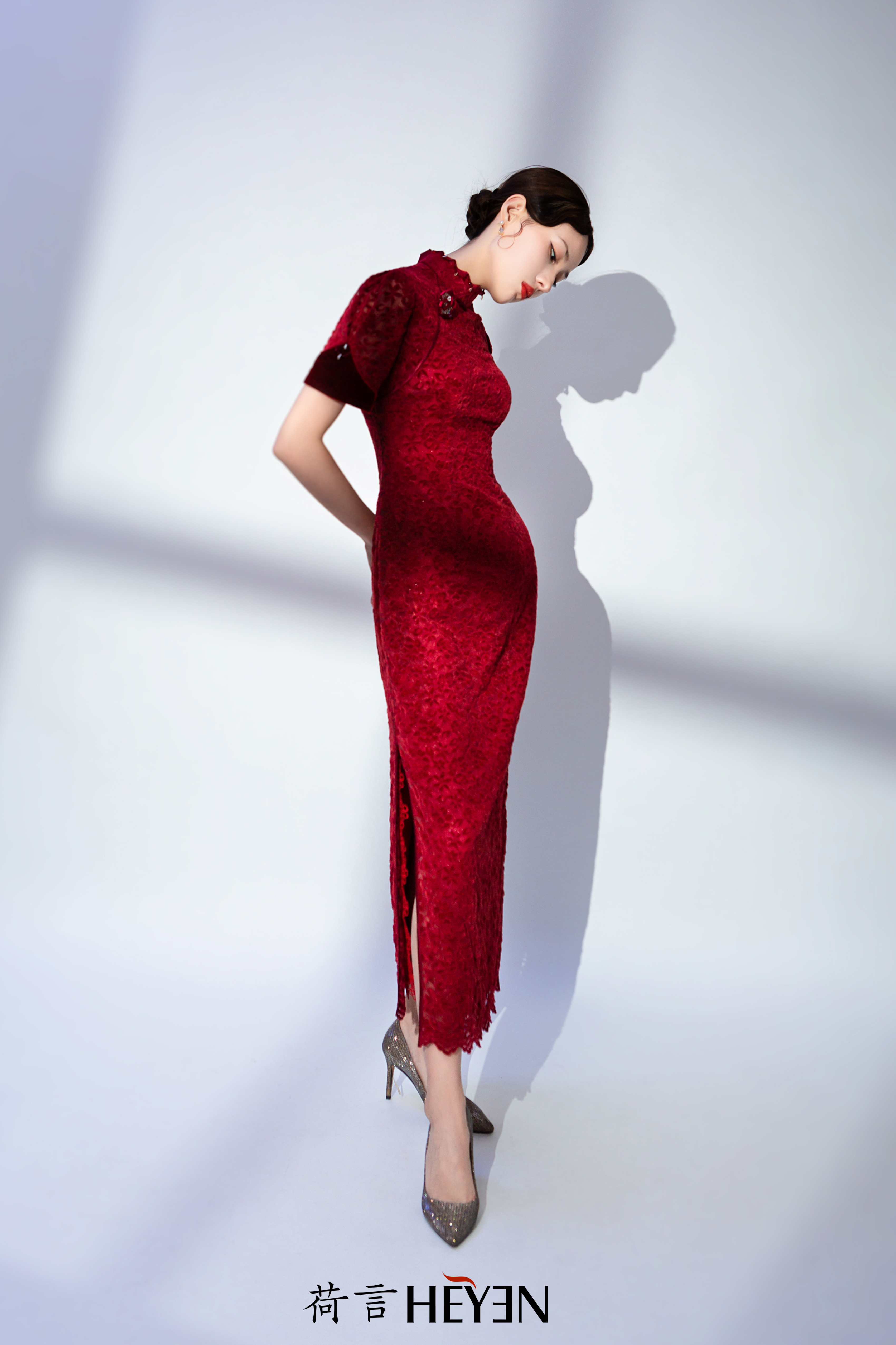荷言HEYEN 画楼深 红色植绒镂空蕾丝+精致玫瑰盘扣胸针+别致月牙领