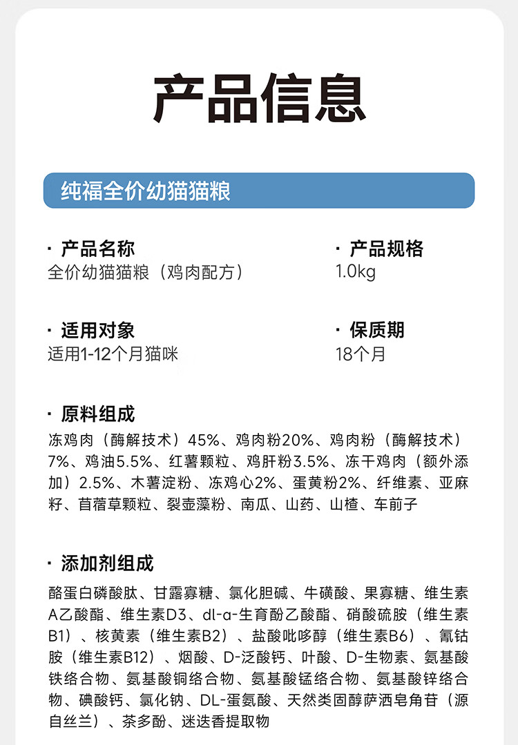 纯福 酶解全价幼猫粮(鸡肉配方)1kg