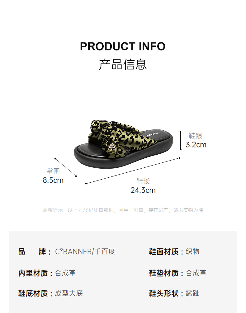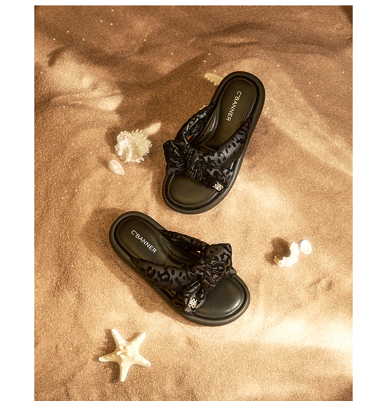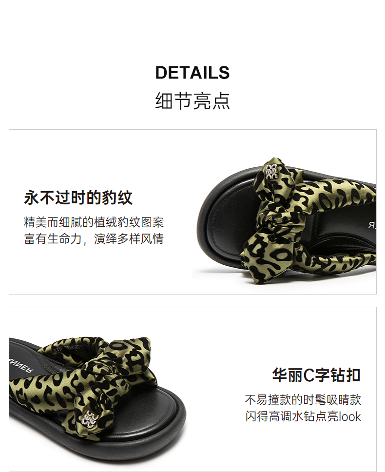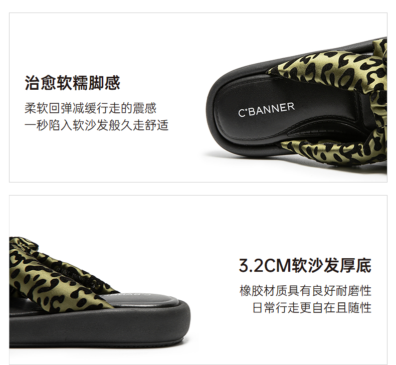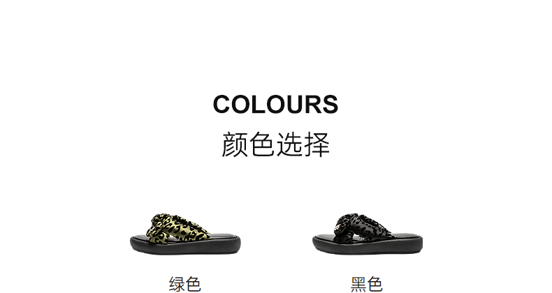 千百度豹纹平底一字拖女款厚底面包露趾外穿凉拖鞋A25381004