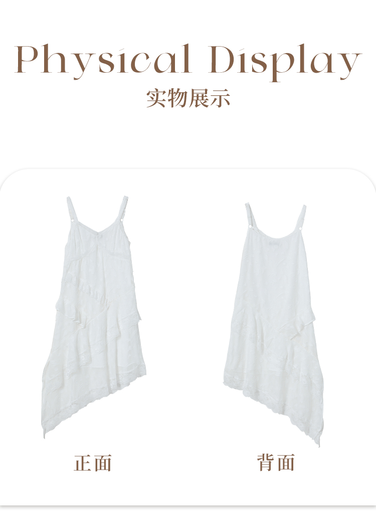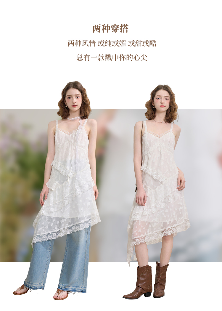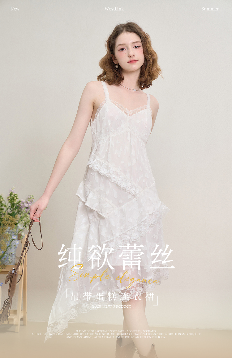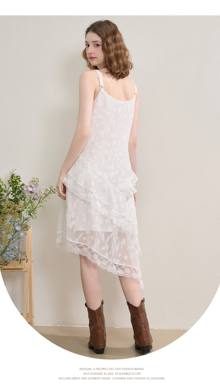 西遇蕾丝花边V领吊带裙女夏季荷叶边不规则裙摆连衣裙V1550965