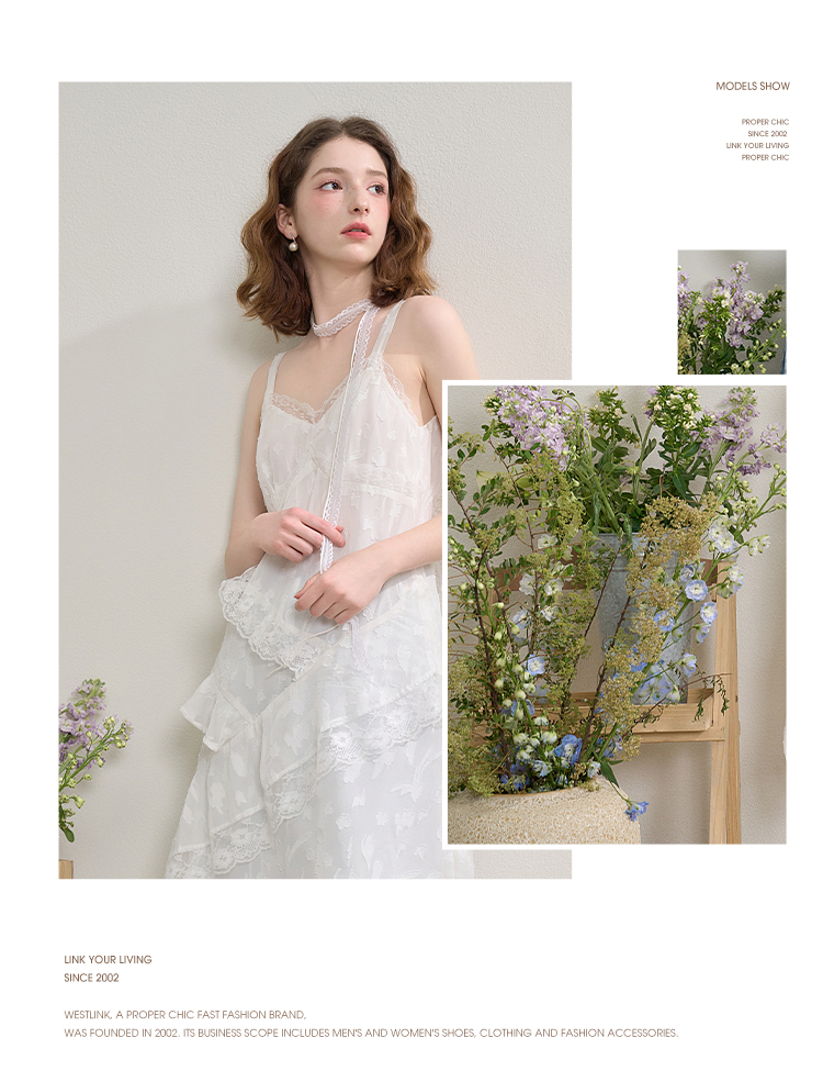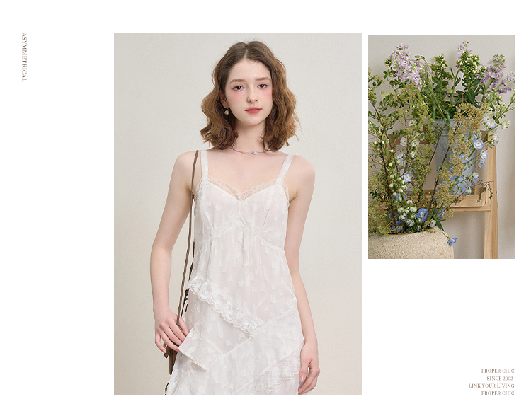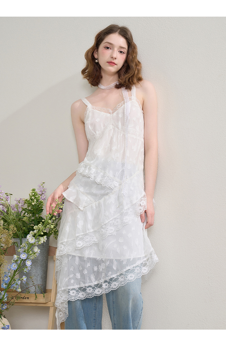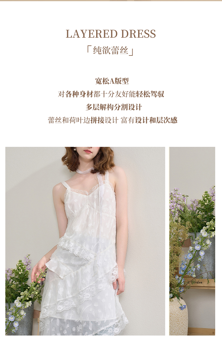 西遇蕾丝花边V领吊带裙女夏季荷叶边不规则裙摆连衣裙V1550965