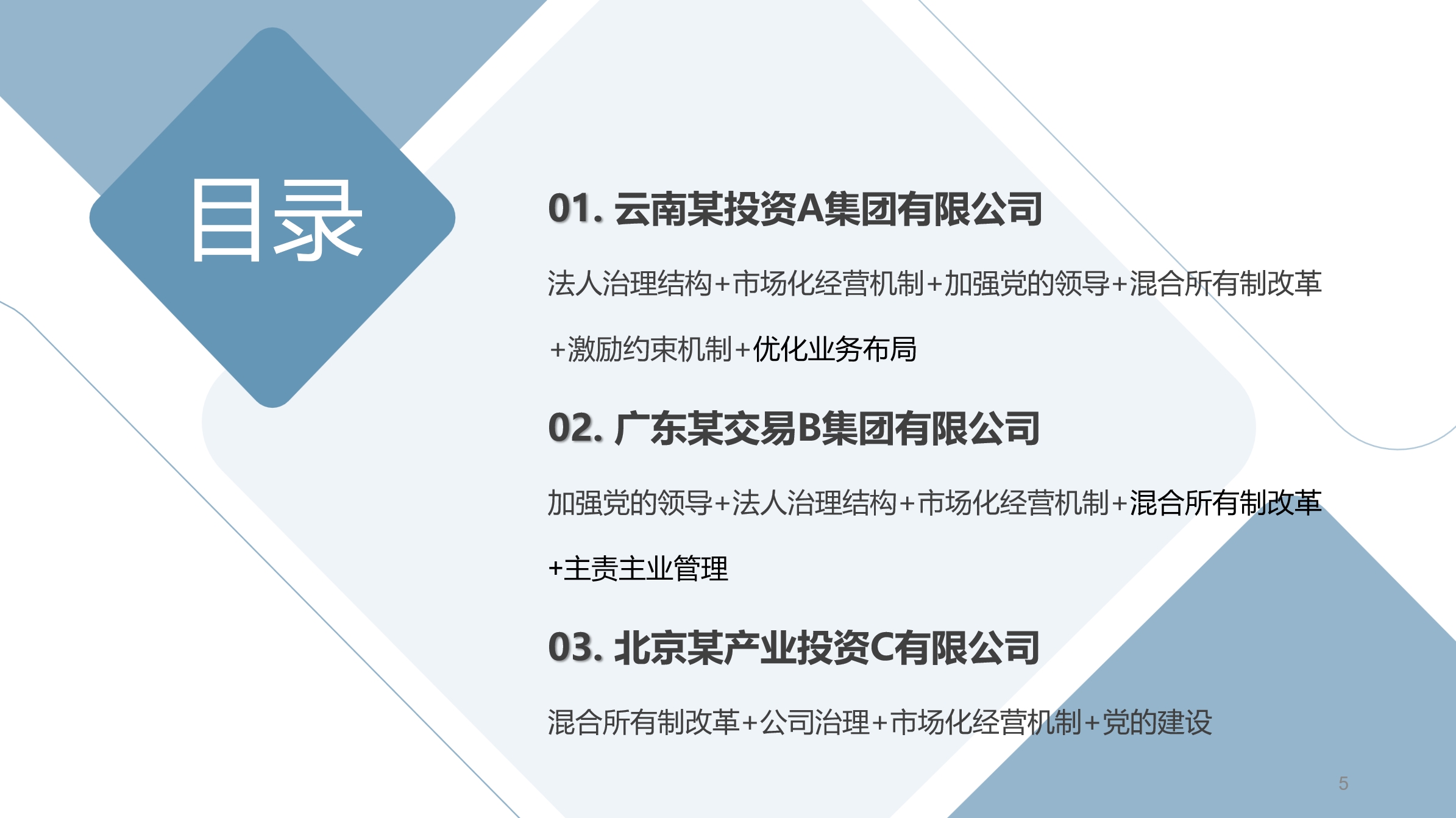 从改革方法看,云南某投资A集团有限公司的改革涉及法人治理结构、市场化经营机制、加强党的领导、混合所有制改革、激励约束机制以及优化业务布局等方面;广东某交易B集团有限公司的改革涉及加强党的领导、法人治理结构、市场化经营机制、混合所有制改革、主责主业管理等方面;北京某产业投资C有限公司的改革主要包括混合所有制改革、公司治理、市场化经营机制、党的建设等方面。