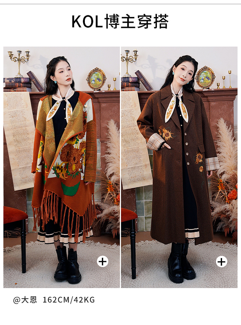 【暖冬内购】两三事梵高文艺莱茵河畔2025秋冬款印花拼接拼色海军领毛呢外套女