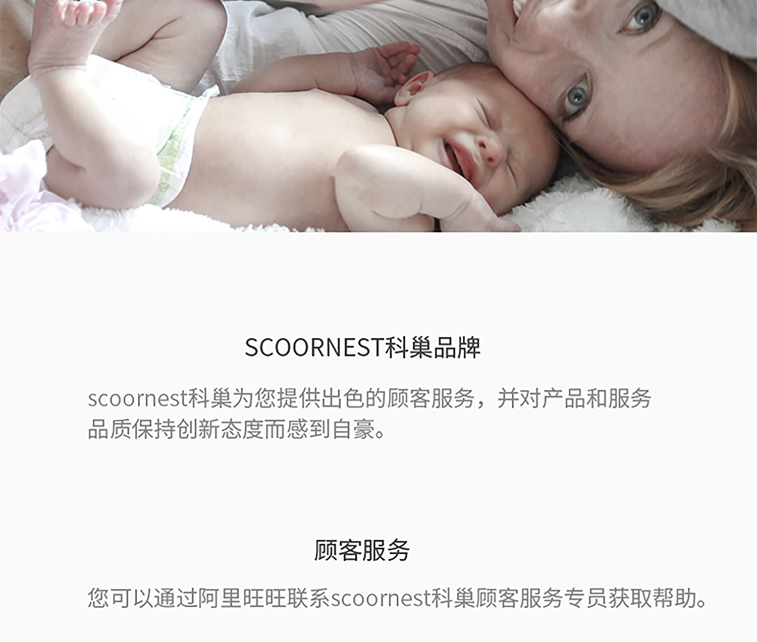 - Scoornest始终秉承给每一位宝宝送去科学的、关心的、创新的成长体验,通过提供商品和服务,使顾客形成守护、发展、巩固这种弥足珍贵的亲情的爱。