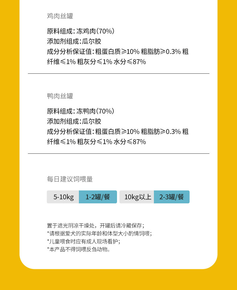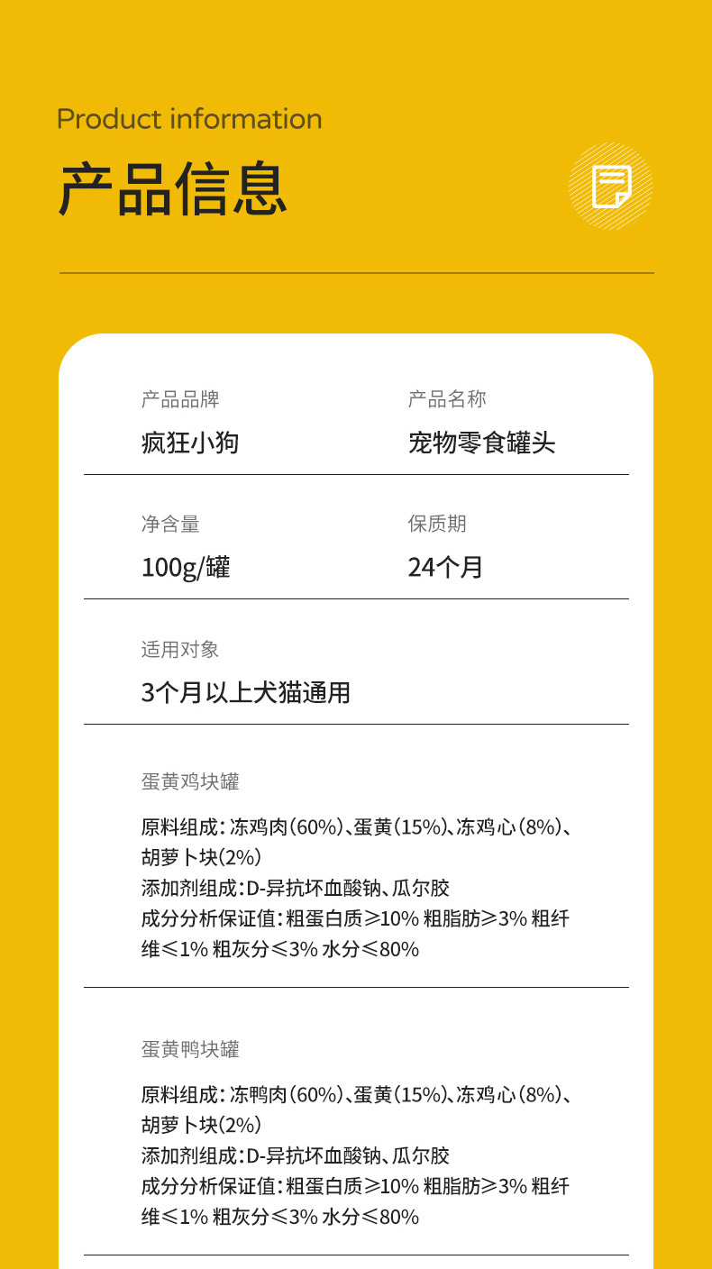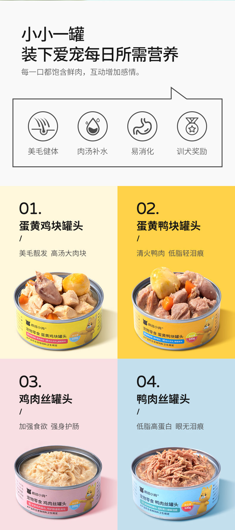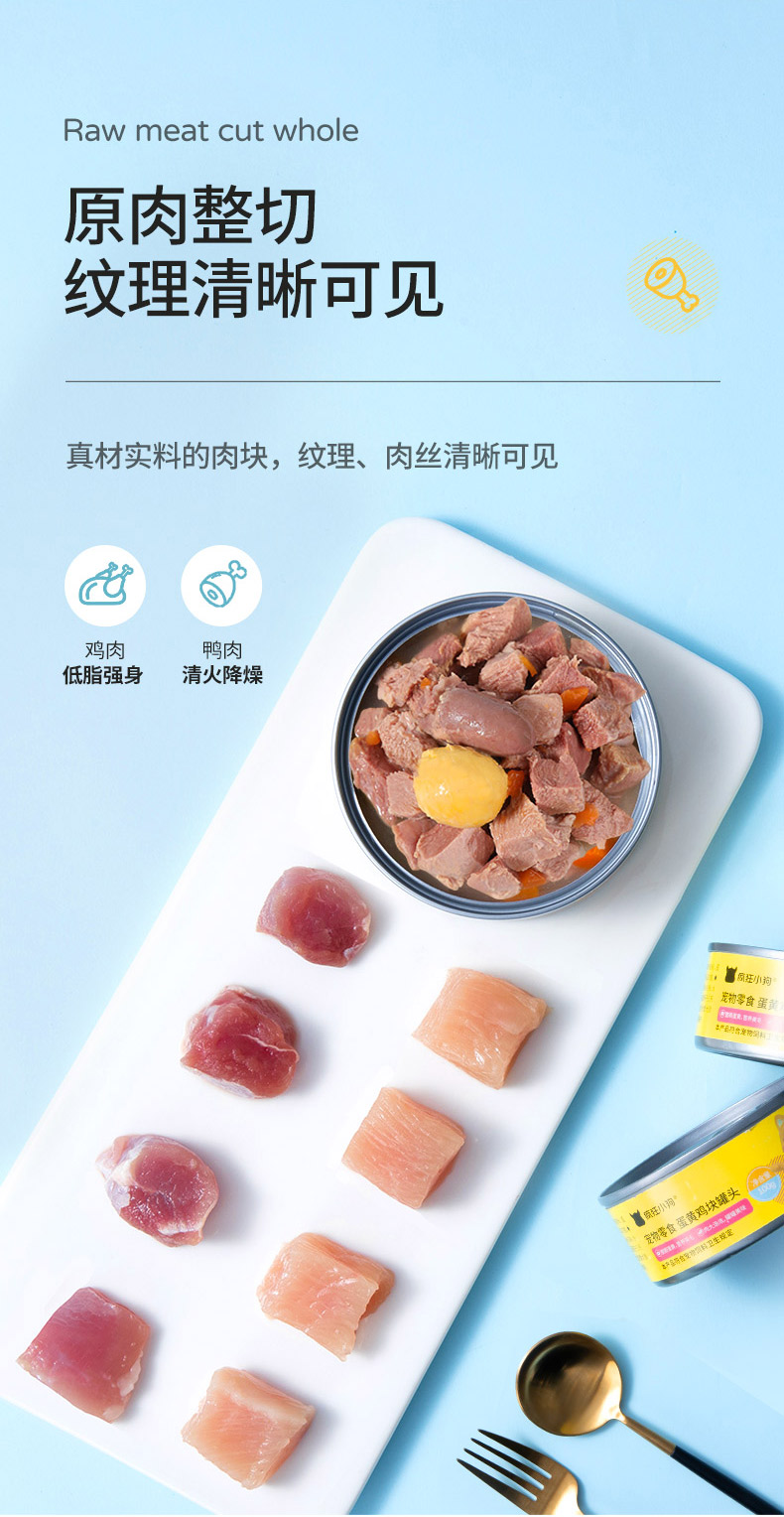 | 食品口味: 蛋黄鸡块100g*6罐【美毛靓发 高汤大肉块】 蛋黄鸭块100g*6罐【清火鸭肉 低脂轻泪痕】 鸡肉丝100g*6罐【加强食欲 强身护肠】 鸭肉丝100g*6罐【低脂高蛋白 眼无泪痕】 | 适用对象: 通用 |