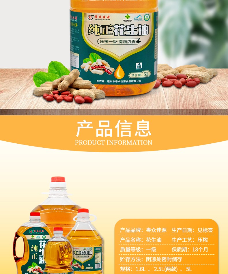 【粤众佳源】花生油 (浓香、压榨级)2.5L