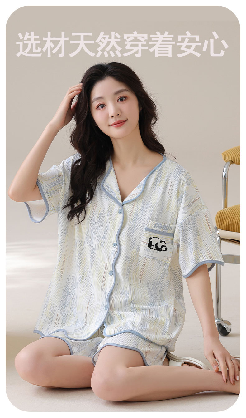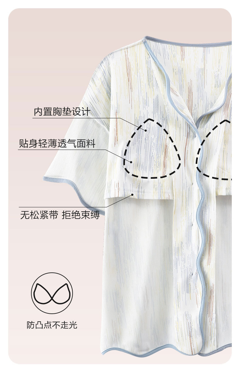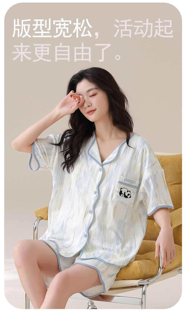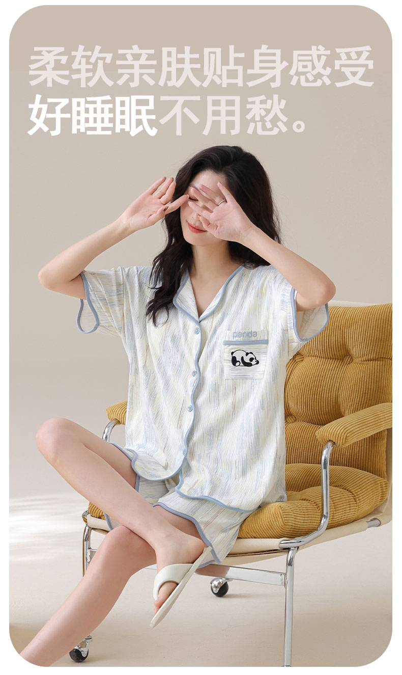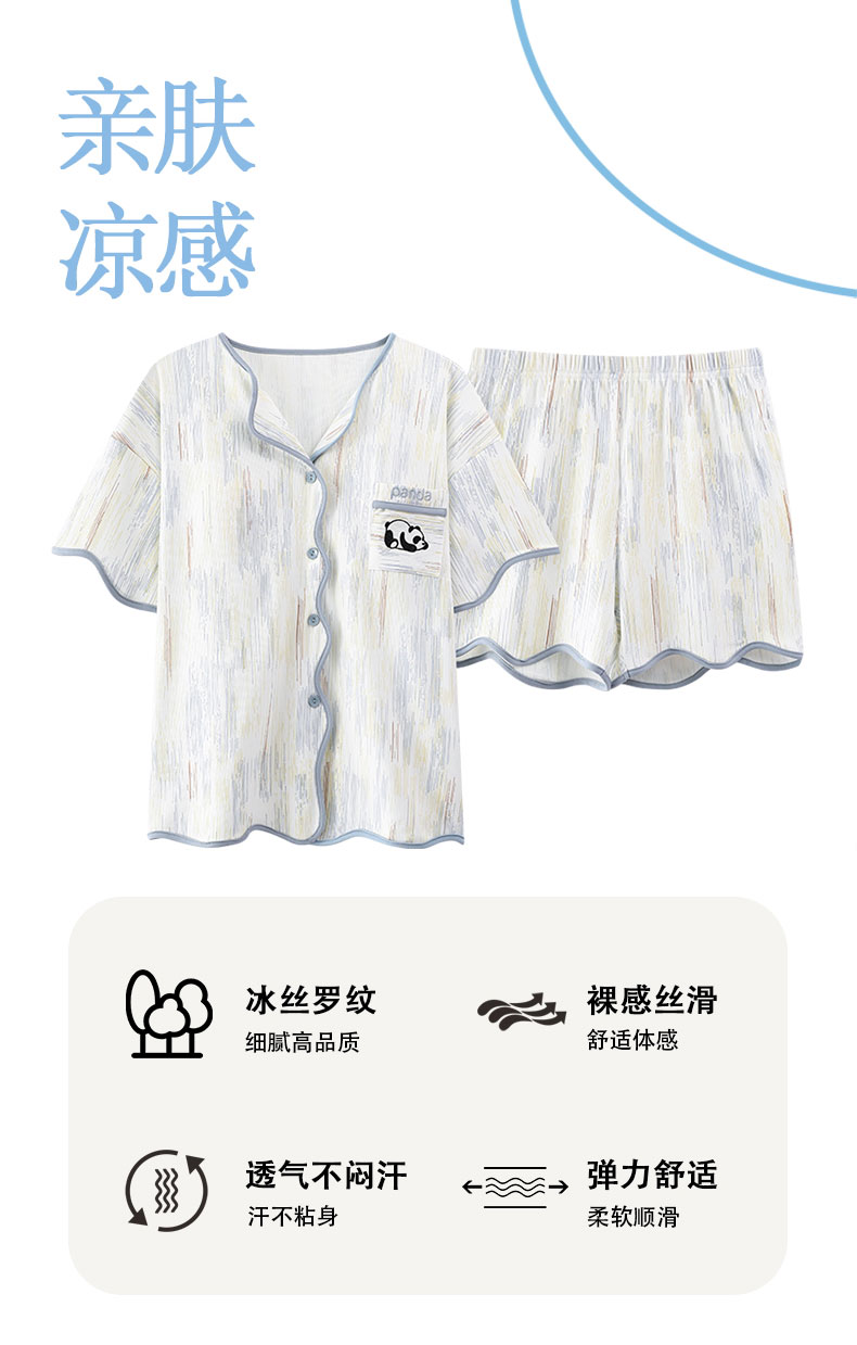 自然醒香韵冰丝睡衣女夏季(带胸垫)开衫短袖短裤套装女家居服可外穿QH