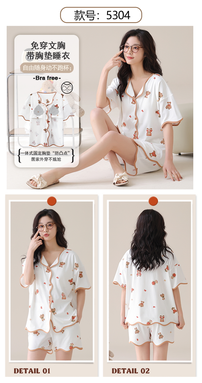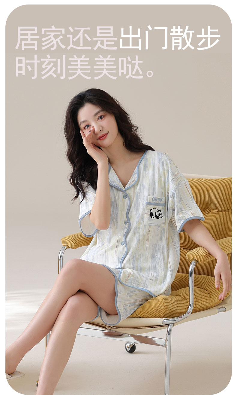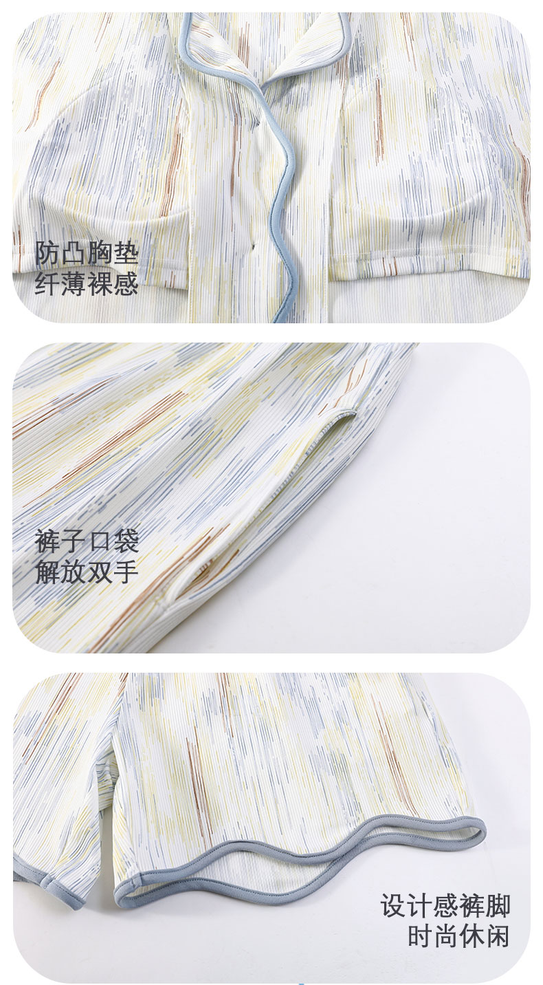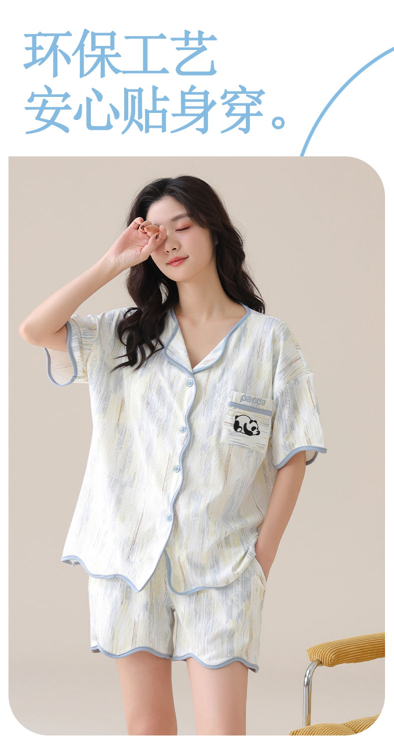 自然醒香韵冰丝睡衣女夏季(带胸垫)开衫短袖短裤套装女家居服可外穿QH