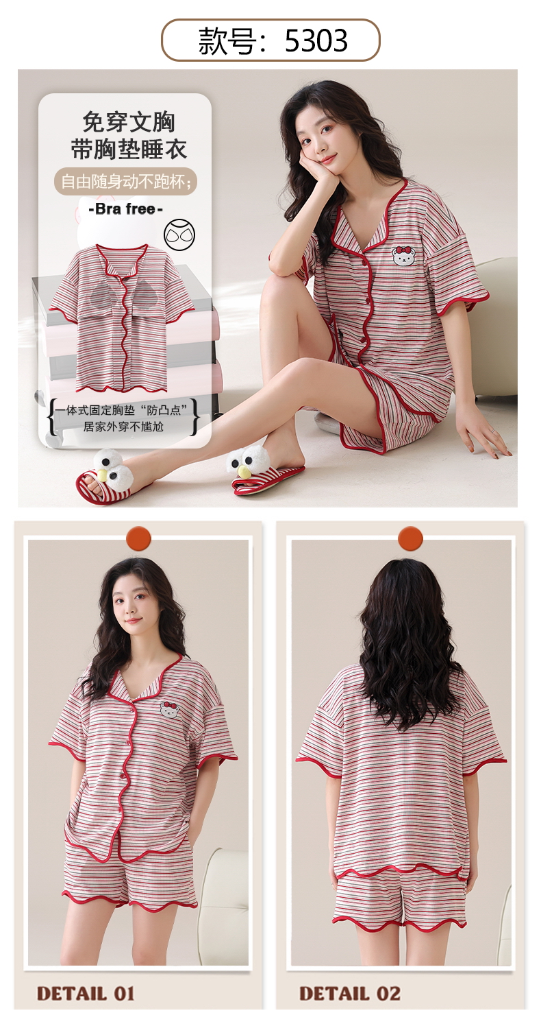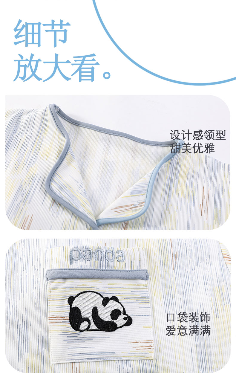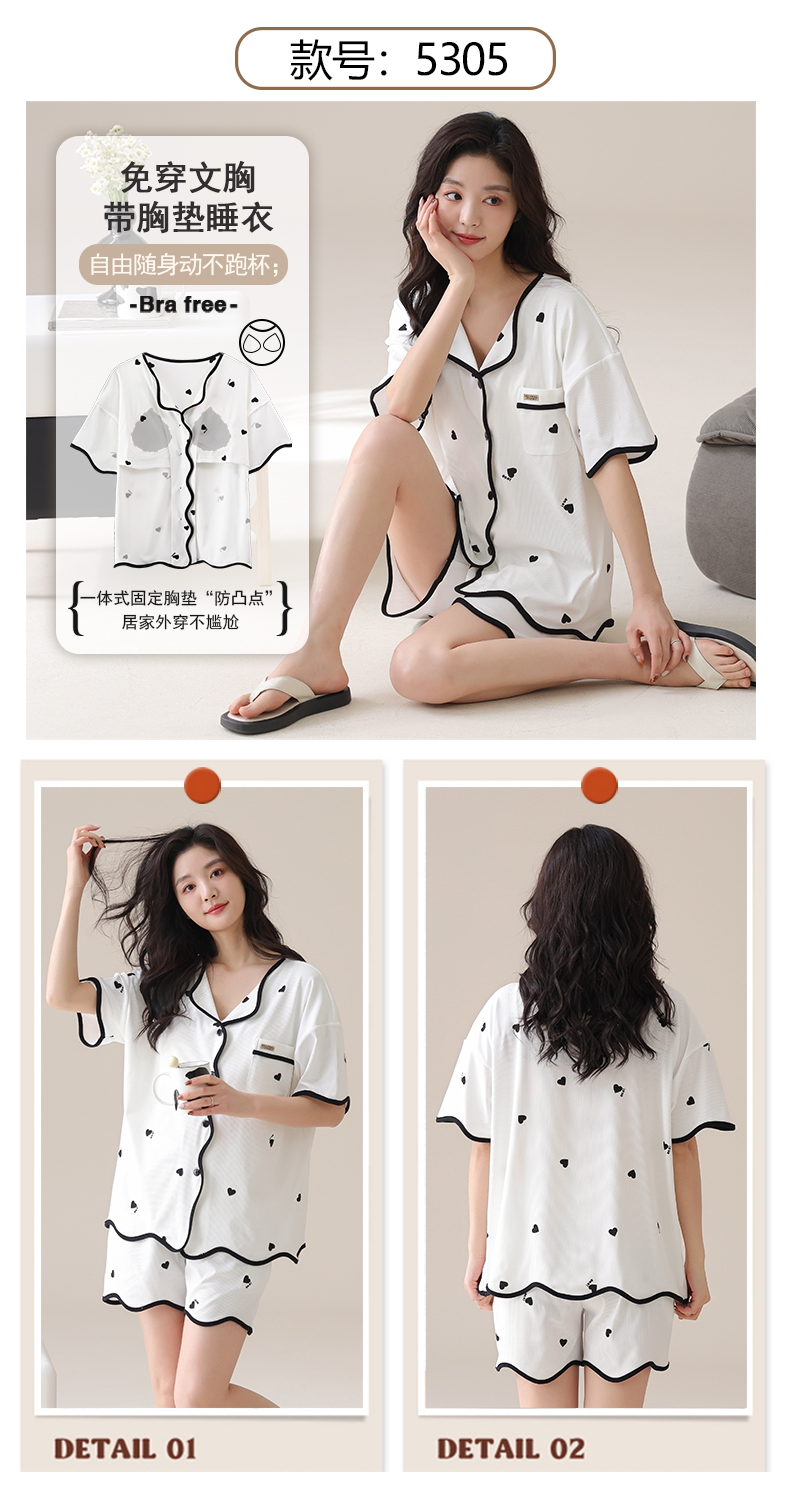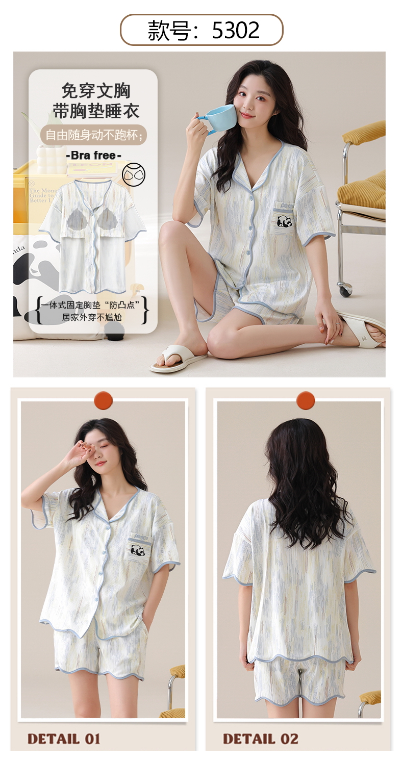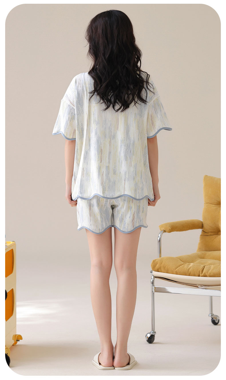 自然醒香韵冰丝睡衣女夏季(带胸垫)开衫短袖短裤套装女家居服可外穿QH