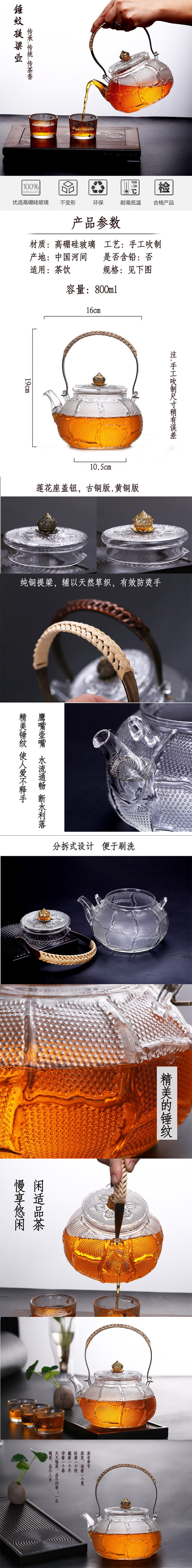 【简约大方 限时特价】锤纹铜钮提梁壶茶具 玻璃壶 耐高温高硼硅 800ml容量
