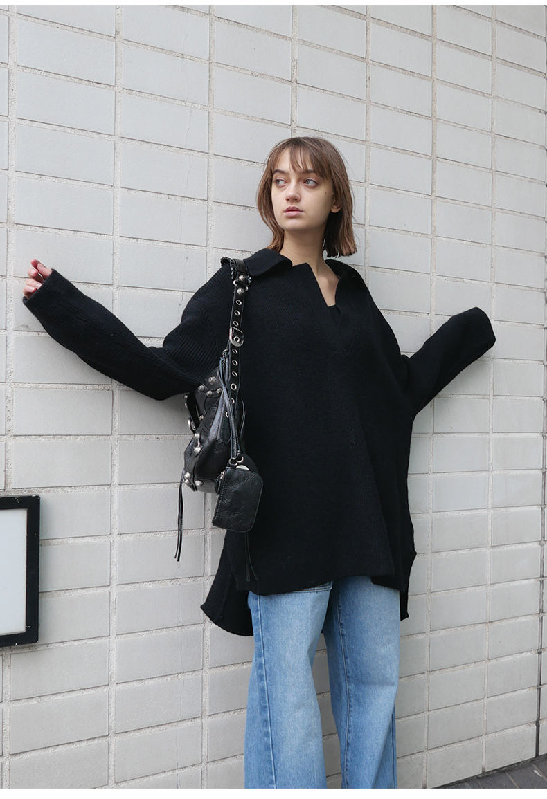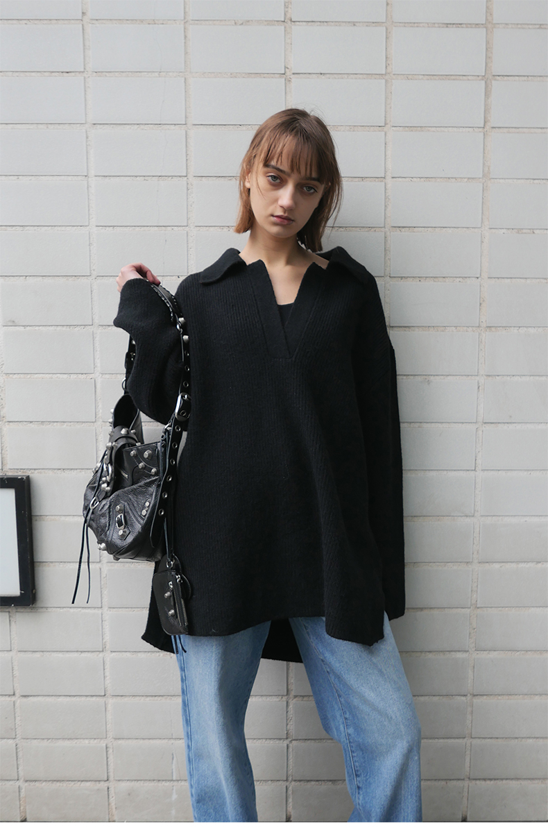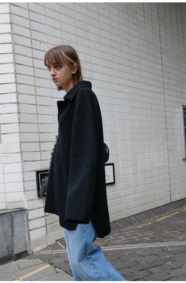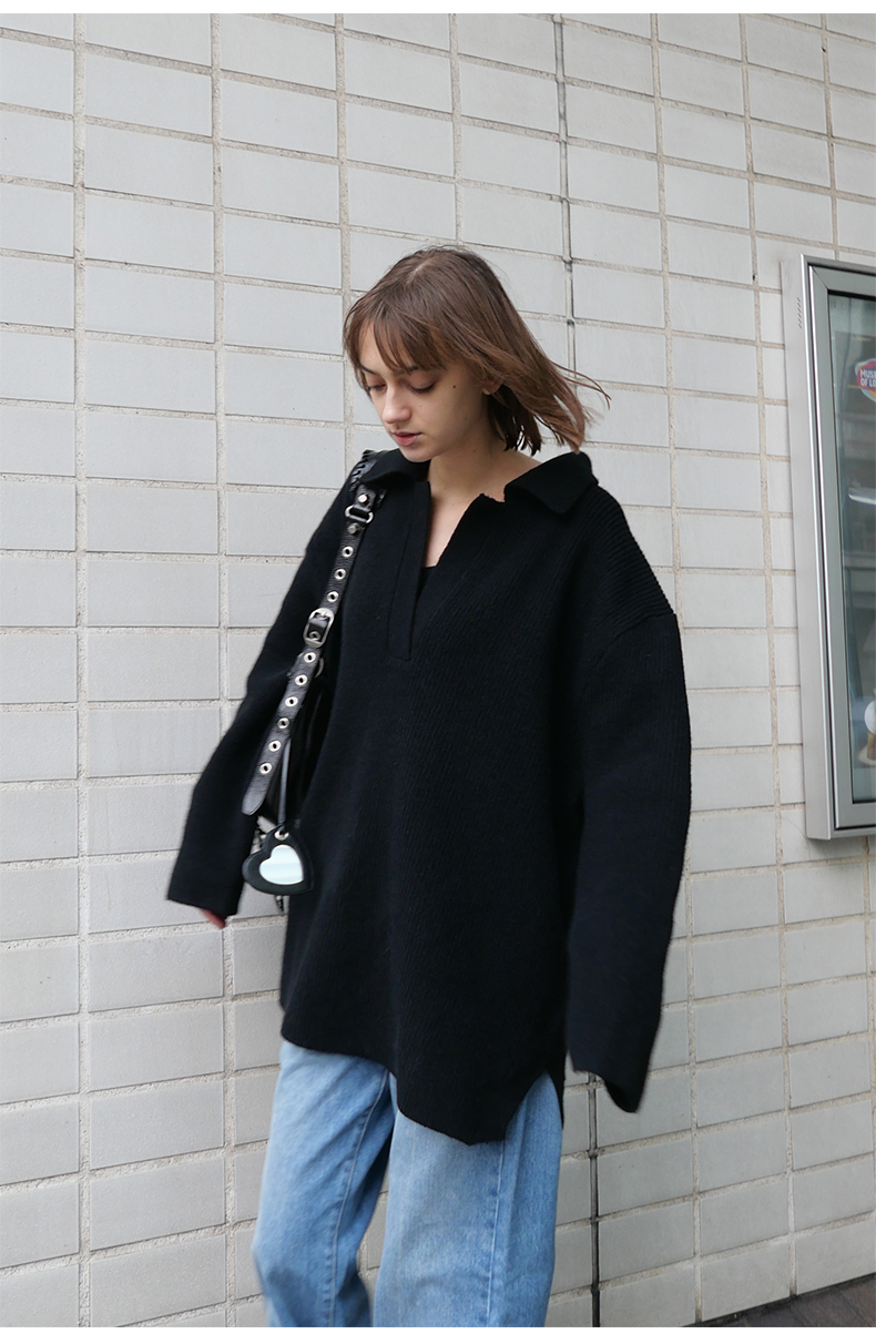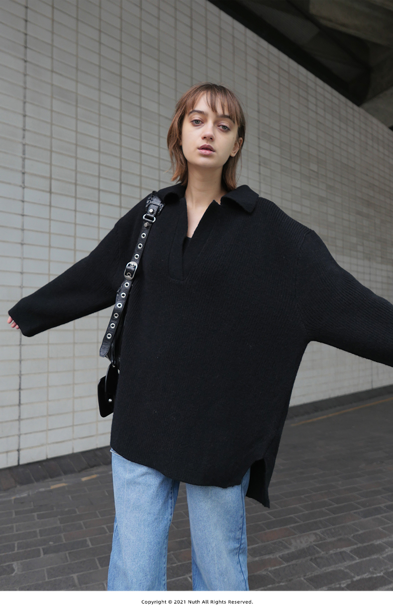 NUTH 宽松POLO开领百搭黑色慵懒针织衫毛衣