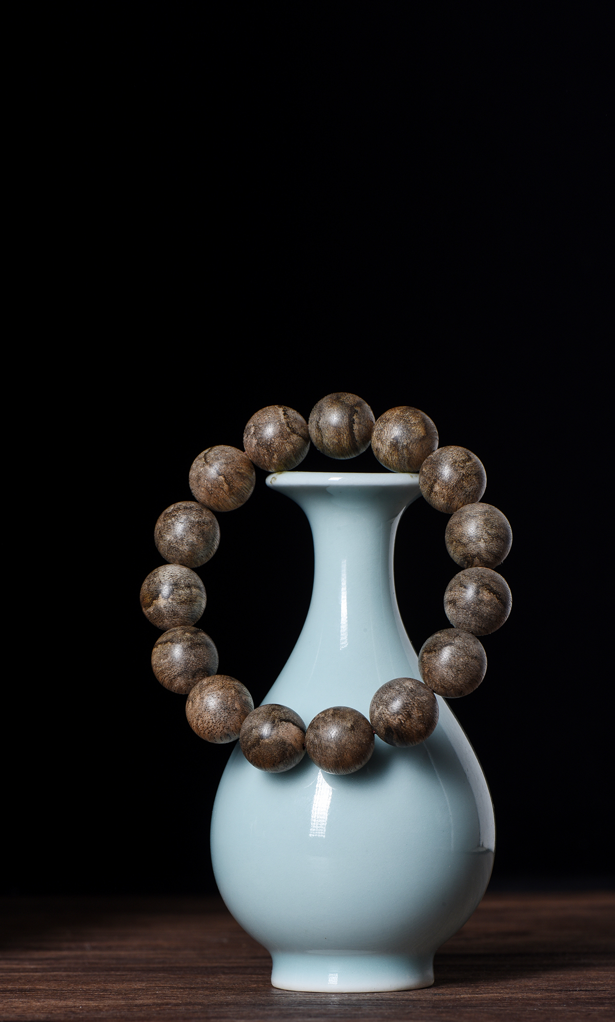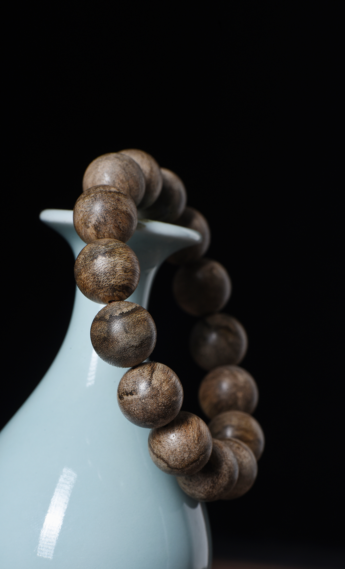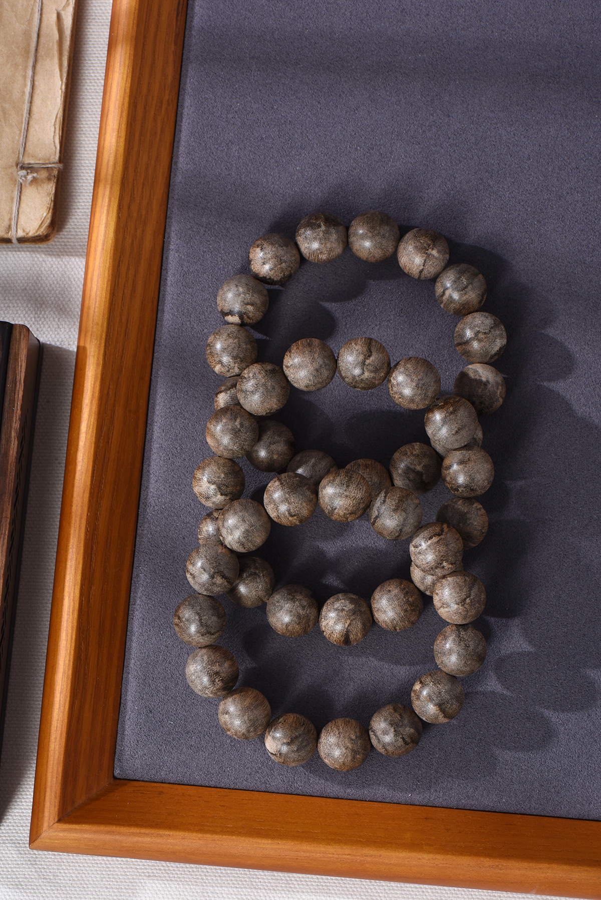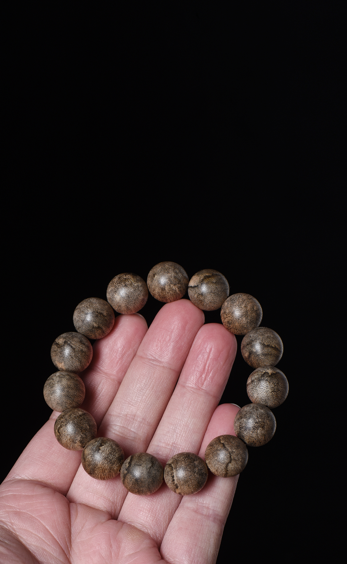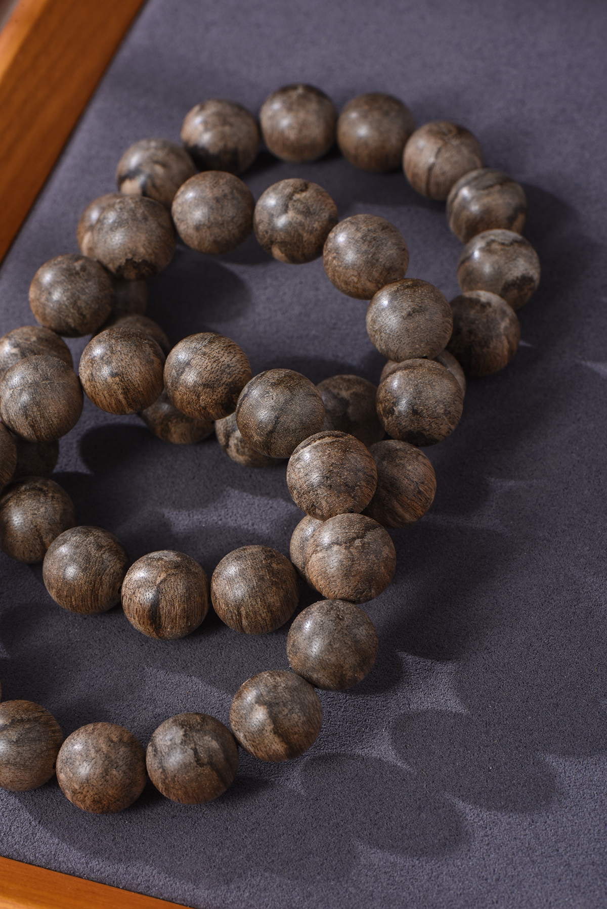 珠子表面的棕黑色丝状细纹,一眼就能认出是柬埔寨沉香的特色。