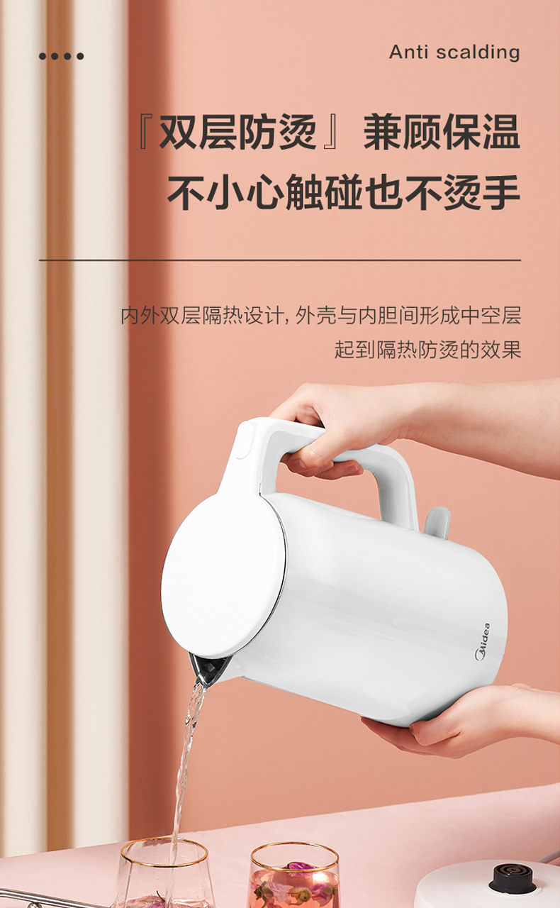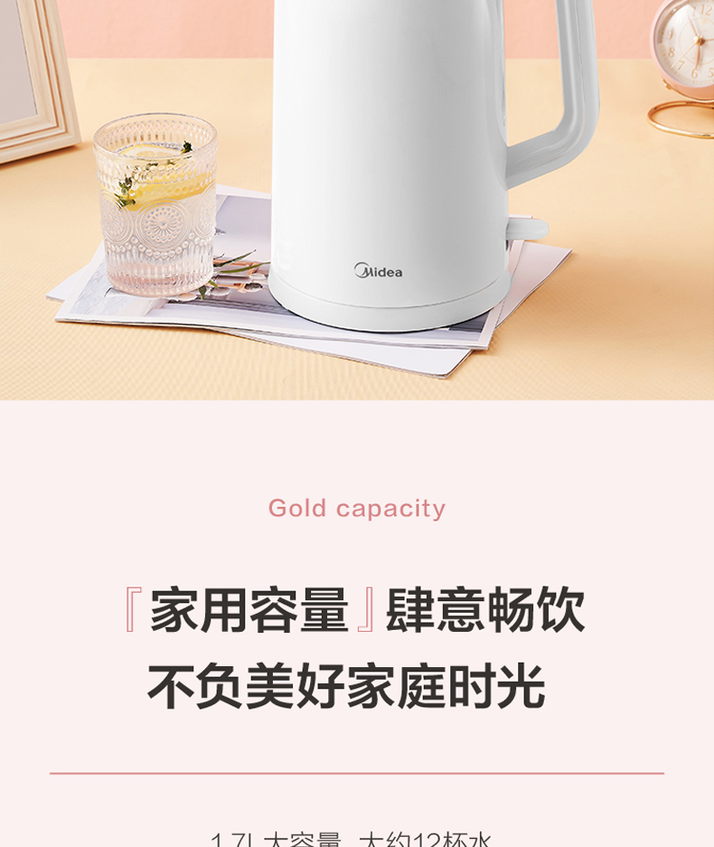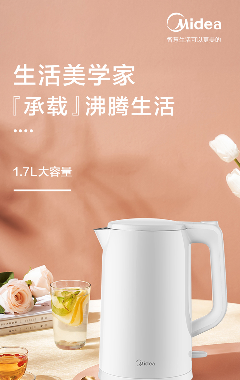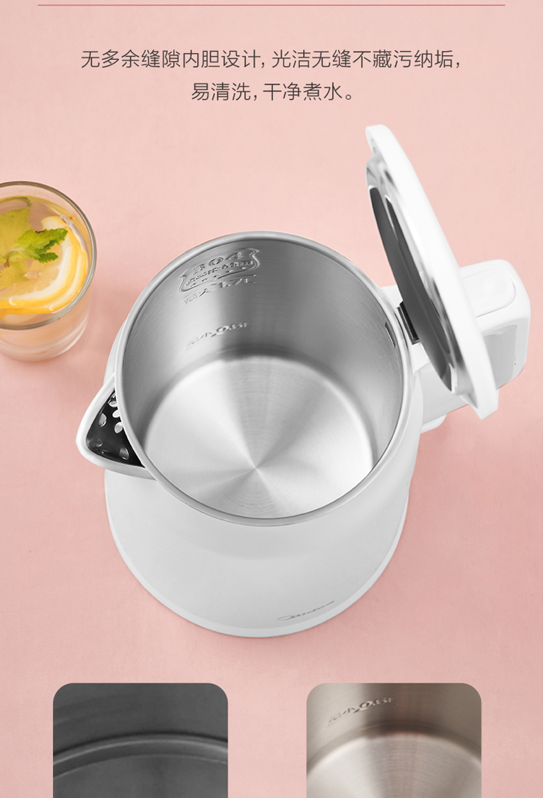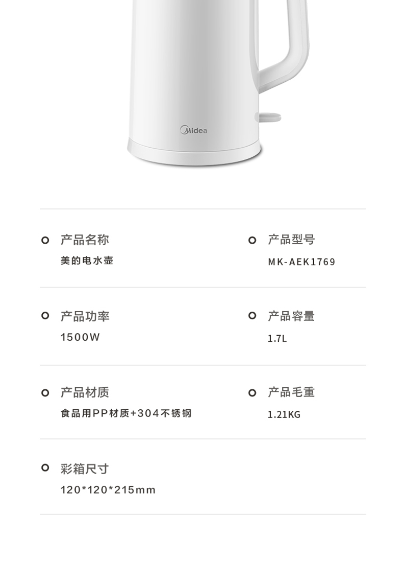 美的 电热水壶 1.7L 304不锈钢烧水壶 AEK1769