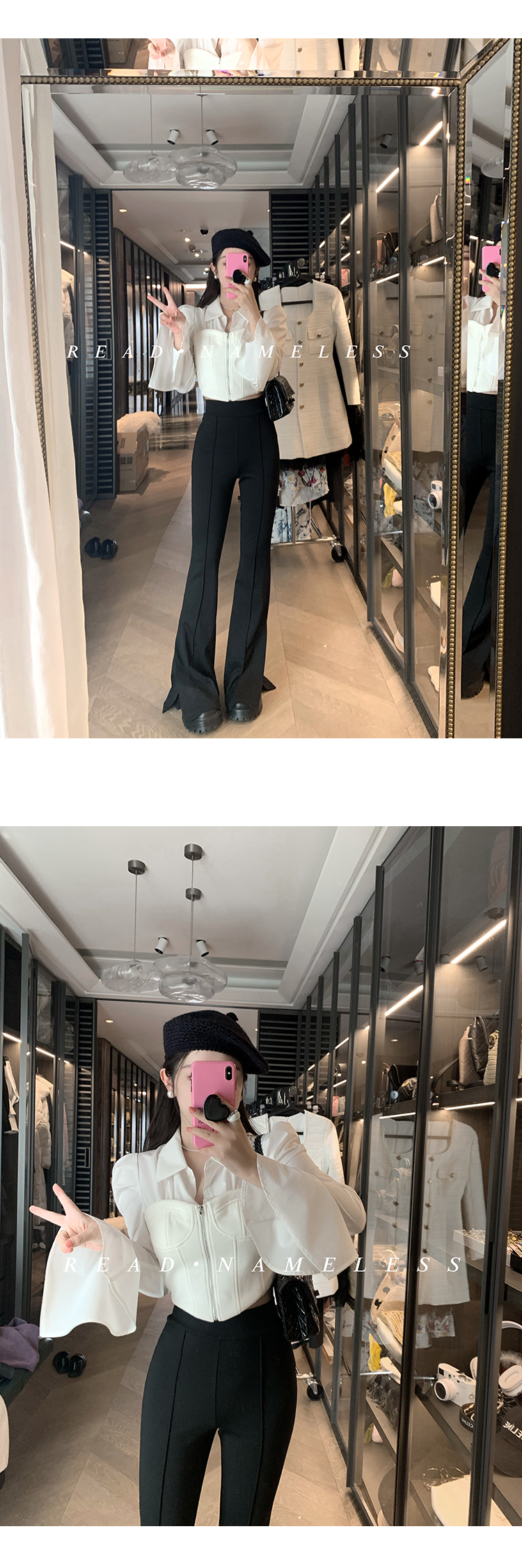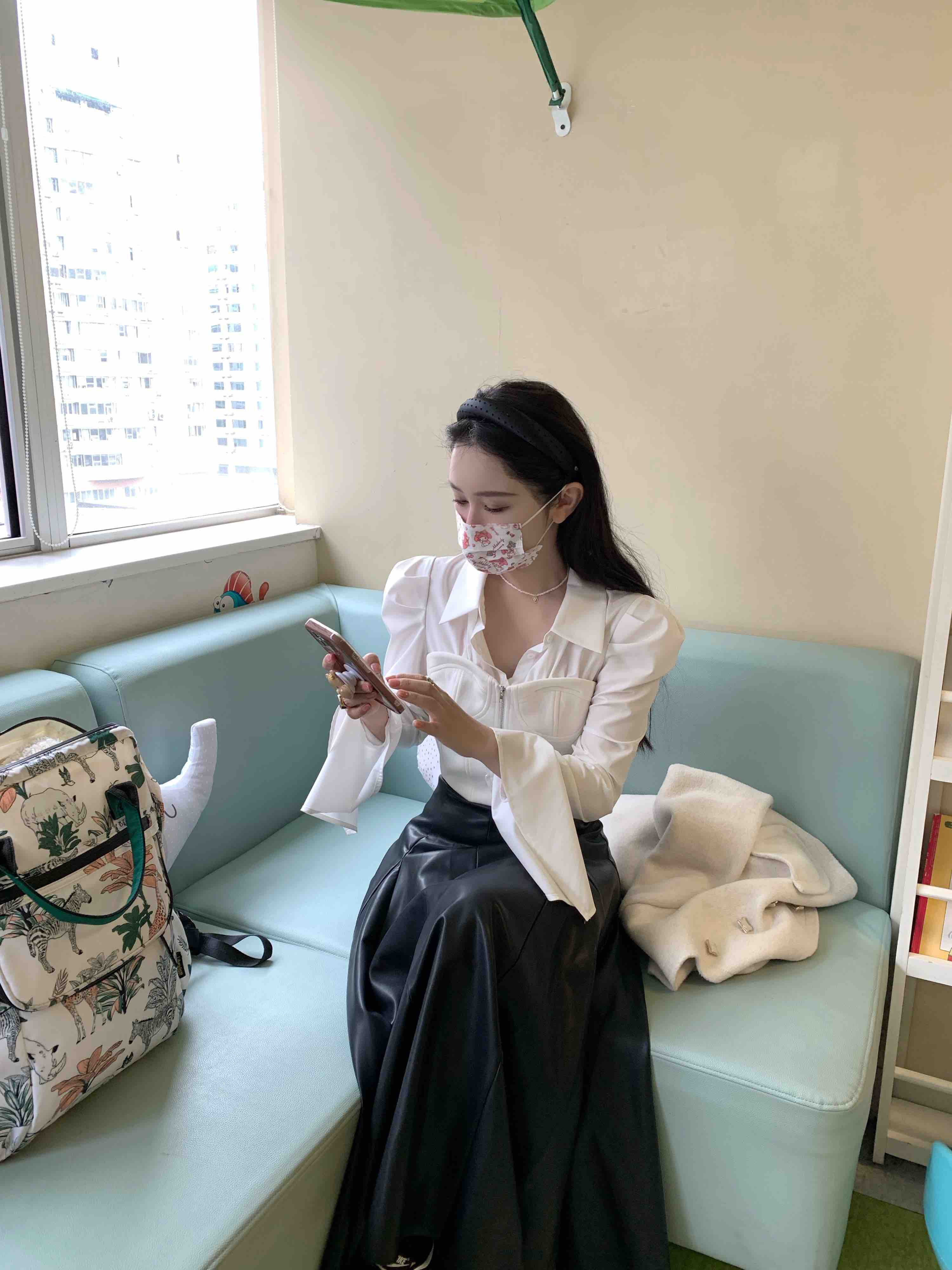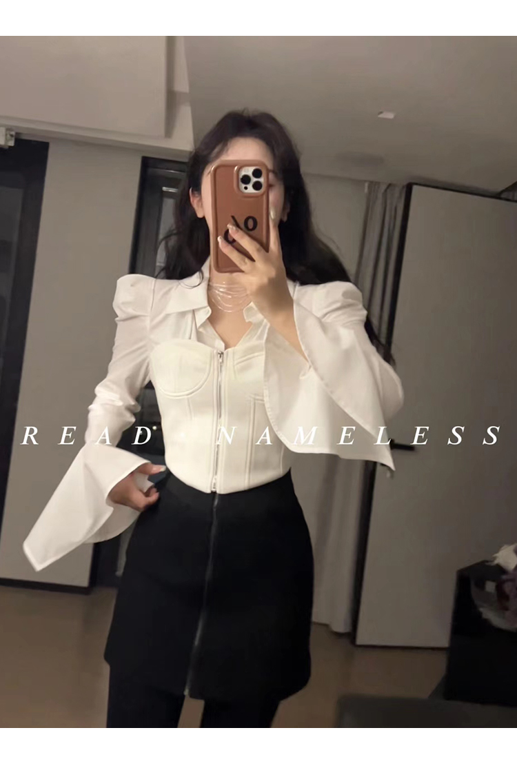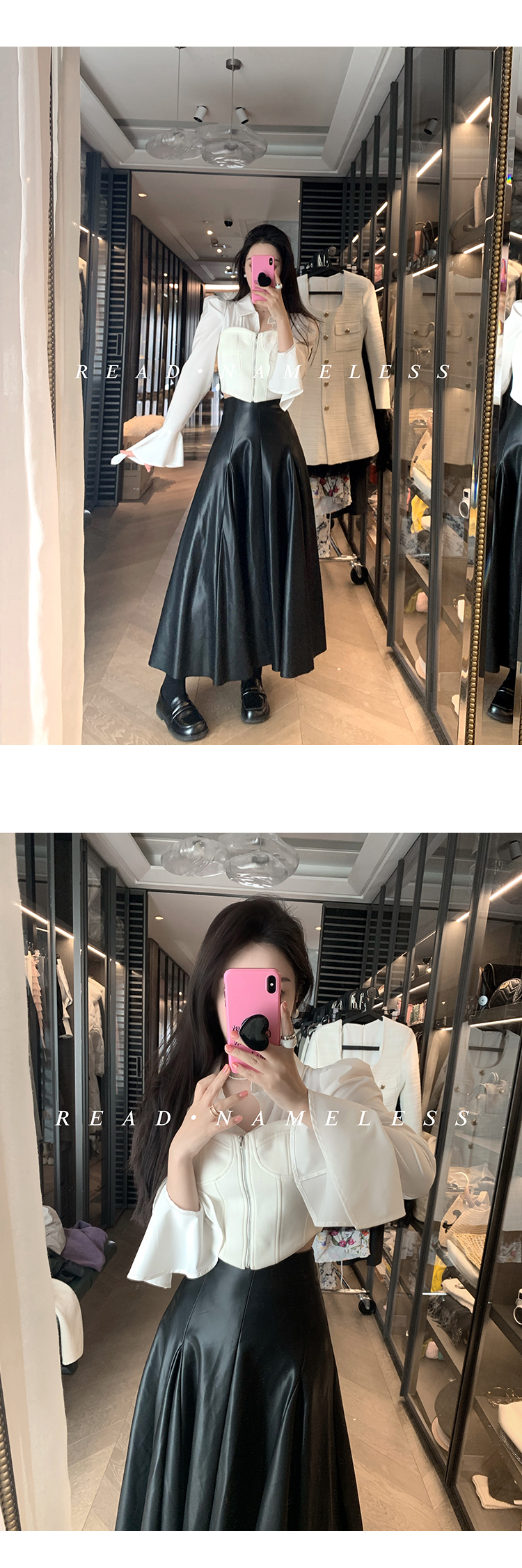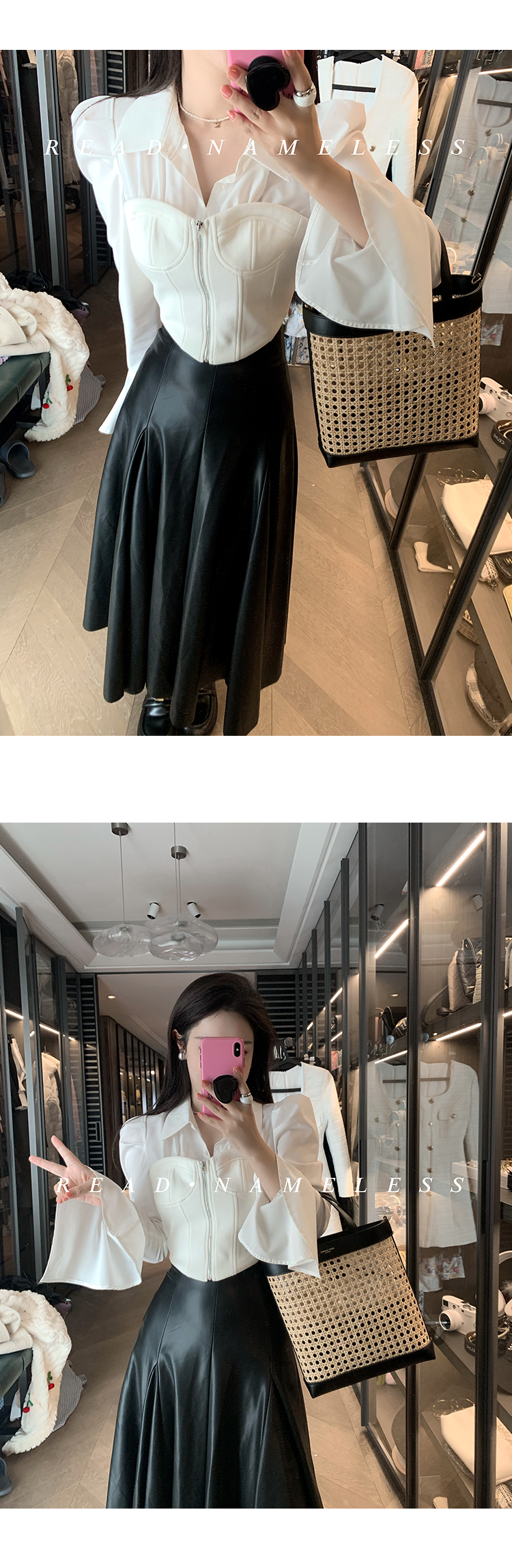 Read Nameless /假两件白色拉链衬衫+高腰长皮裙伞裙