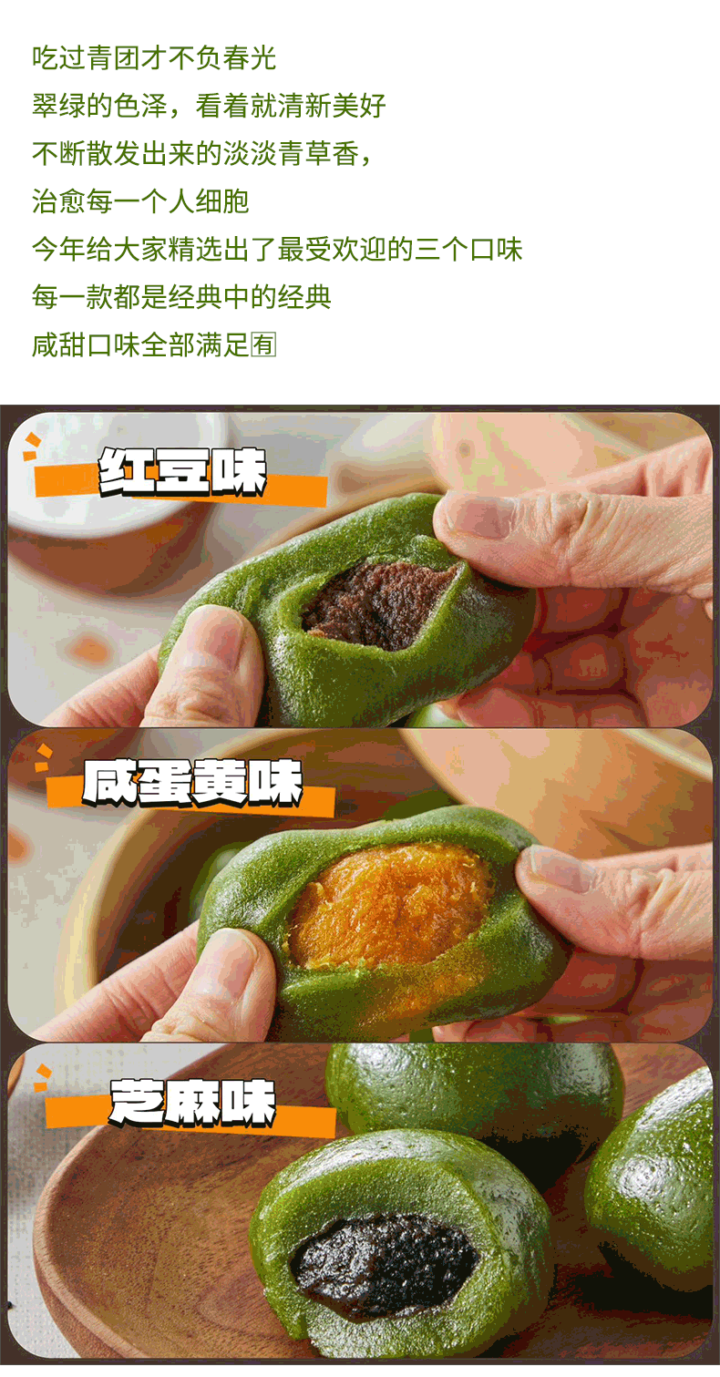 4、黑芝麻/红豆沙/咸蛋黄肉松,3种口味,每一口都是春天的味道。