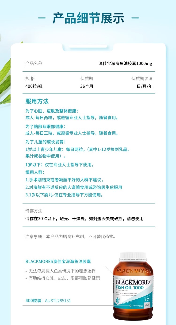 【保税仓】澳佳宝Blackmores原味鱼油胶囊400粒 商品图4