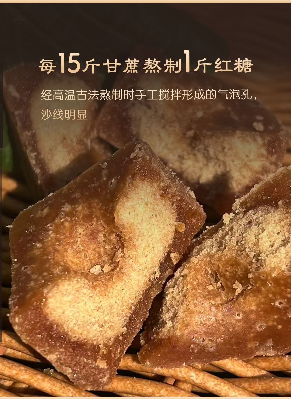 ✅纯甘蔗榨汁熬煮,没有赤砂糖、工业糖精等添加剂,15斤甘蔗熬1斤红糖