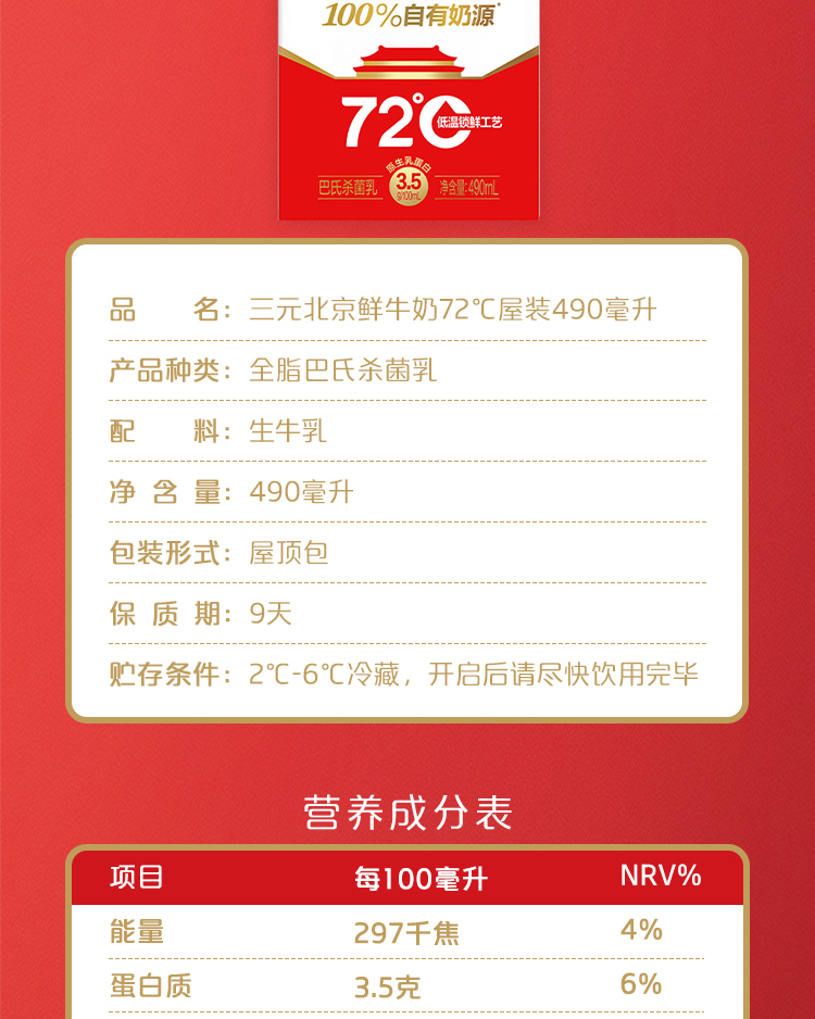 【自提-低温】三元北京鲜牛奶72℃屋型鲜牛乳490ml