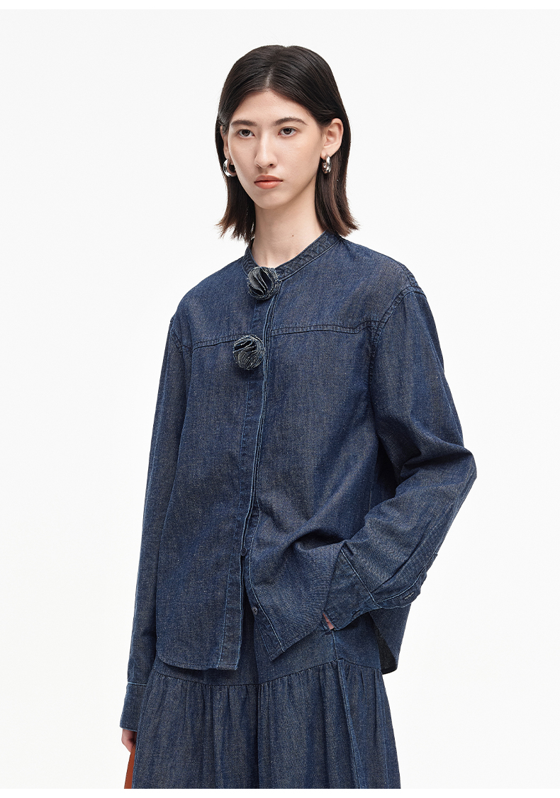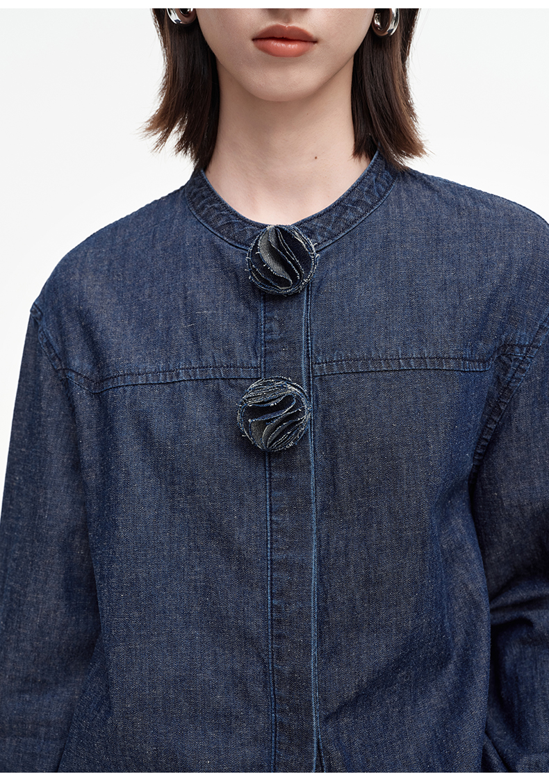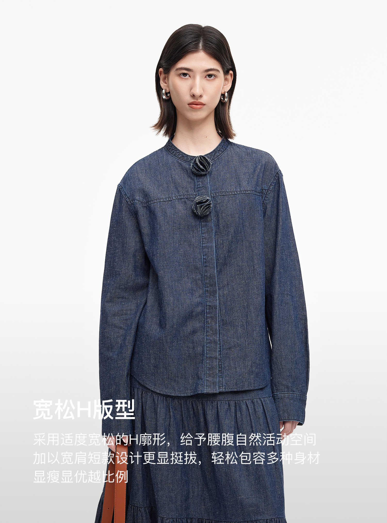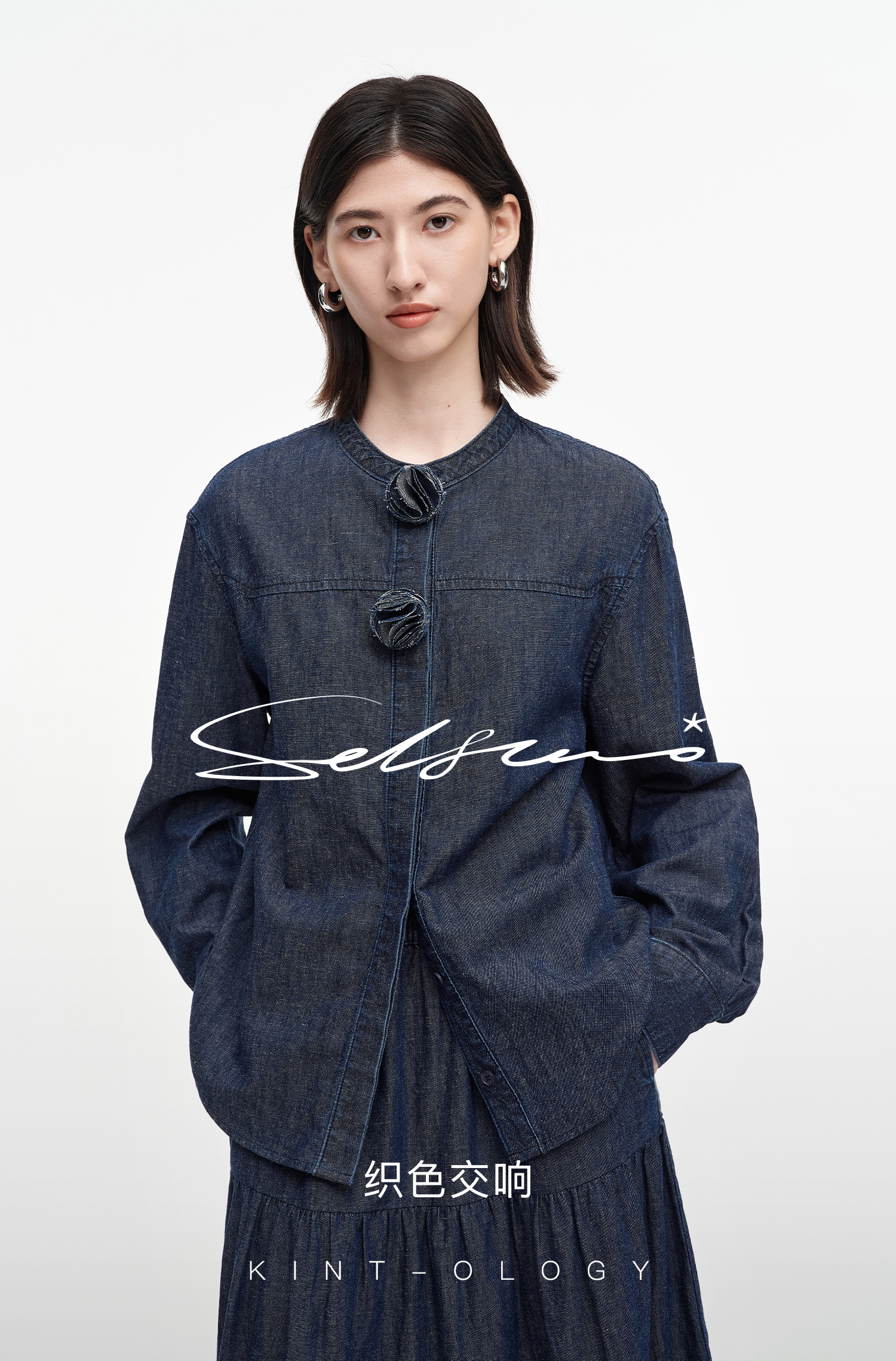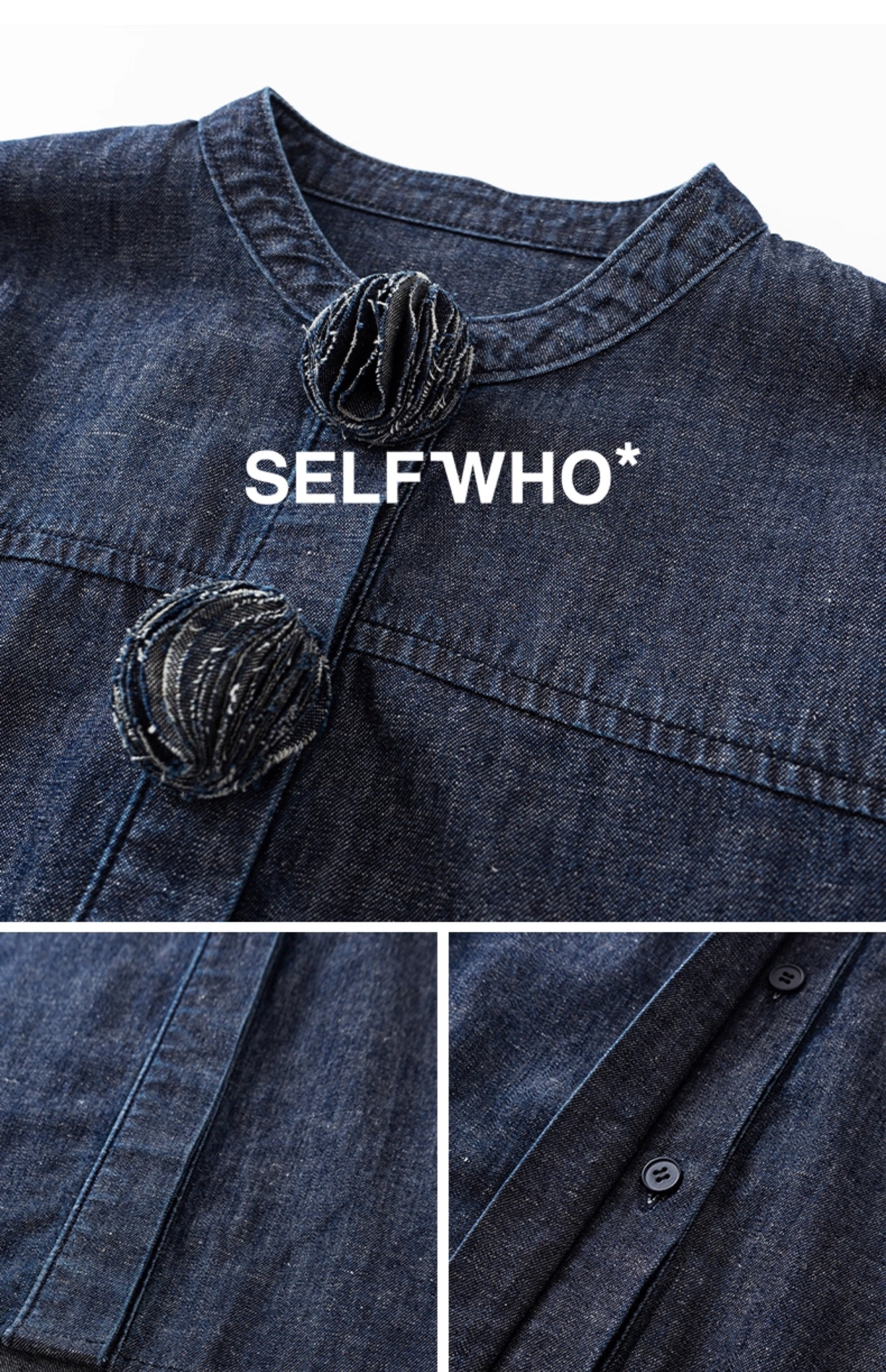 SELFWHO棉麻原蓝色复古牛仔衬衫女2025秋新款立体书页球装饰上衣