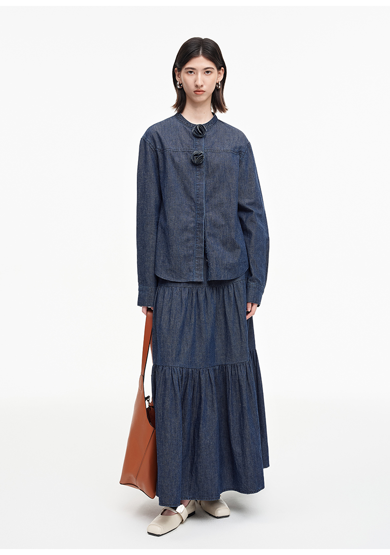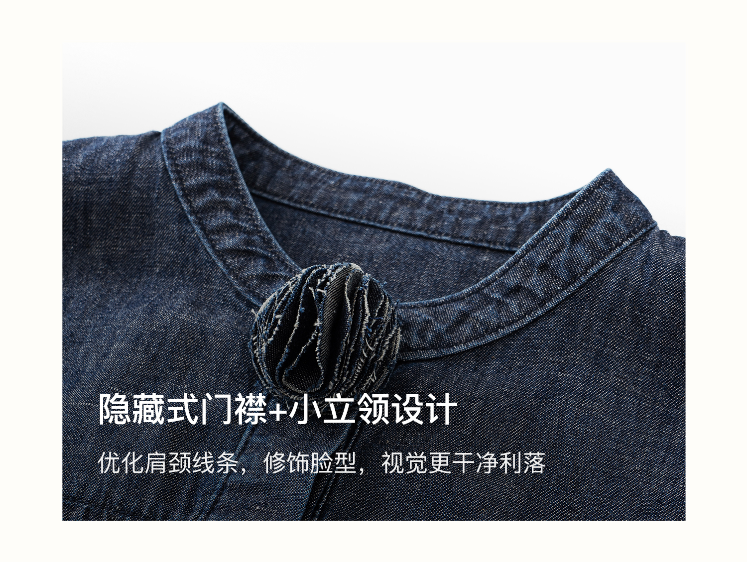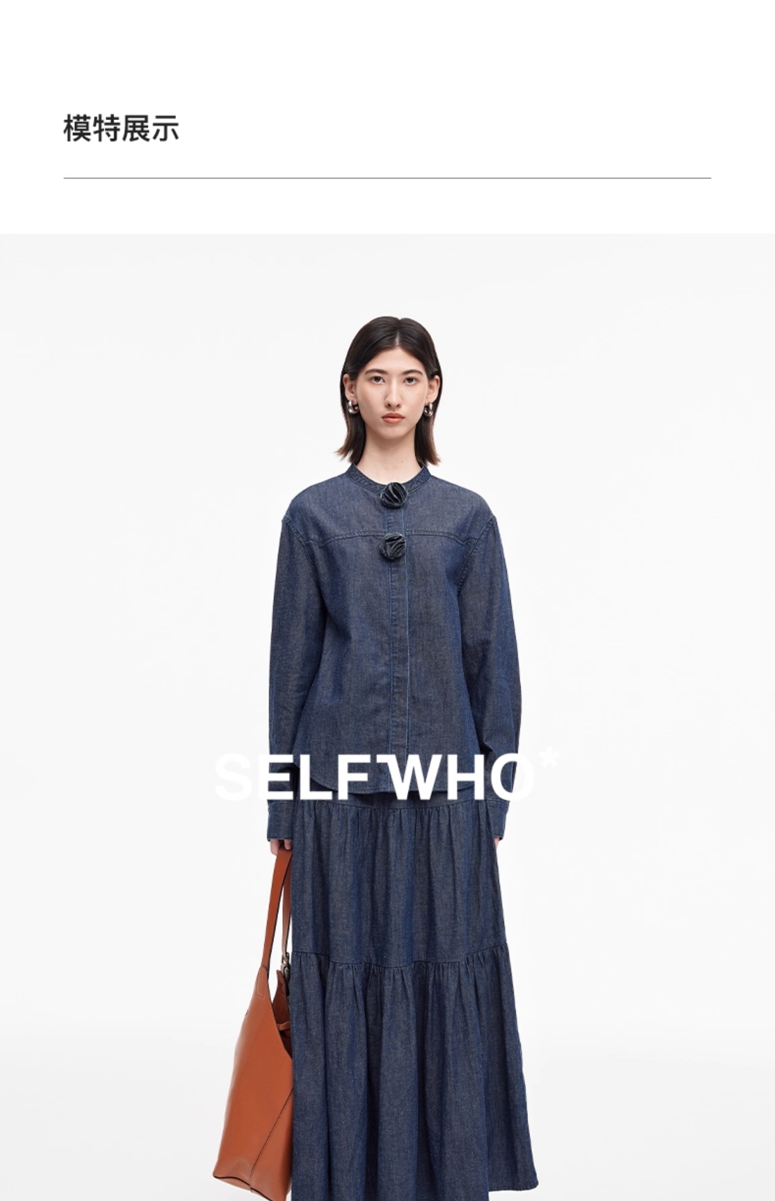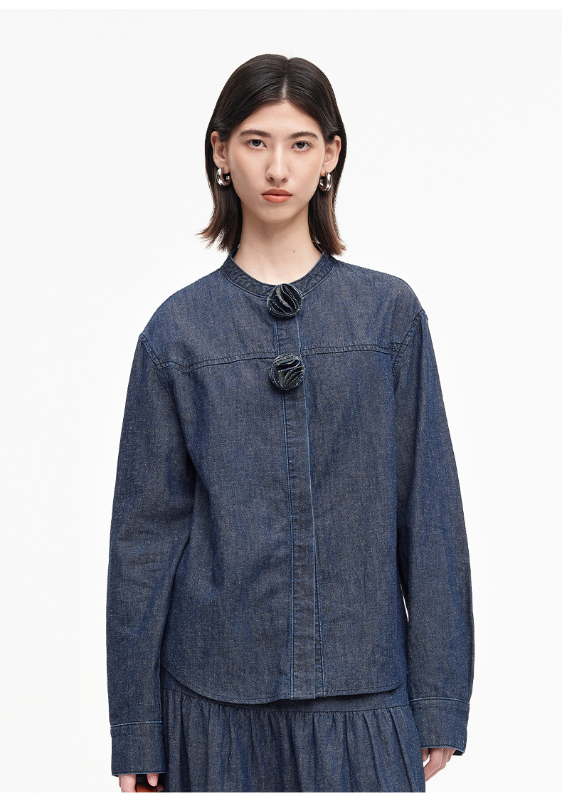 SELFWHO棉麻原蓝色复古牛仔衬衫女2025秋新款立体书页球装饰上衣