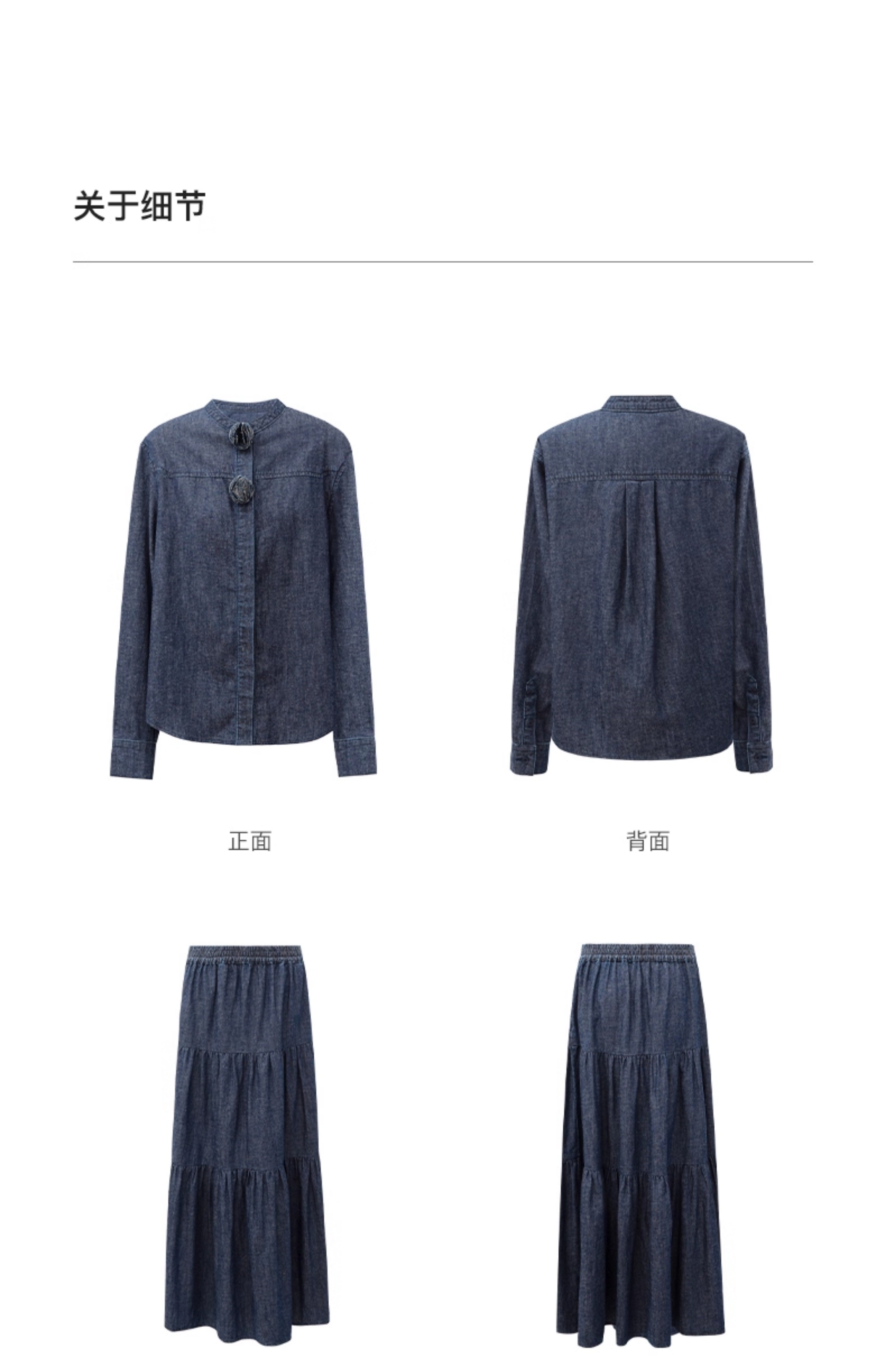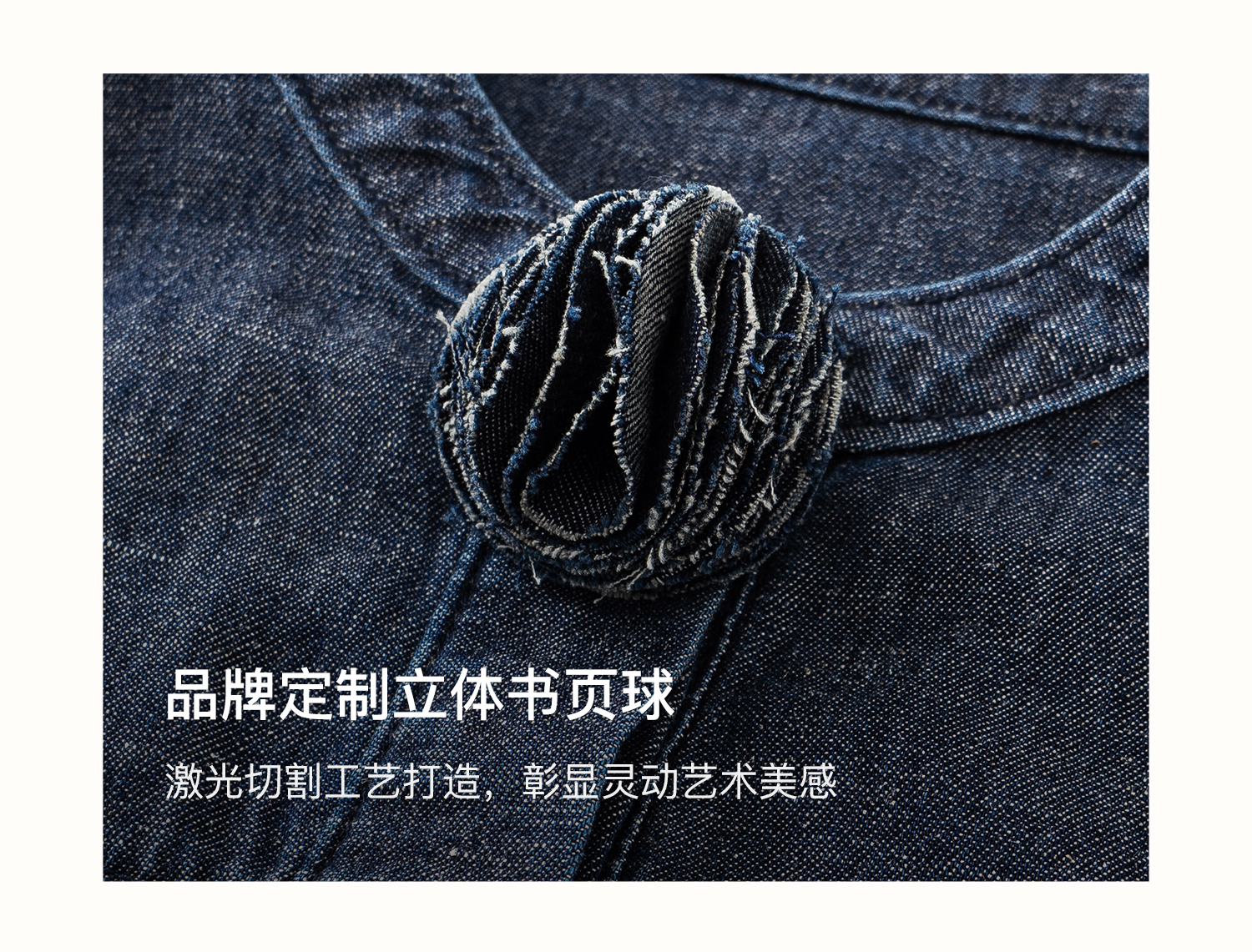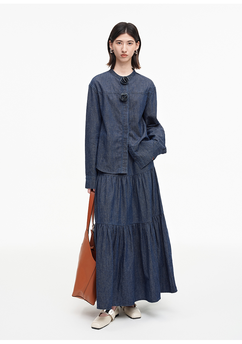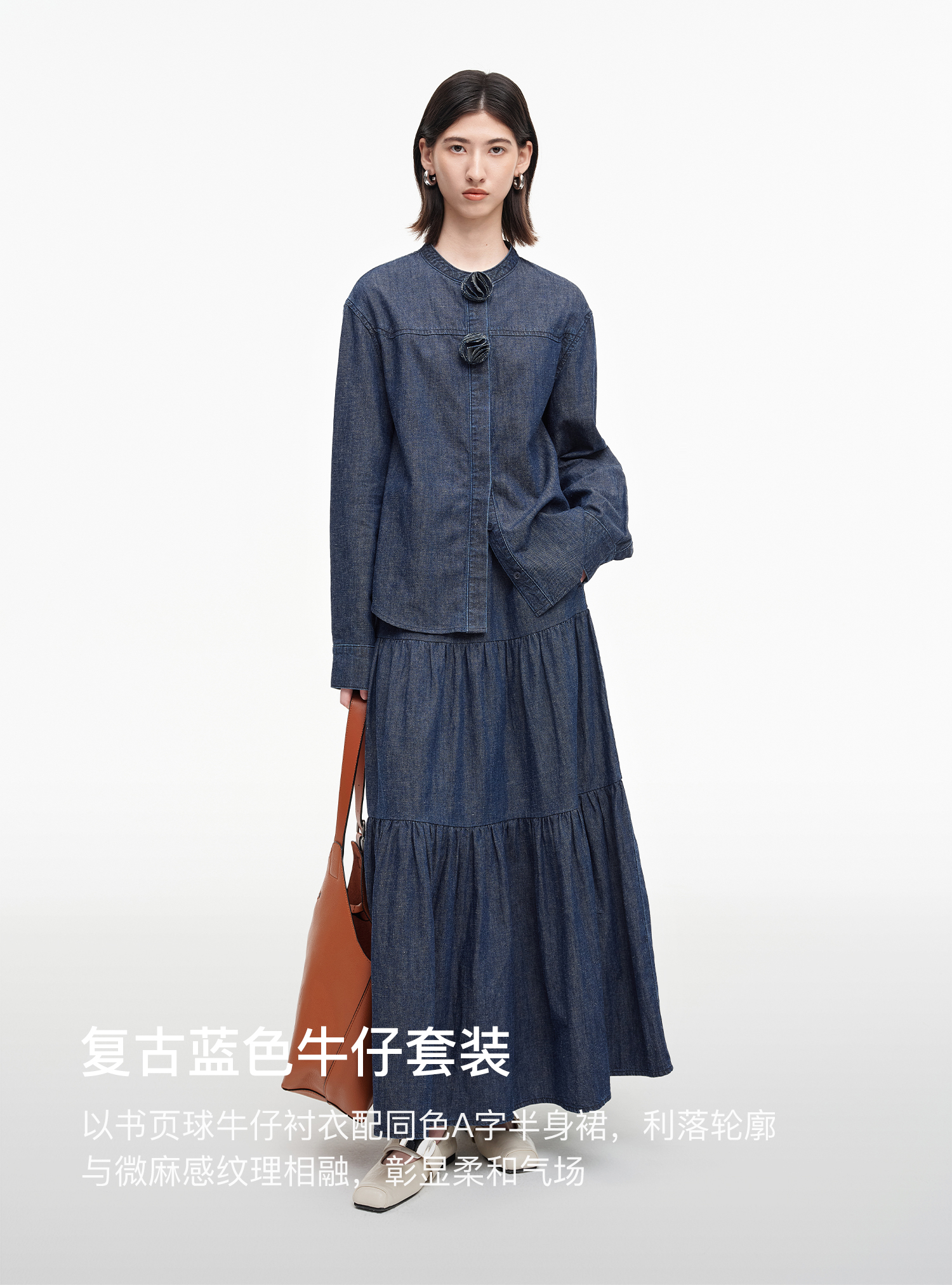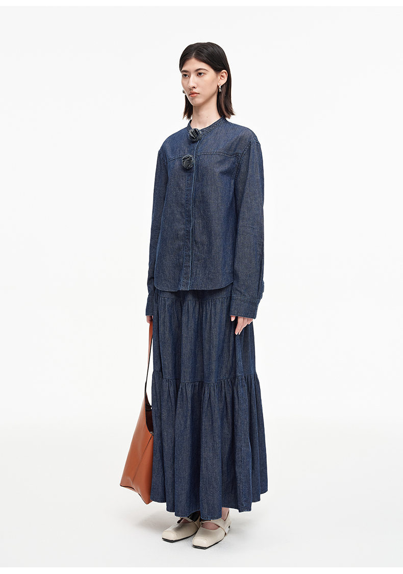SELFWHO棉麻原蓝色复古牛仔衬衫女2025秋新款立体书页球装饰上衣