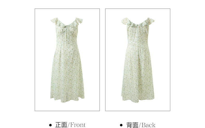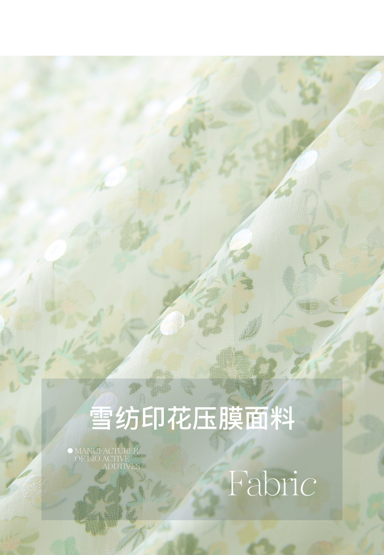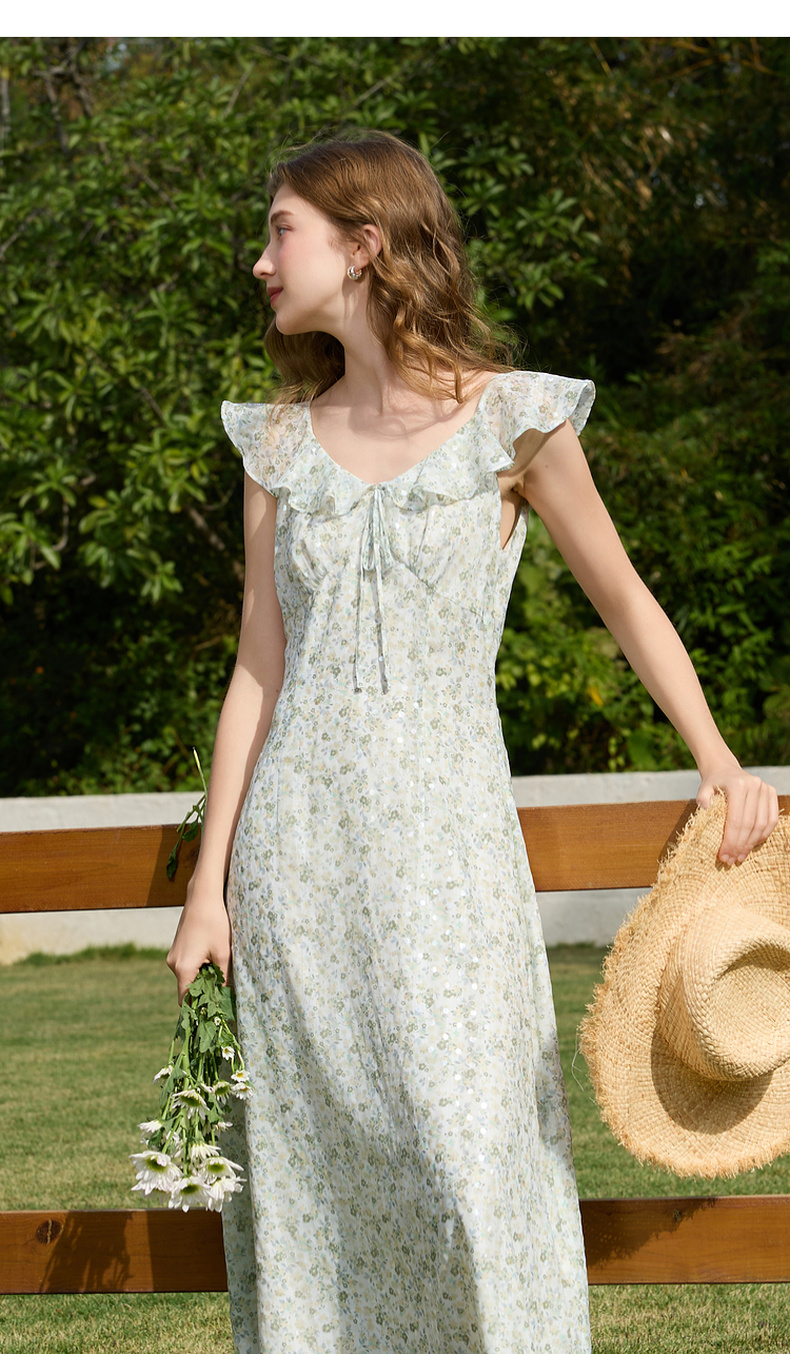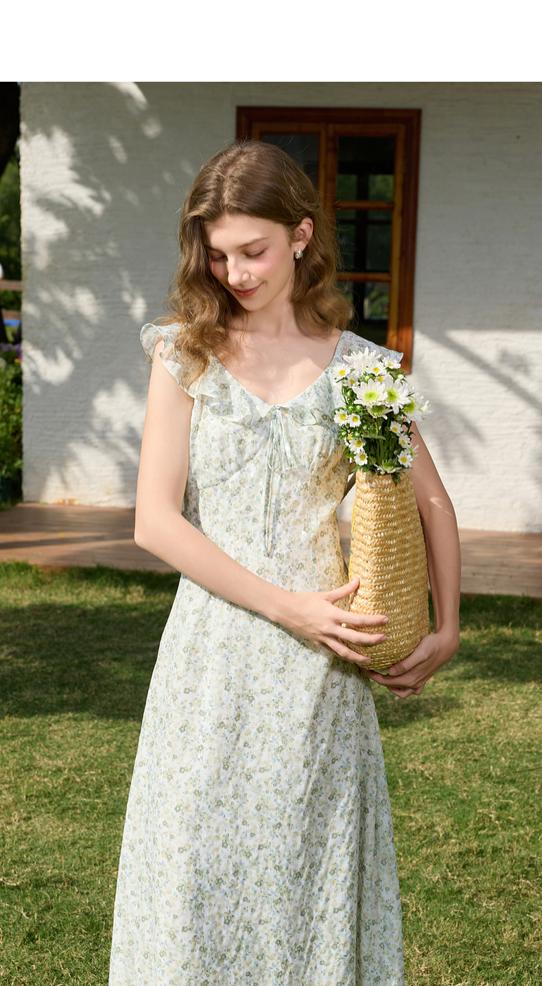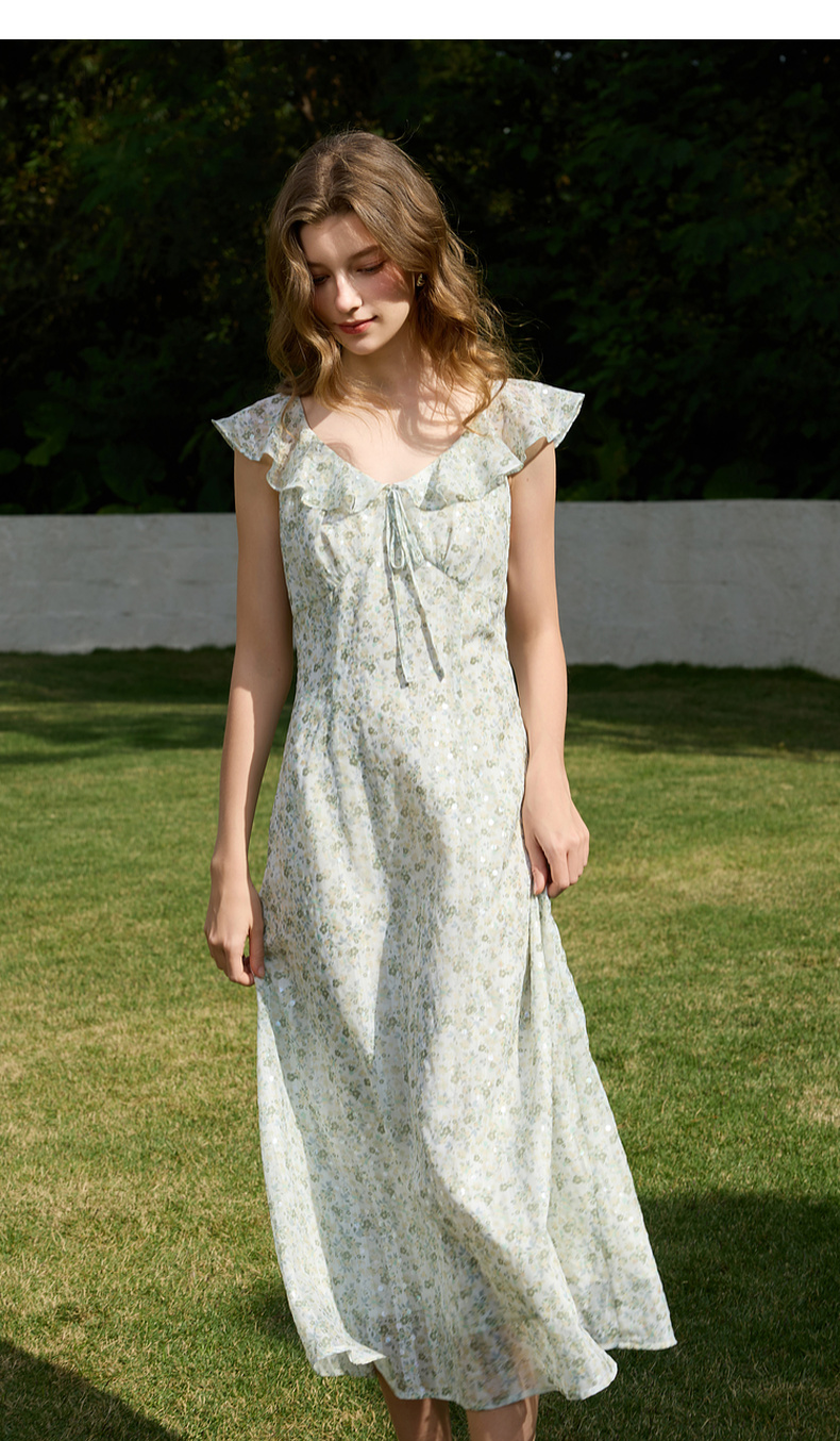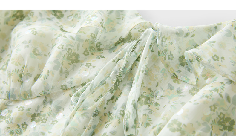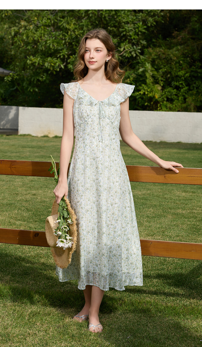 三彩2026春季新款度假风浪漫女神裙V领碎花雪纺A字裙连衣裙长裙M