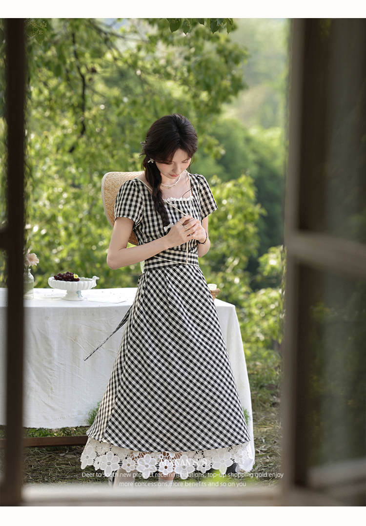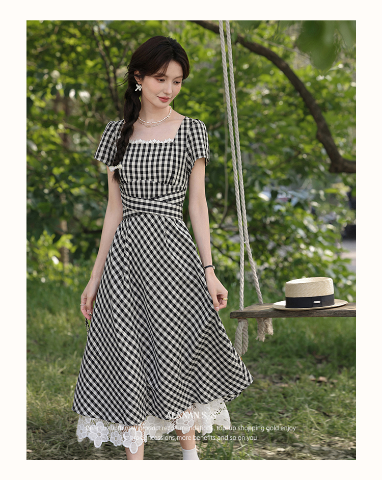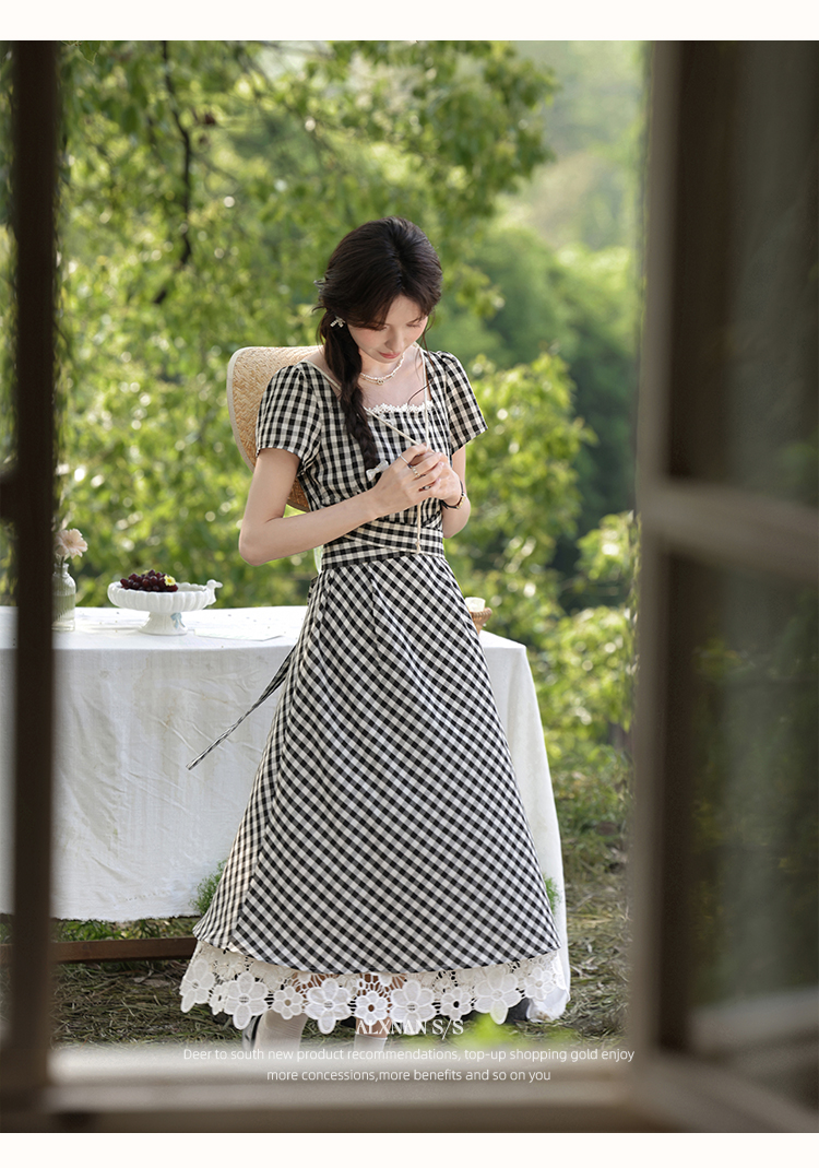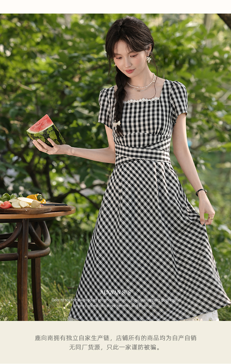 鹿向南「琴语小岛」法式气质黑杏色格子短袖连衣裙女A字长裙夏