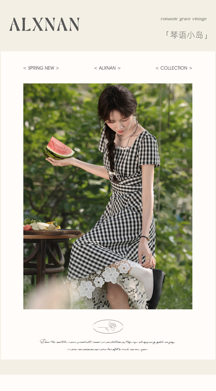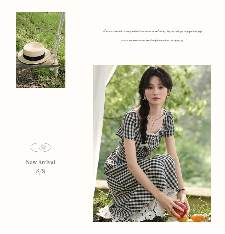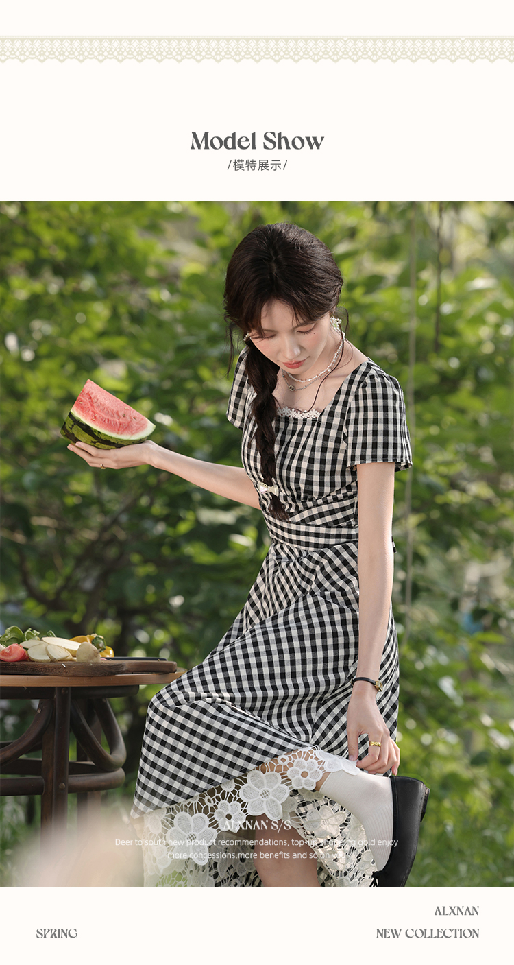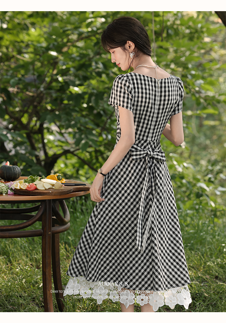 鹿向南「琴语小岛」法式气质黑杏色格子短袖连衣裙女A字长裙夏