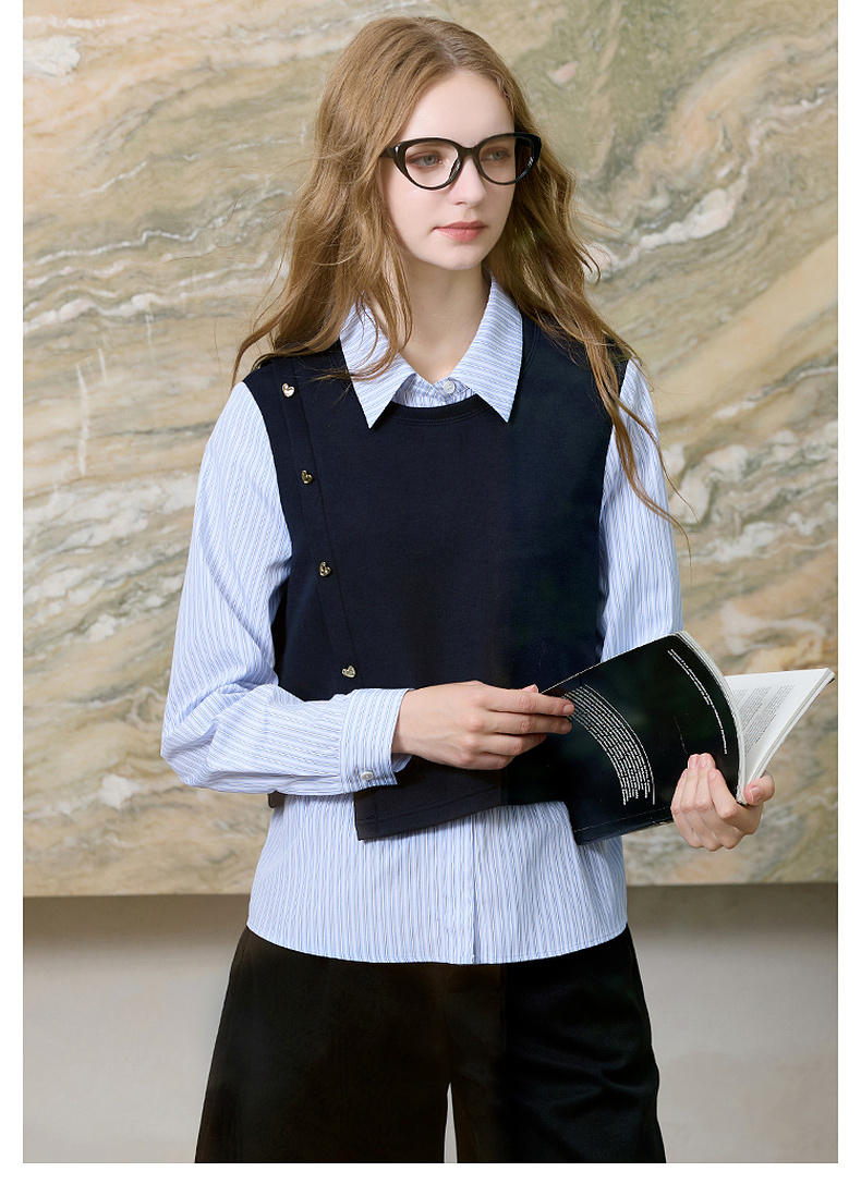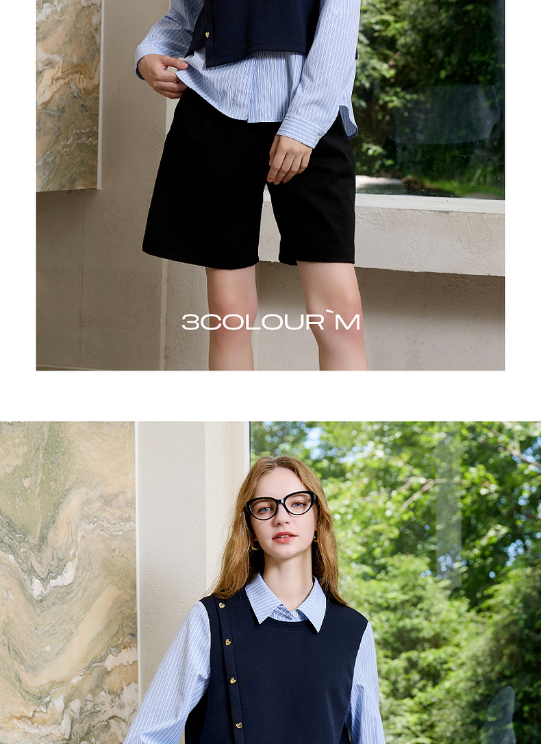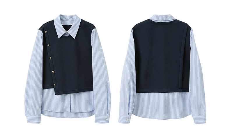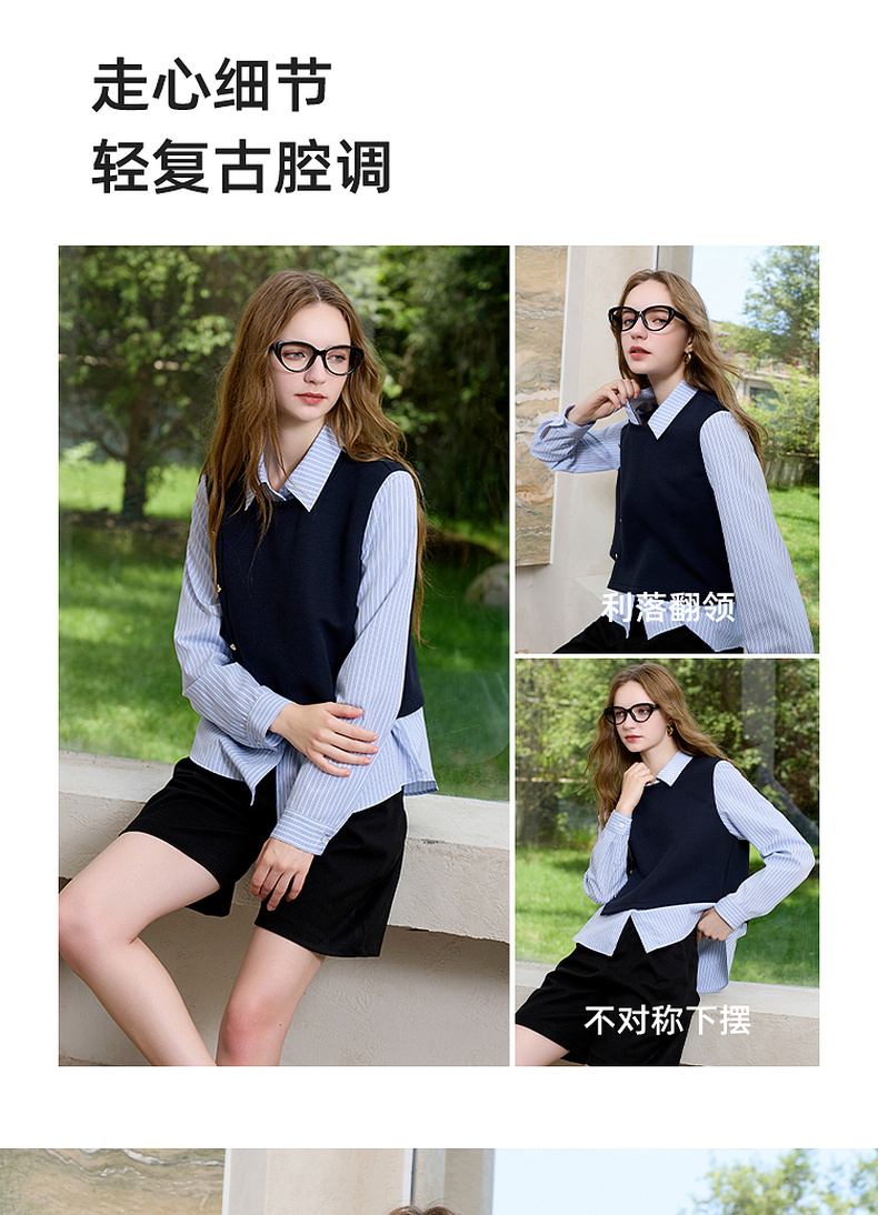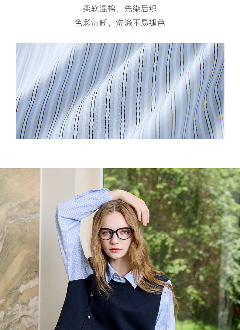 三彩2025秋季新款假两件小衫翻领条纹拼接上衣通勤简约M