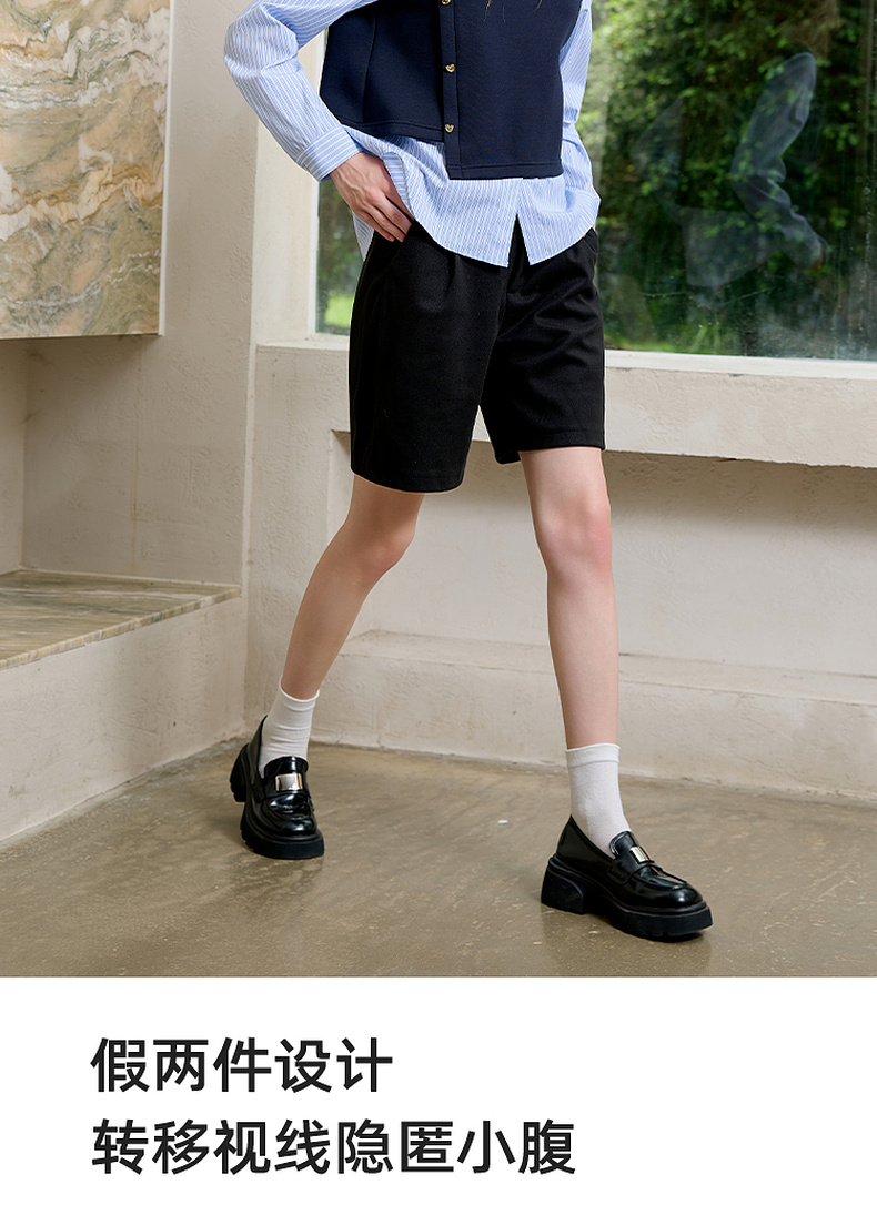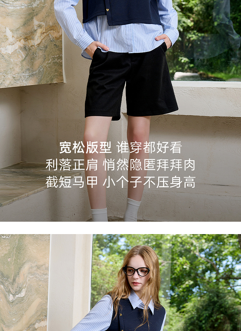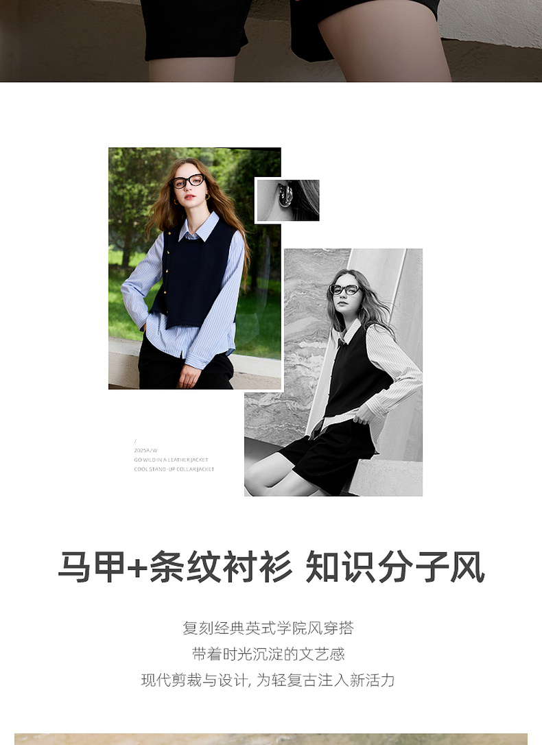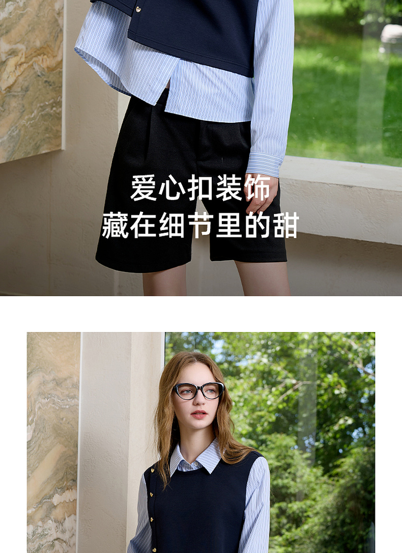 三彩2025秋季新款假两件小衫翻领条纹拼接上衣通勤简约M