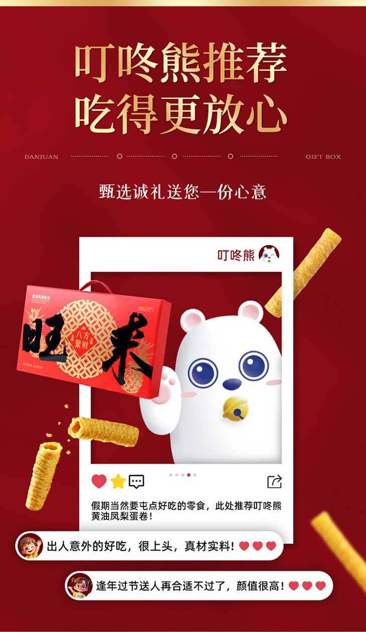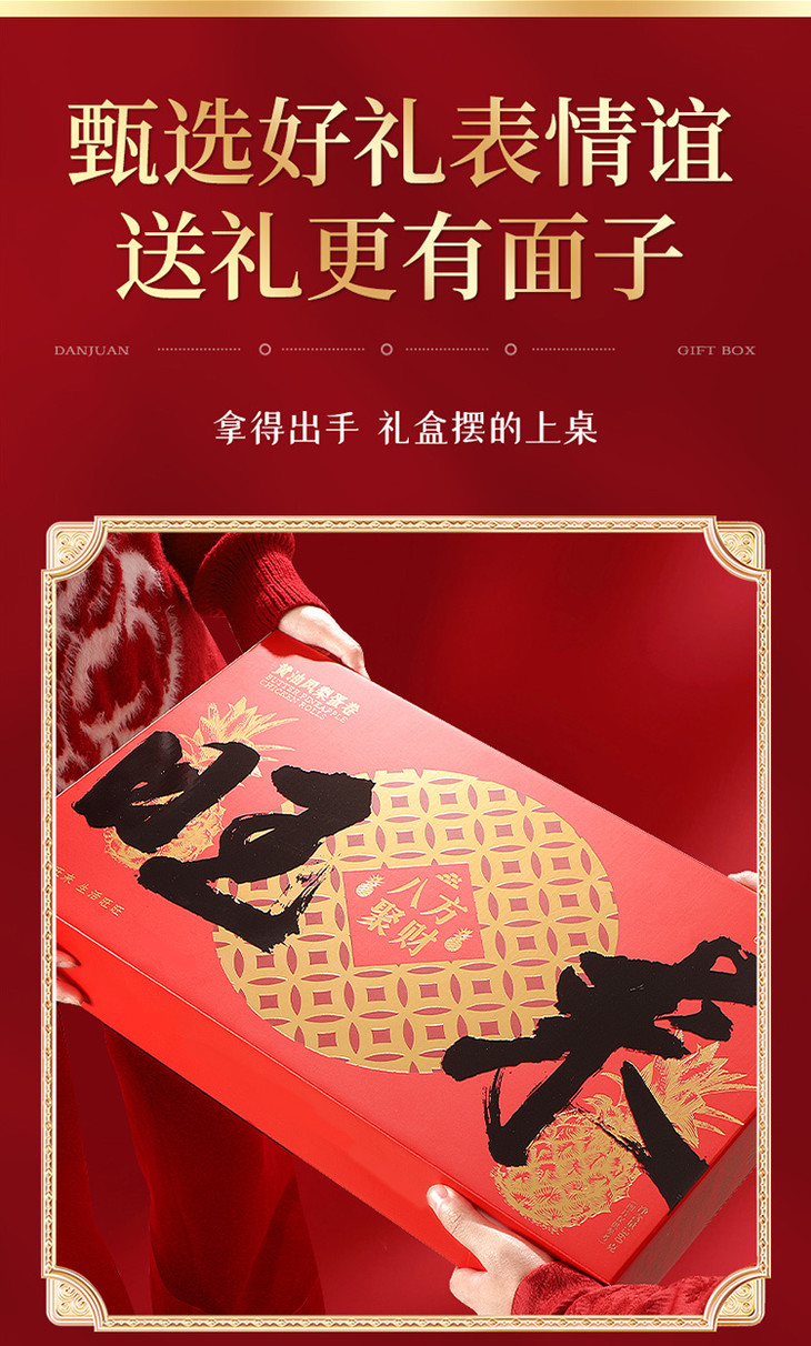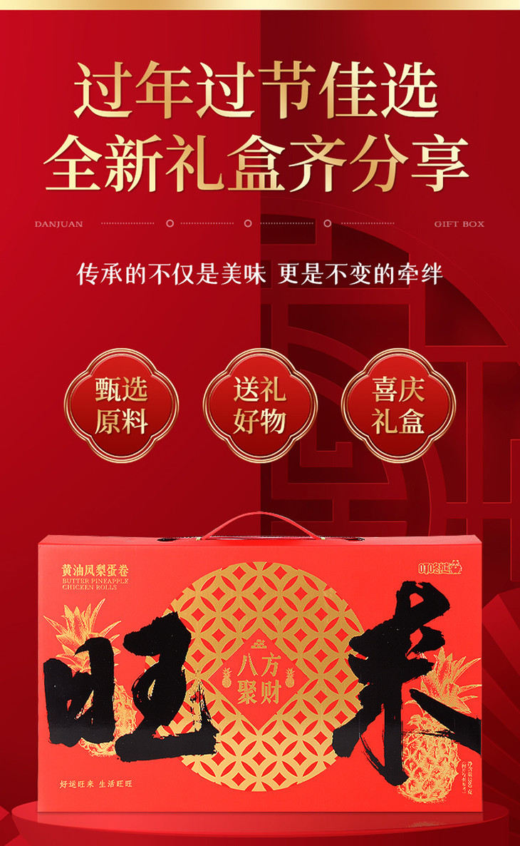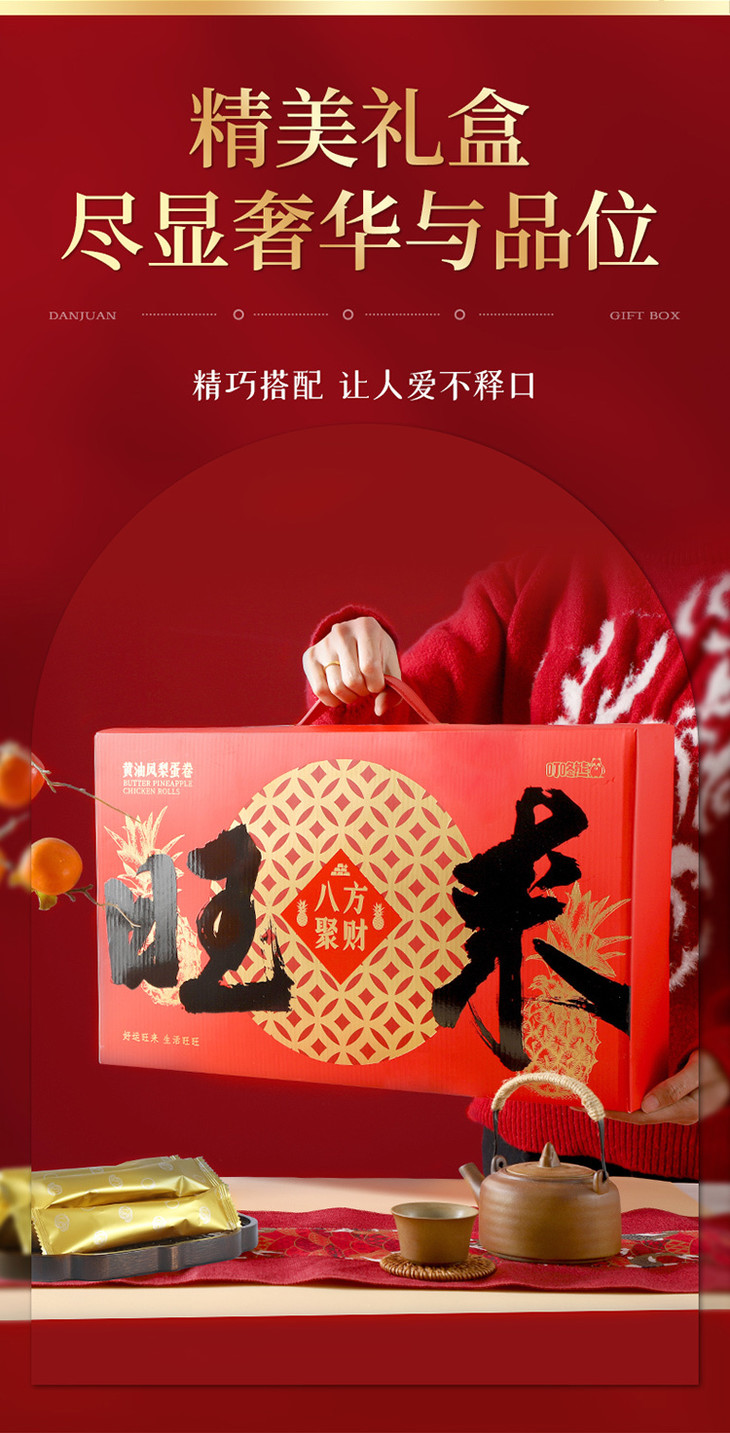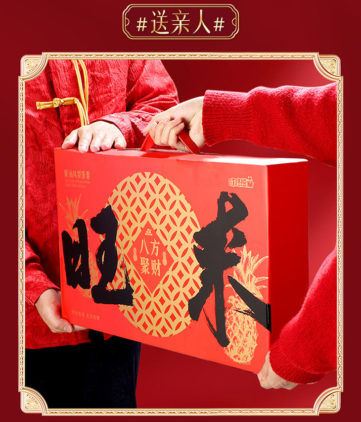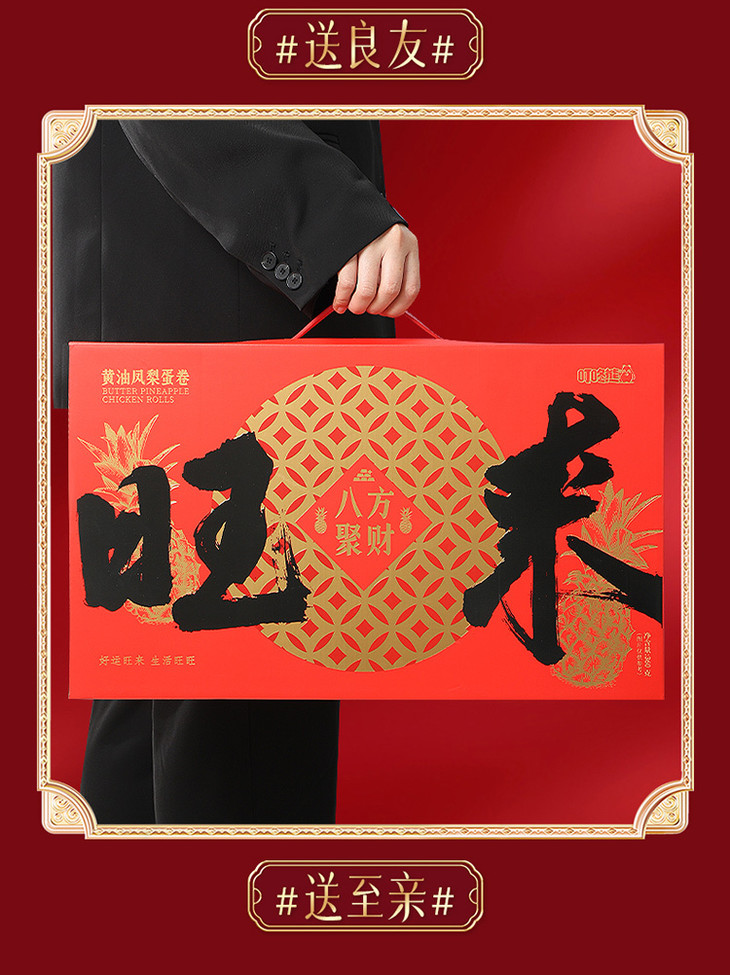 1.叮咚熊独创字体书写,以中国国粹为“根”,再套上超有烟火气的闽南文化为“壳”,最后加上传统手工美食文化,这三味一搅和,那“年味”嗖一下就出来了! 2.金属皮质手提 贵气!!!拿着有档次!! 3.整提提起来老大一份,尺寸约有500*85*300mm超霸气‼ 4.带着美好寓意送礼~ 家旺兴旺财运旺💫 人旺气旺身体旺 ✨ 财旺福旺运道旺 💫 5.绵密的黄油烘焙出来的浓郁奶香融合鲜嫩鸡蛋,醇香四溢那香气缓缓入鼻再滑入喉间,甜美诱人😍