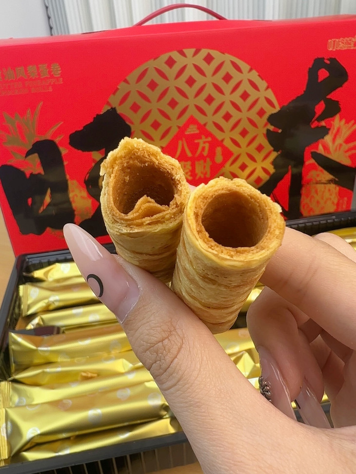 从打开包装香气飘出来的那一刻, 就决定是否能瞬间勾起食欲😋😋 作为食品人了解真正能够引人垂馋的香气只有来自天然的优质原料, 🍍🍍旺来凤梨酥只选精品黄油与健康农场散养鸡蛋 🧈🥚黄油与鸡蛋,一对天作之合的cp 绵密的黄油烘焙出来的浓郁奶香融合鲜嫩鸡蛋,醇香四溢那香气缓缓入鼻再滑入喉间,甜美诱人💥。 一口咬下,层层蛋卷皮在齿尖“噼啪”开裂 咀嚼间可以感受到脆里带酥💫 细末酥皮都无需细嚼就融化在味蕾, 像似咬了一口酥脆的冰淇淋☘ 一口倾心。