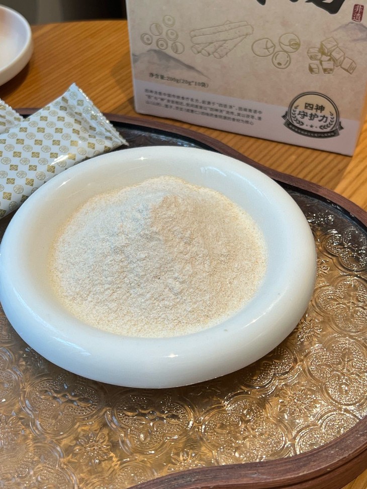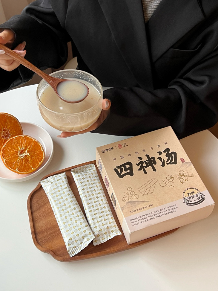 喝法非常简单~和吃藕粉有点像 1️⃣将1-2袋四神汤倒入杯子或者碗中 2️⃣加入少量温水或凉水调匀 3️⃣在加入适量沸水搅拌至全部溶解,得到一碗糊状的四神汤~ 💖可以根据个人喜好加入糖、蜂蜜或者盐调味,或加入鲜奶一起食用!