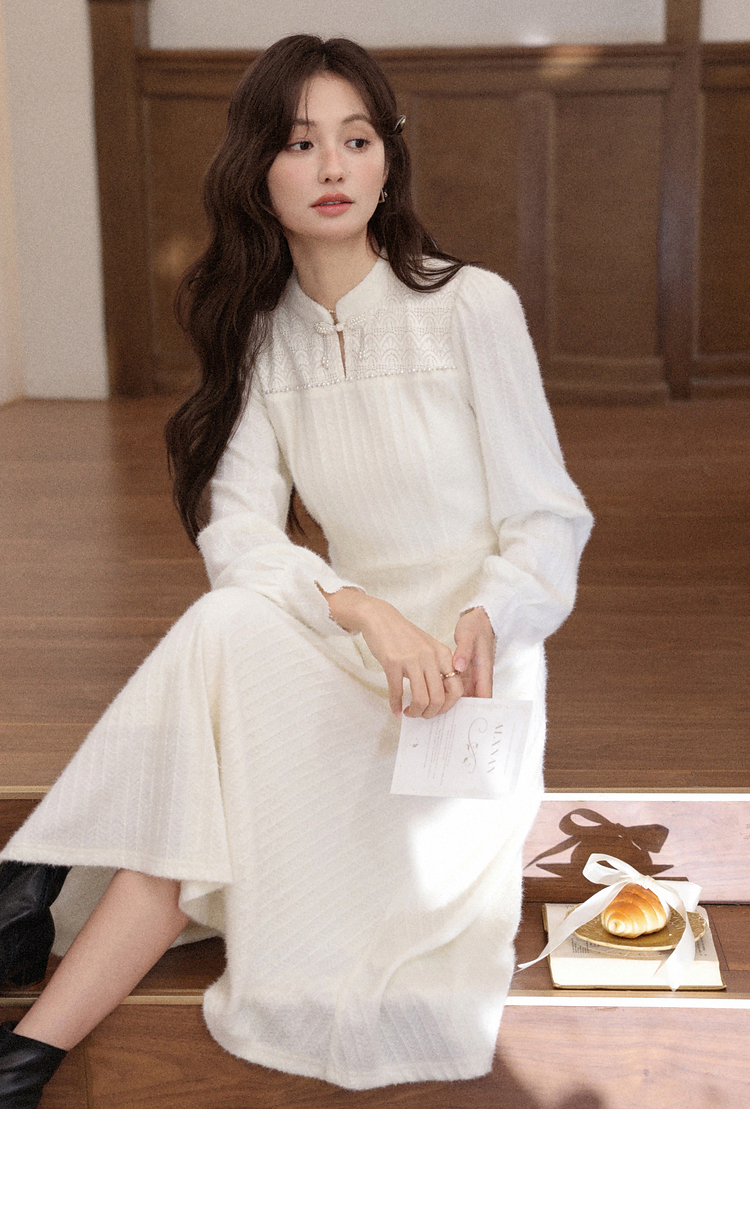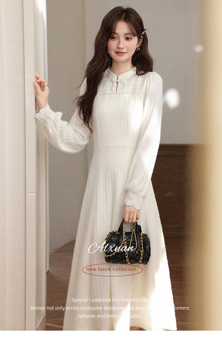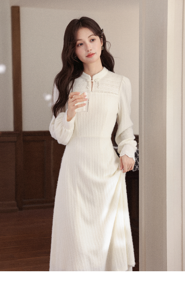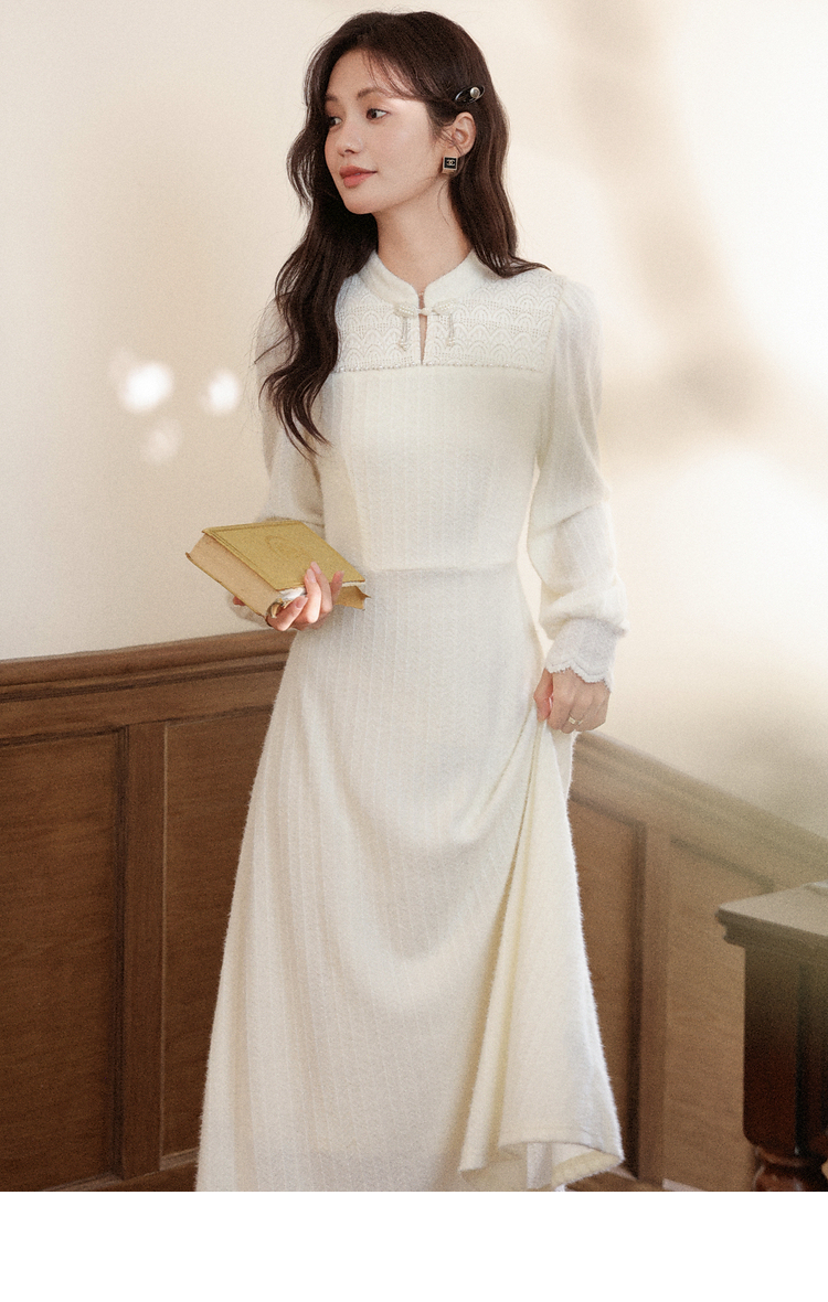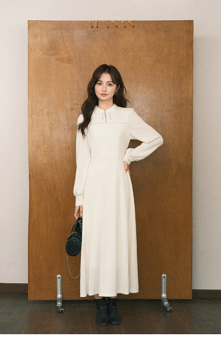 鹿向南「白鹭暖空」新中式国风长袖连衣裙女秋冬复古米杏色长裙