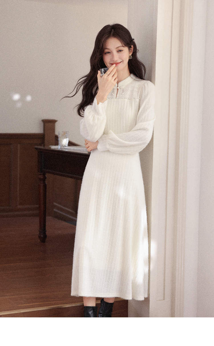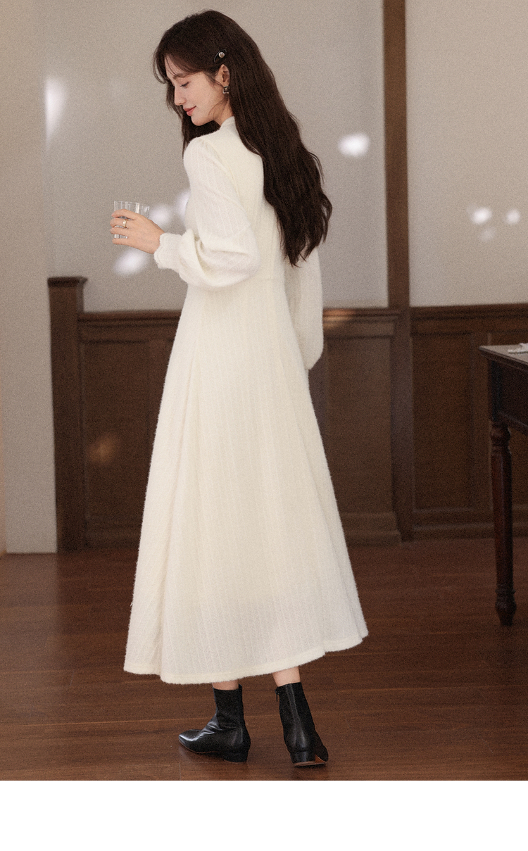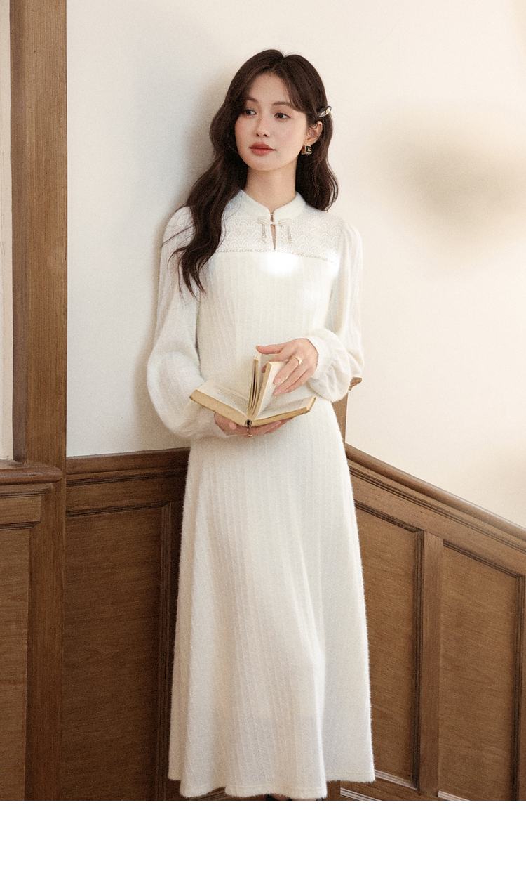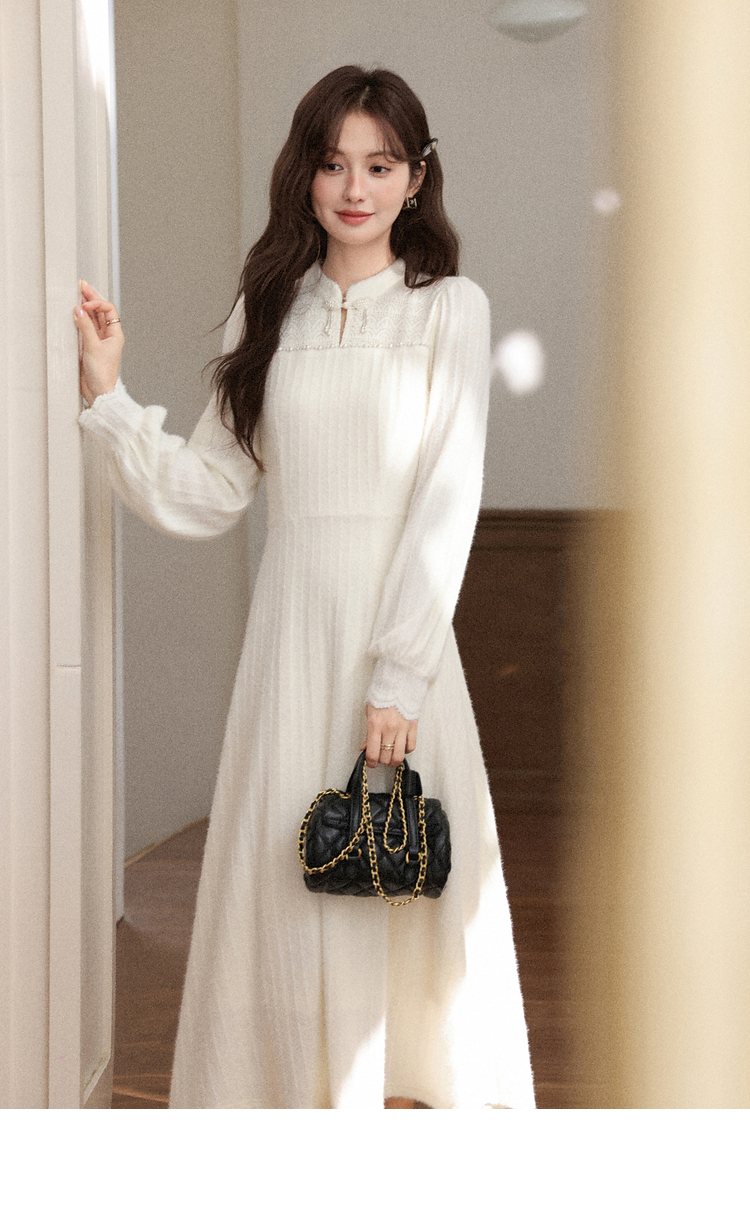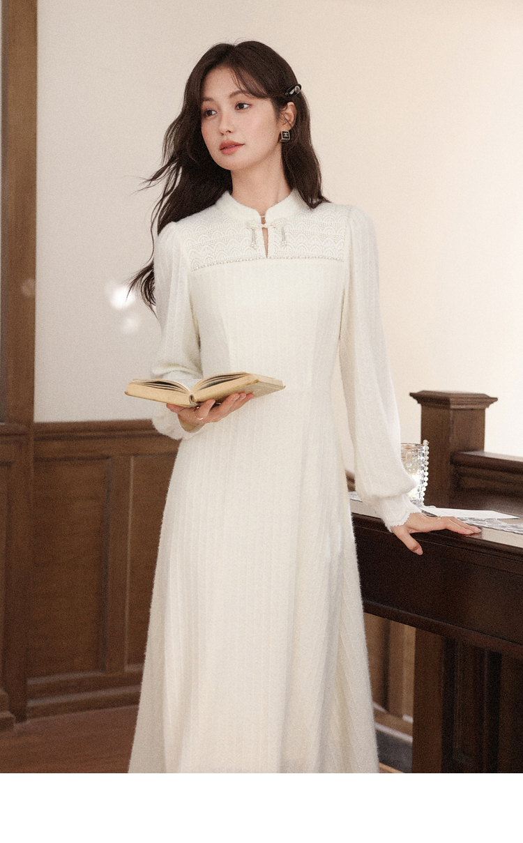 鹿向南「白鹭暖空」新中式国风长袖连衣裙女秋冬复古米杏色长裙