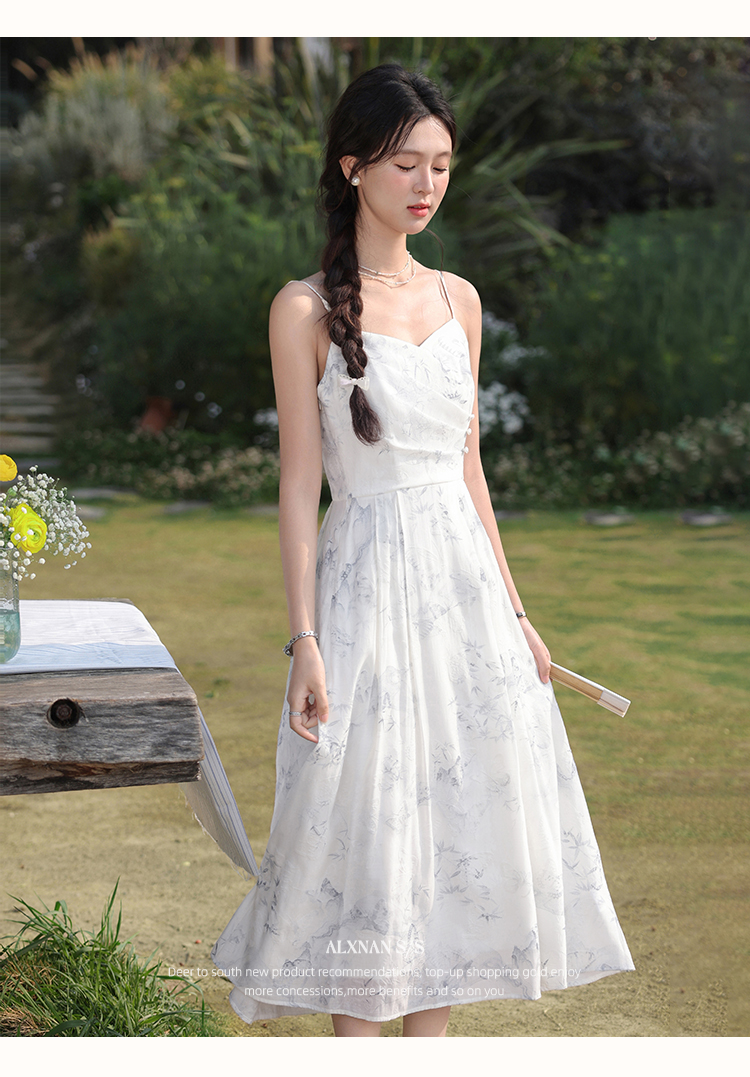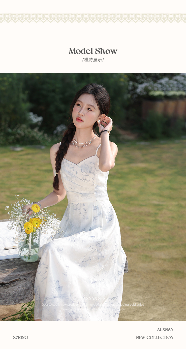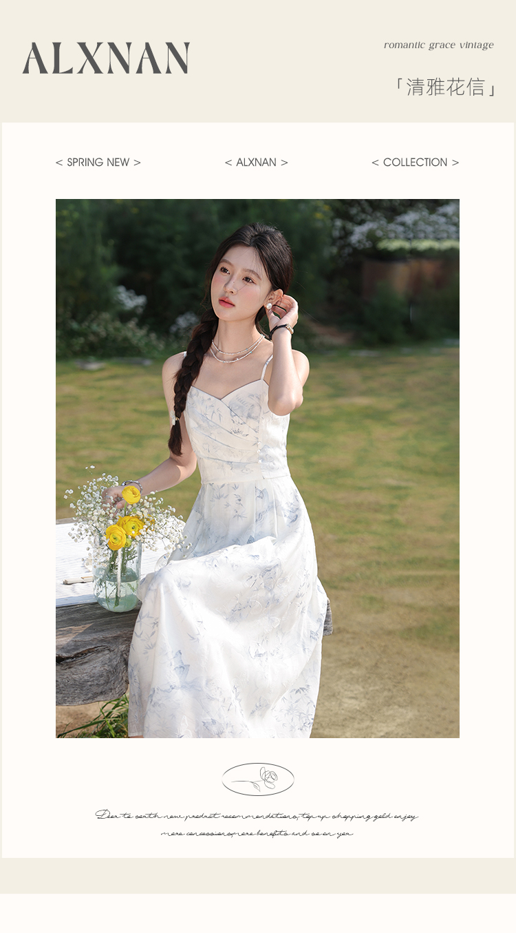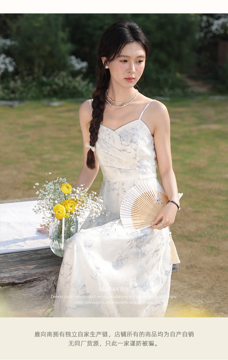 鹿向南 「清雅花信」法式复古碎花女吊带连衣裙夏季新款度假风长裙