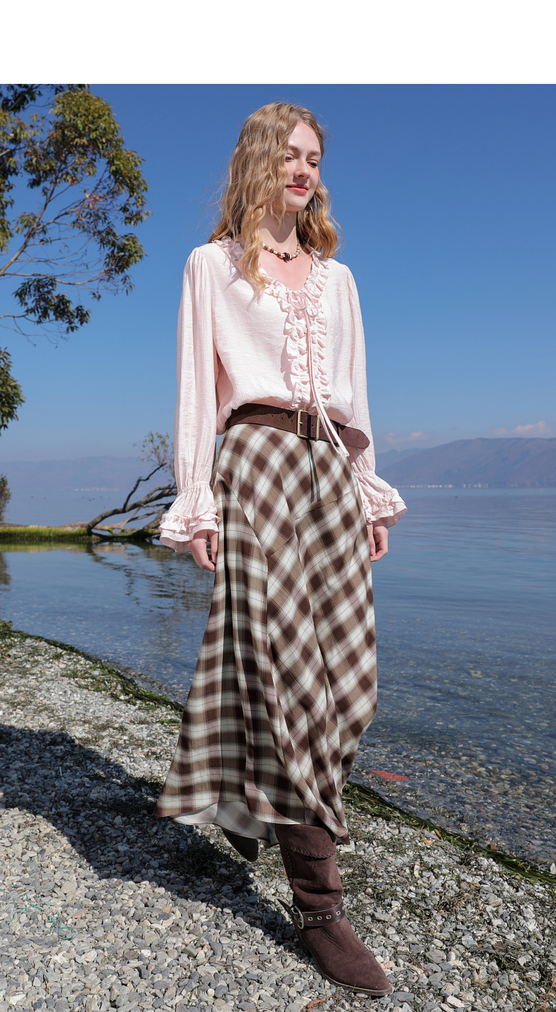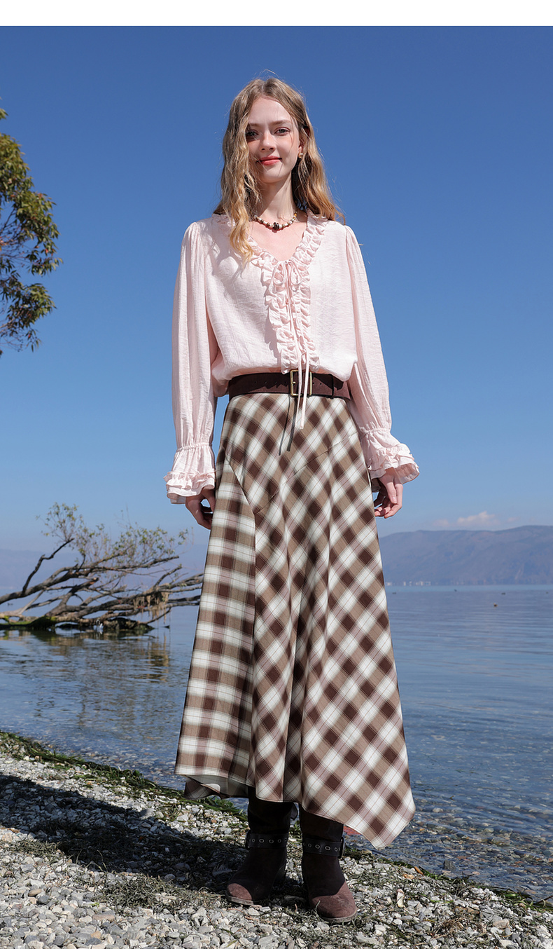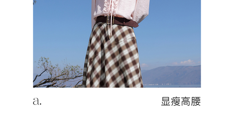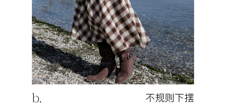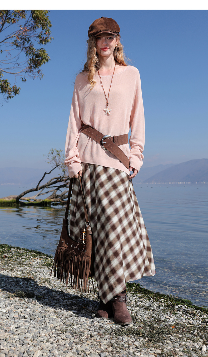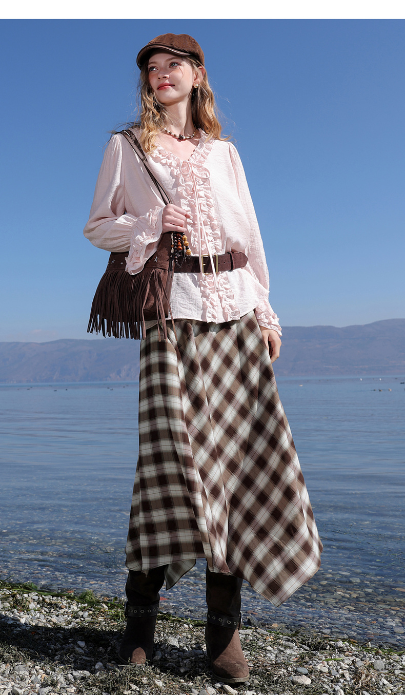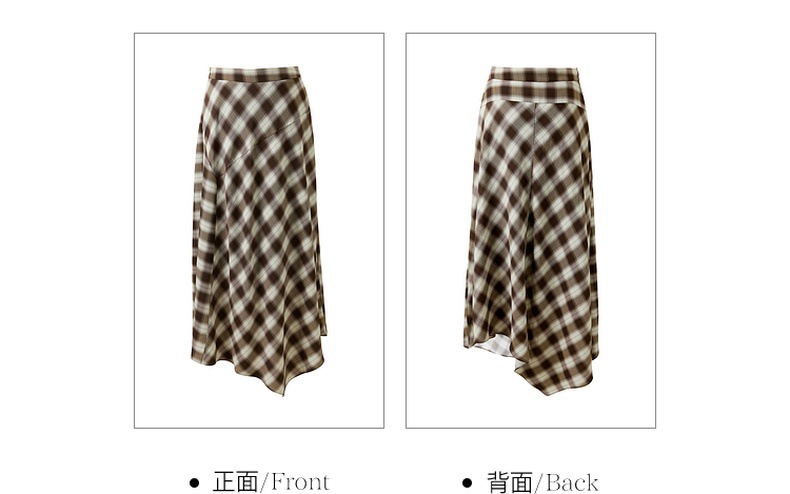 三彩2026春季新款格纹半身裙高腰不规则A字裙长裙游牧风M