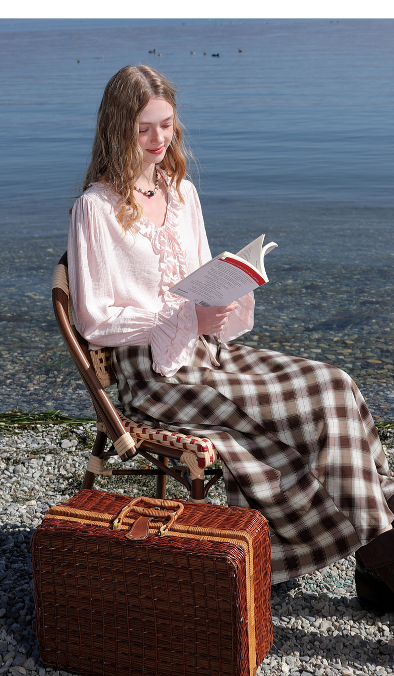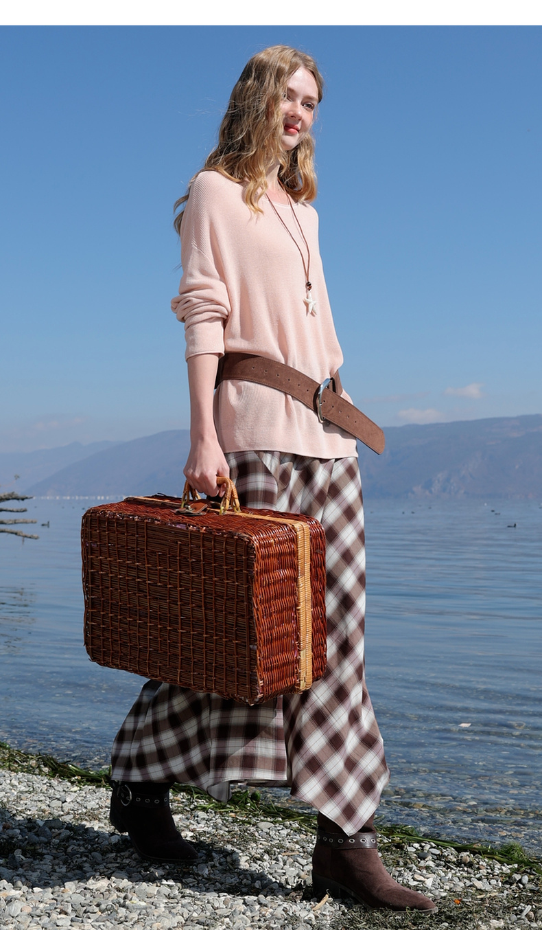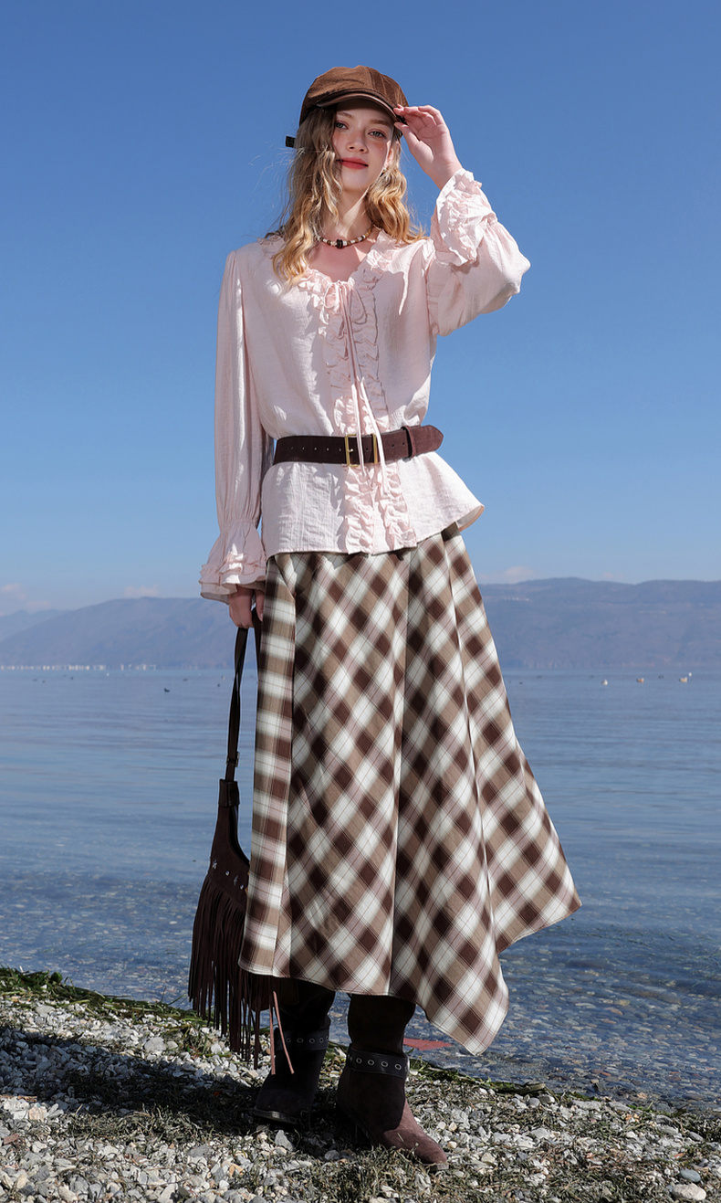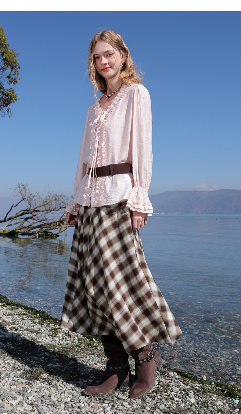 三彩2026春季新款格纹半身裙高腰不规则A字裙长裙游牧风M